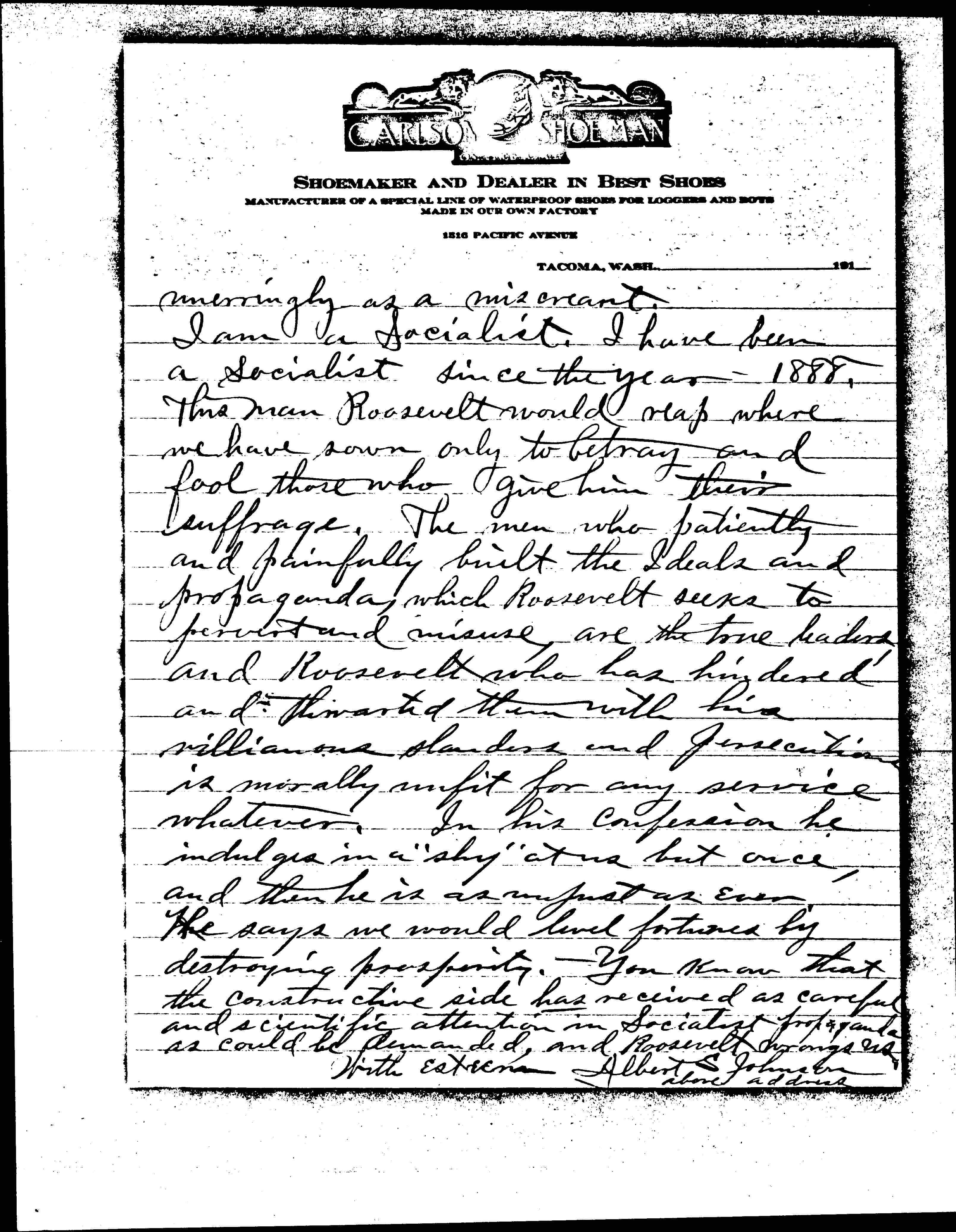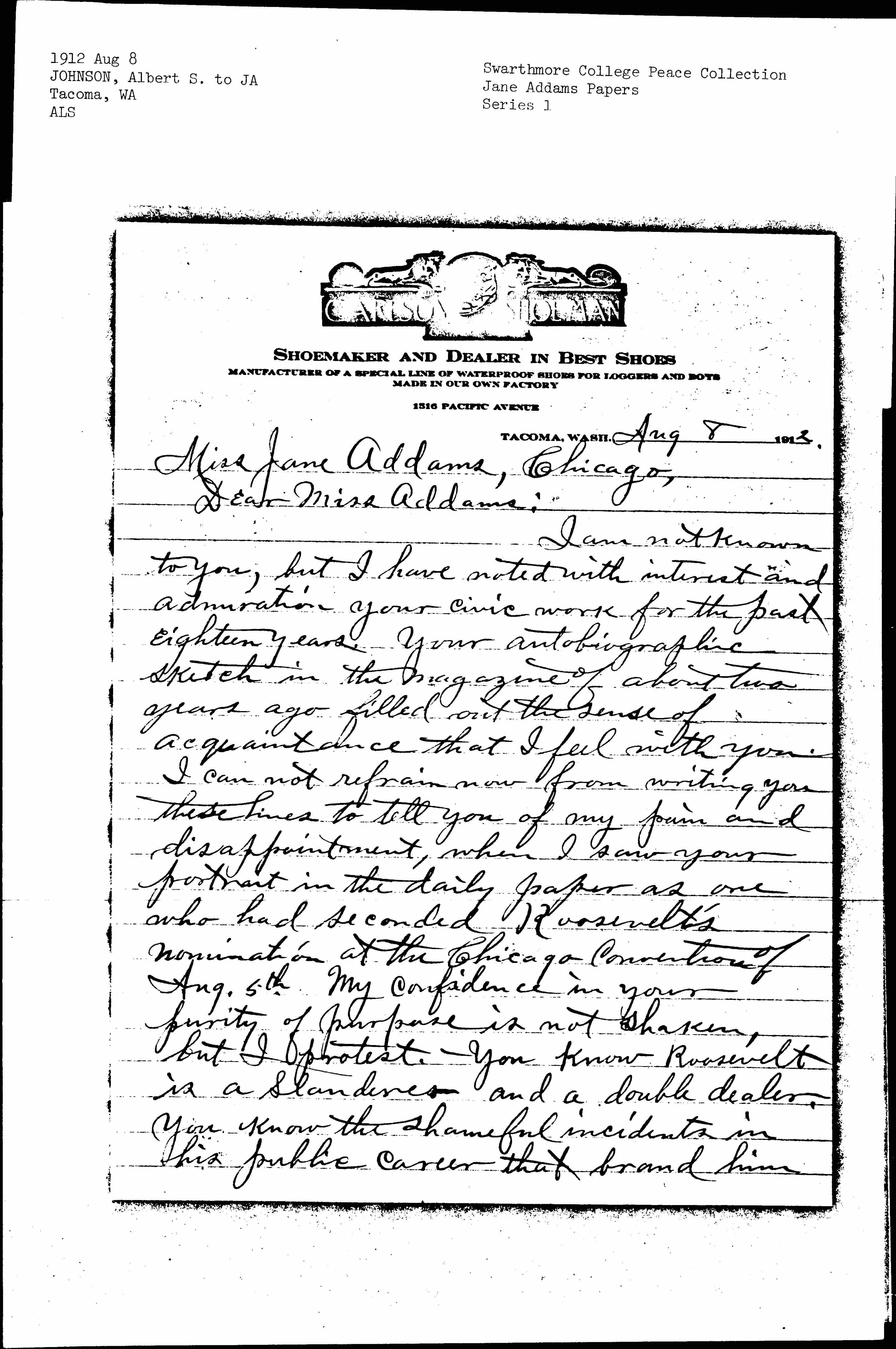 I am not known to you, but I have noted with interest and admiration your civic work for the past eighteen years. Your autobiographic sketch in the magazine of about two years ago filled out the sense of acquaintance that I feel with you. I cannot refrain now from writing you these lines to tell you of my pain and disappointment, when I saw your portrait in the daily paper as one who had seconded Roosevelt's nomination at the Chicago Convention of Aug. 5th. My confidence in your purity of purpose is not shaken, but I protest. You know Roosevelt is a slanderer and a double dealer, you know the shameful incidents in his public career that brand him [page 2] unerringly as a miscreant.
