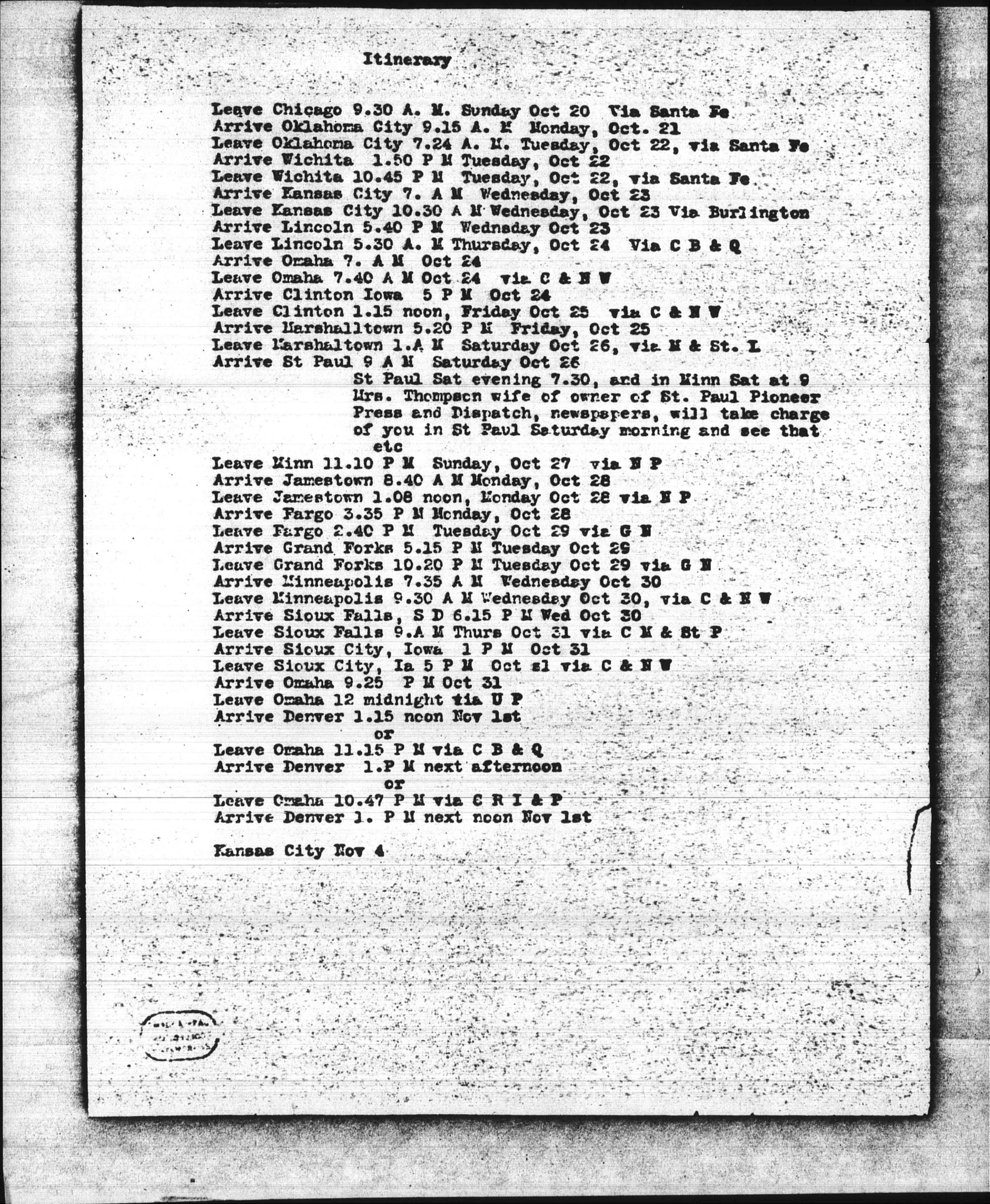 Leave Minneapolis 9.30 AM Wednesday Oct 30, via C & N W