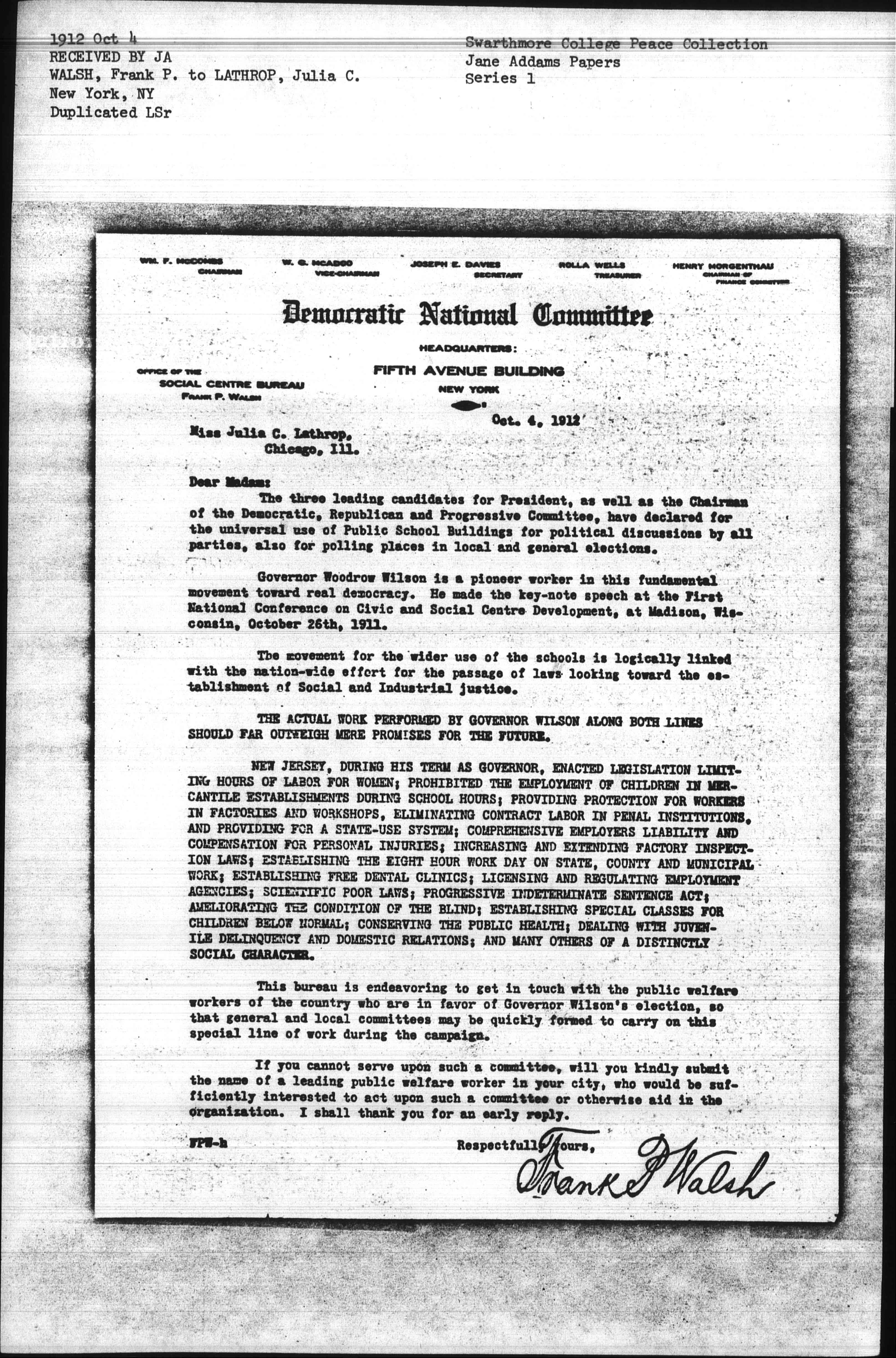 This bureau is endeavoring to get in touch with the public welfare workers of the country who are in favor of Governor Wilson's election, so that general and local committees may be quickly formed to carry on this special line of work during the campaign.