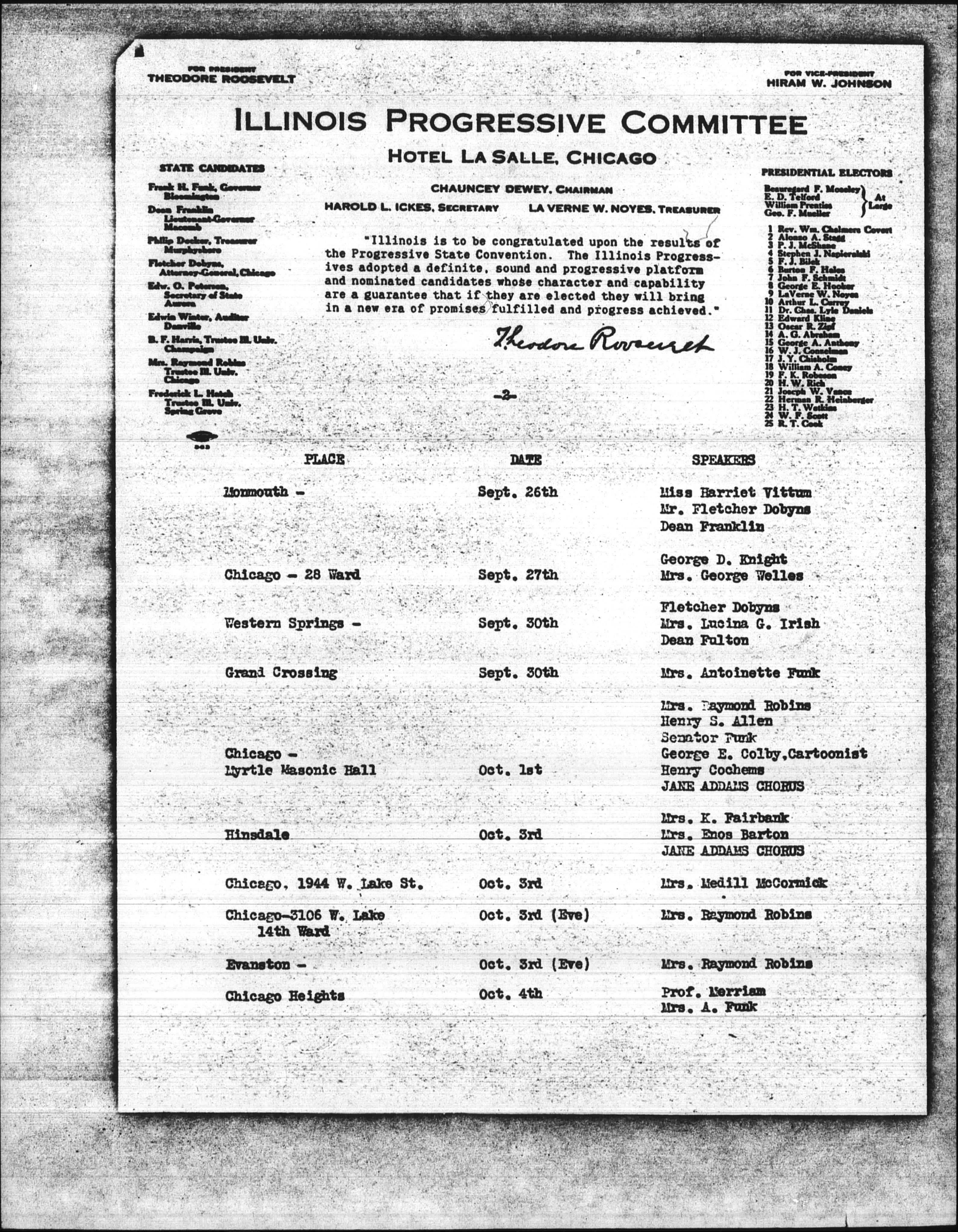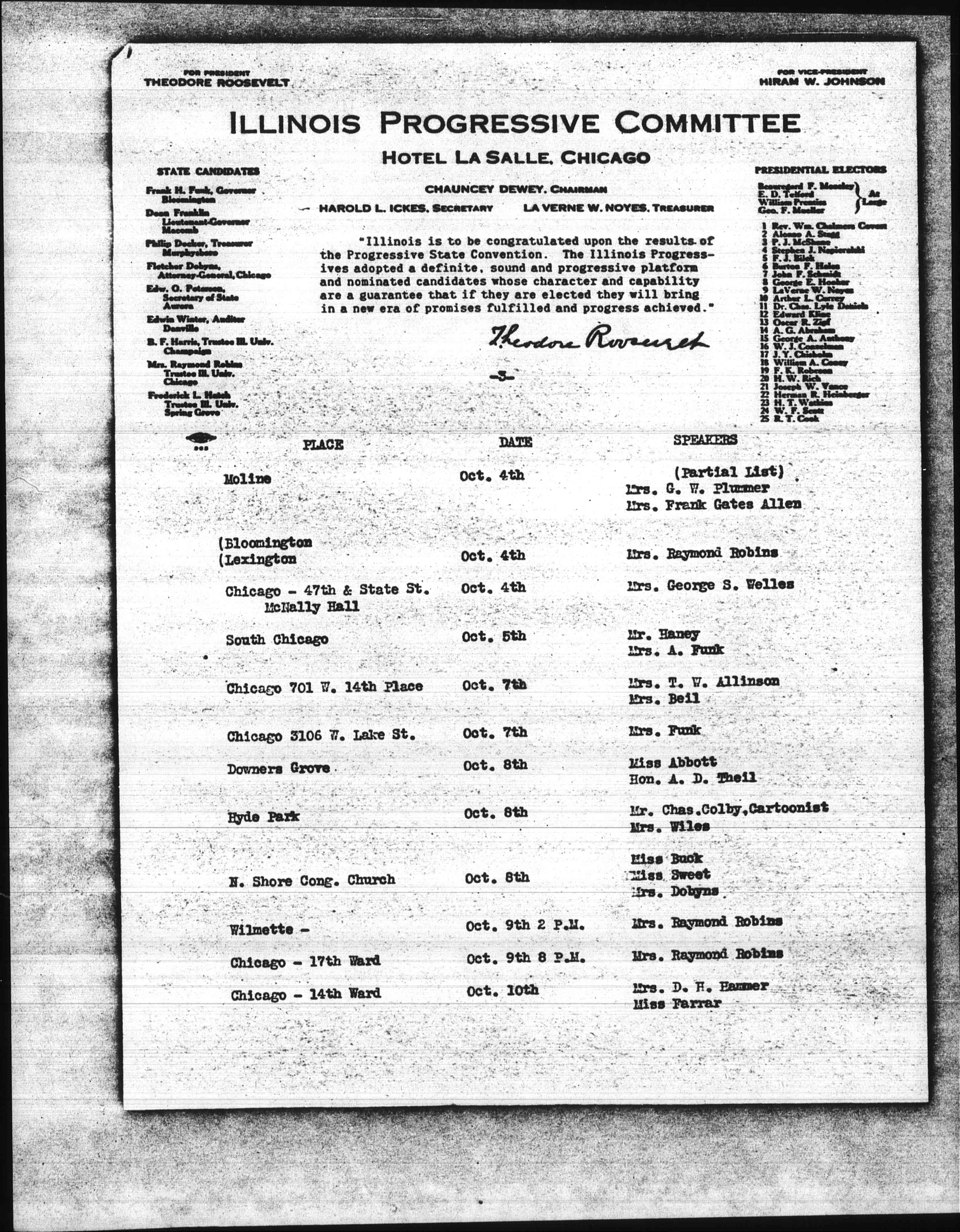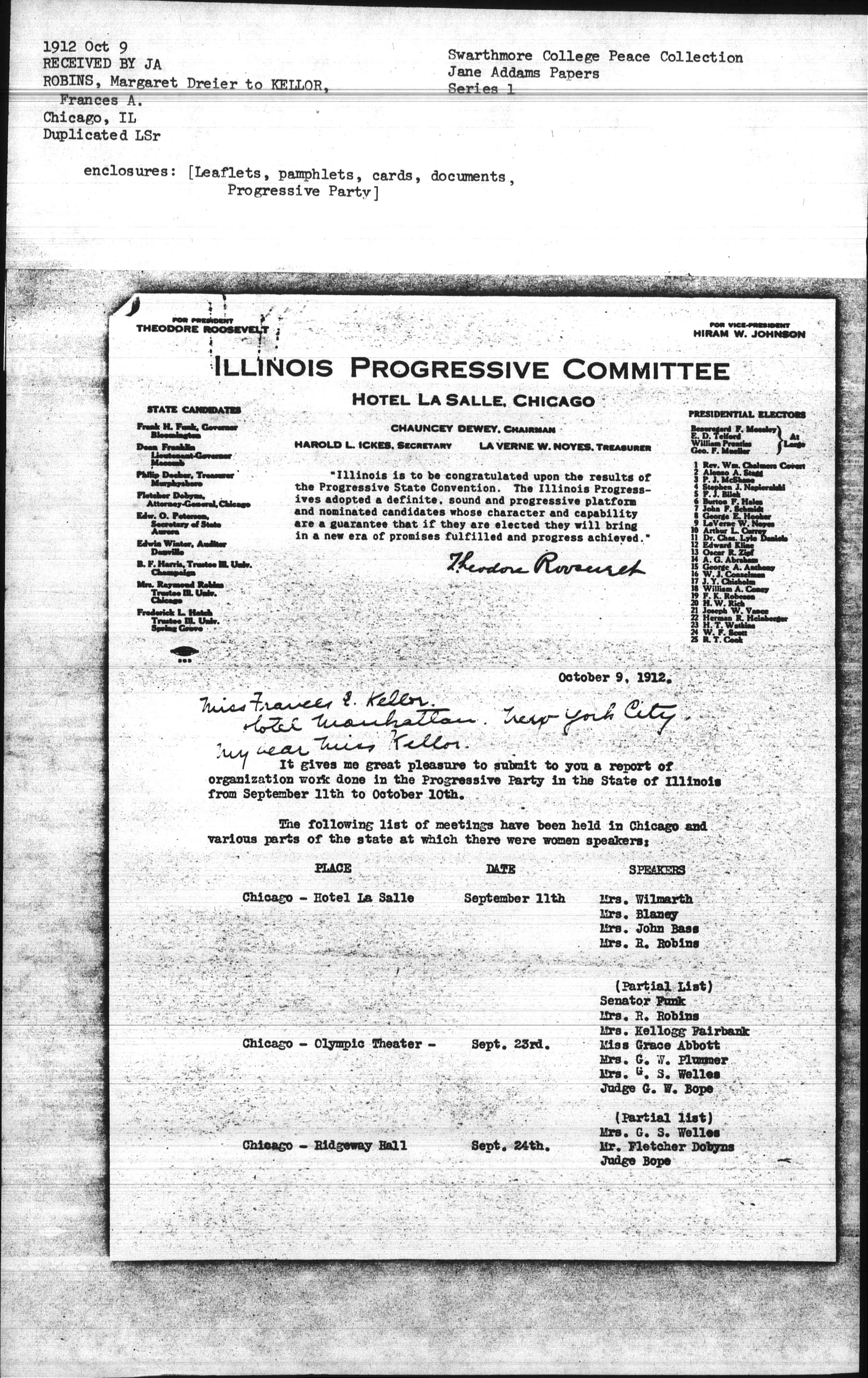 It gives me great pleasure to submit to you a report of organization work done in the Progressive Party in the State of Illinois from September 11th to October 10th.
