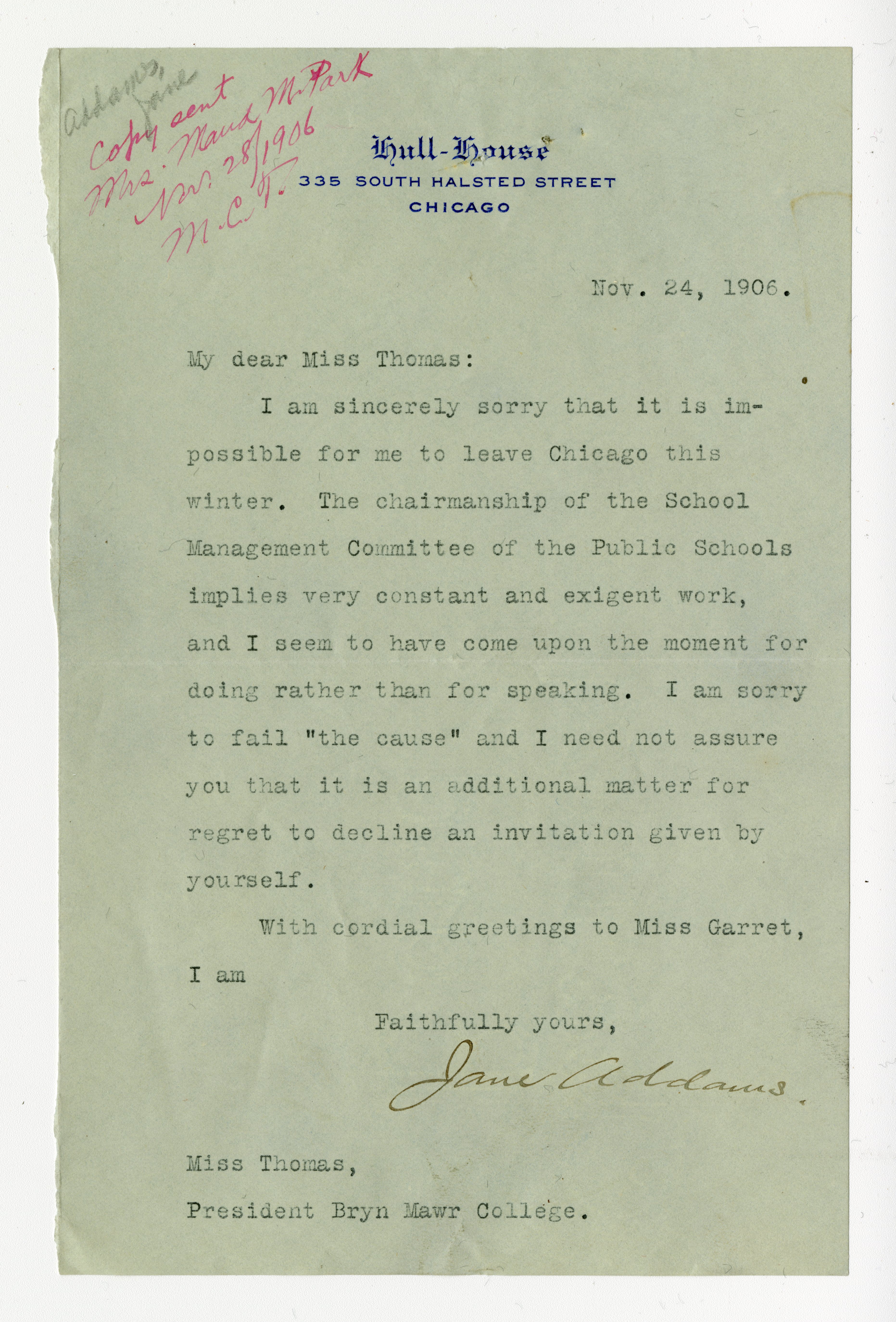 Jane Addams. [signed]