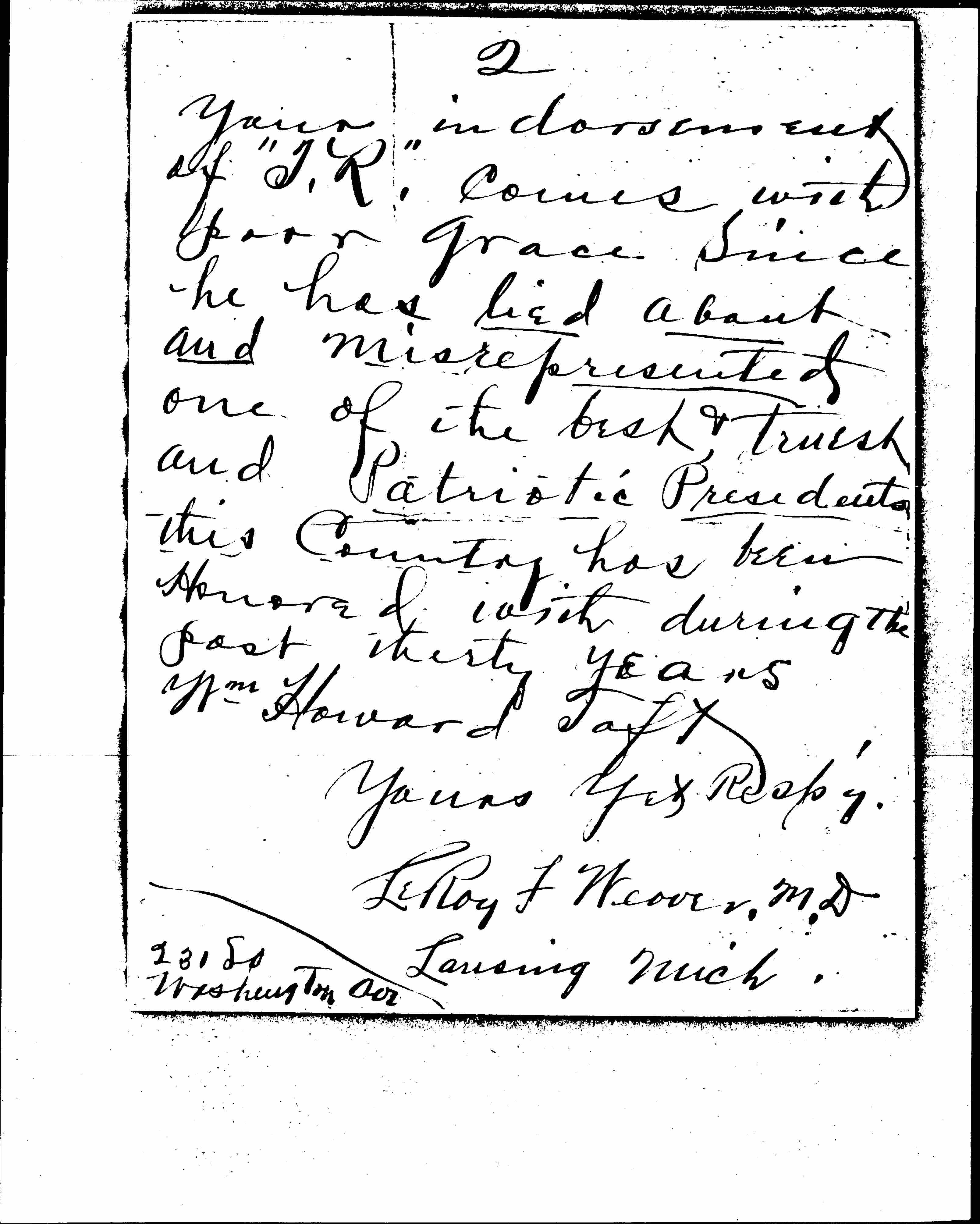 You are an intelligent woman and I want to remind you that [page 2] your [endorsement] of "T. R." comes with poor grace since he has lied about and misrepresented one of the best, & truest and Patriotic Presidents this Country has been Honored with during the past thirty years Wm Howard Taft.