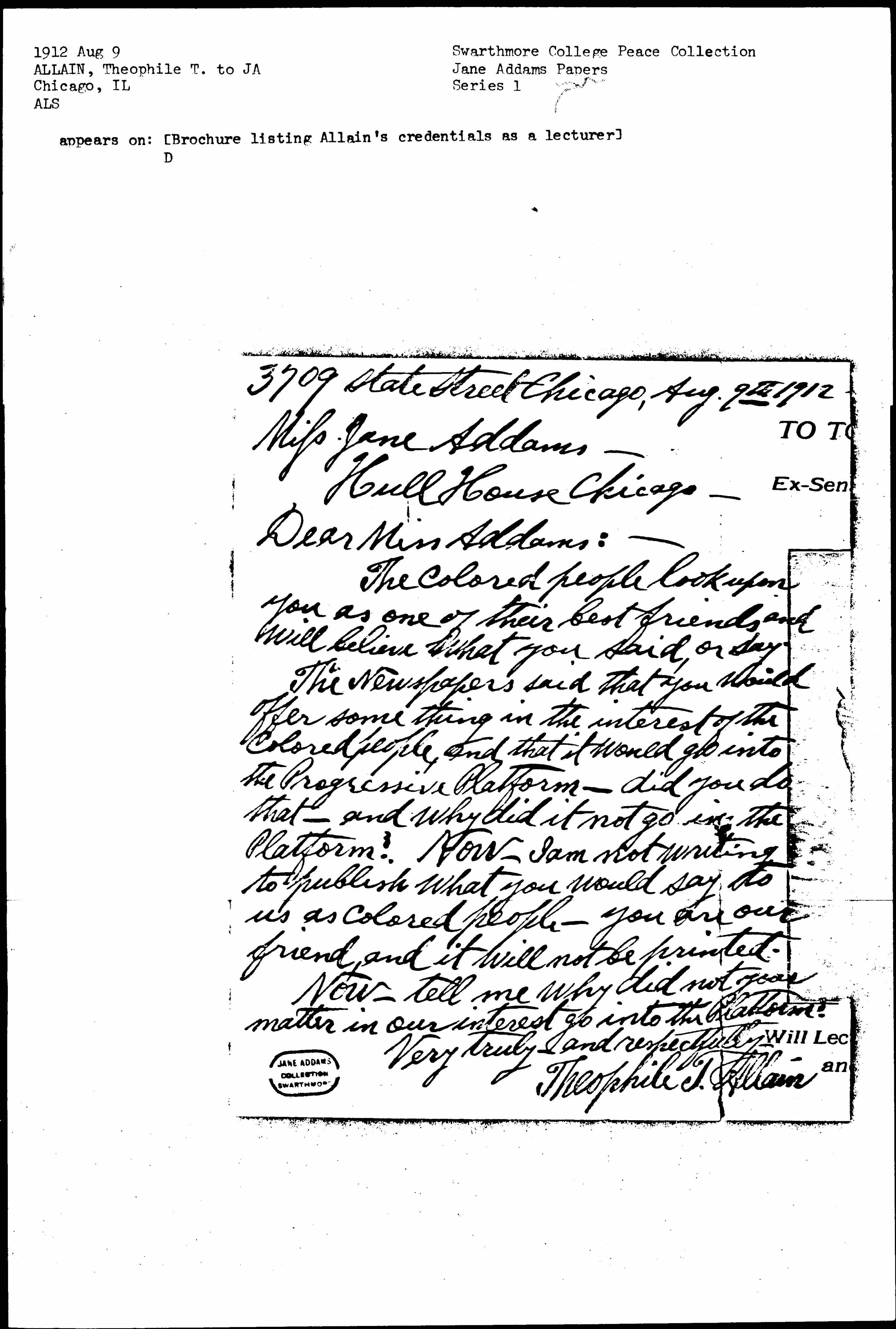 The Newspapers said that you would offer some thing in the interest of the colored people, and that it would go into the Progressive Platform -- did you do that -- and why did it not go in the Platform? Now -- I am not writing to publish what you would say to us as colored people -- you are our friend, and it will not be printed.