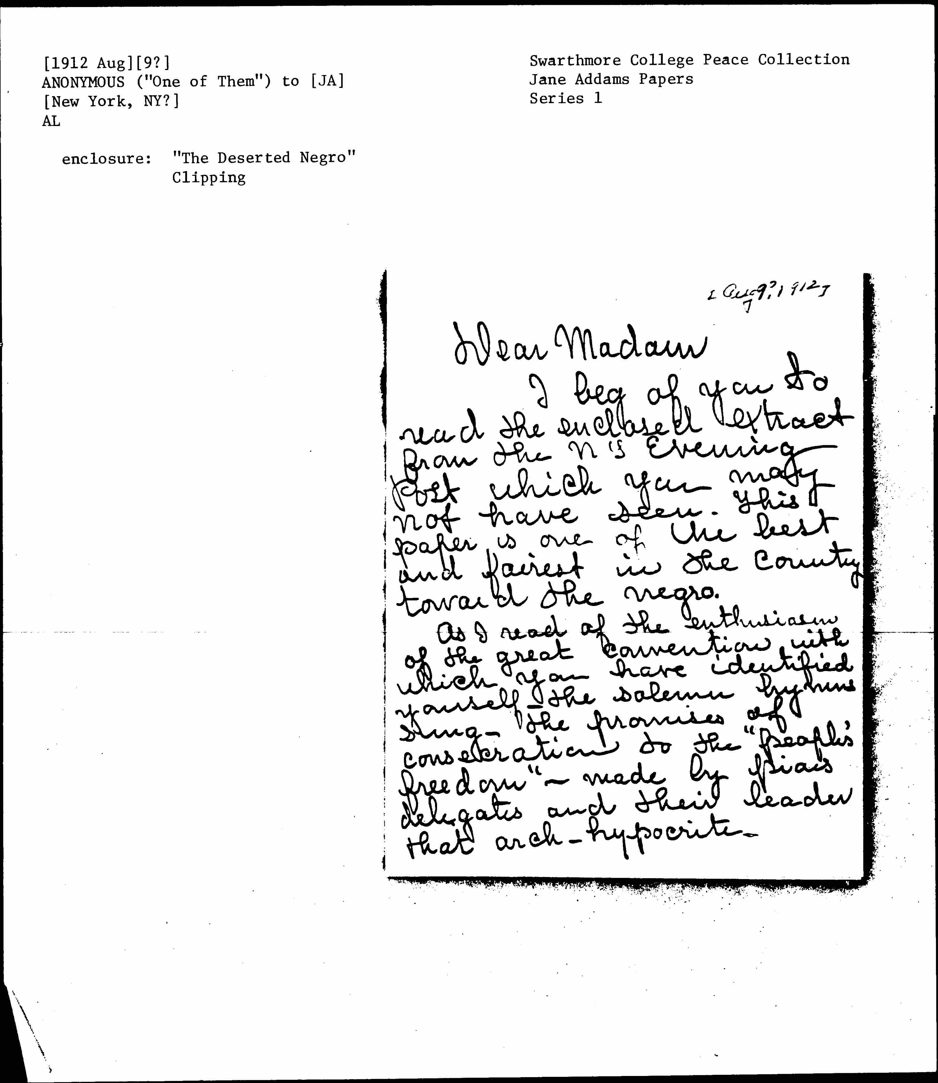 I beg of you to read the enclosed extract from the NY Evening Post which you may not have seen. This paper is one of the best and fairest in the country toward the negro.