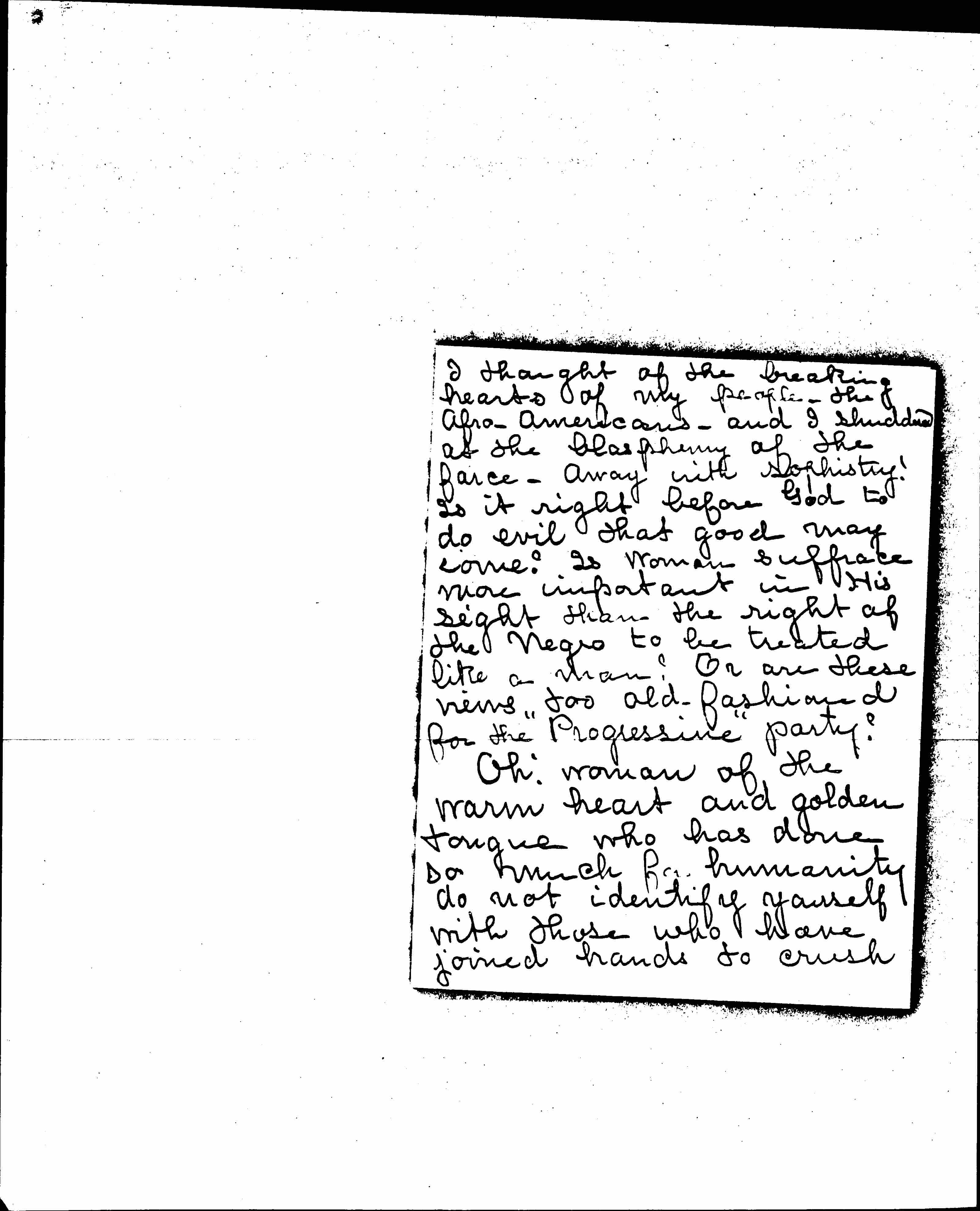 I thought of the breaking hearts of my people -- the Afro-Americans -- and I shuddered at the blasphemy of the farce. Away with sophistry! Is it right before God to do evil that good may come? Is woman [suffrage] more important in His sight than the right of the Negro to be treated like a man? Or are these views too old-fashioned for the "Progressive" Party?