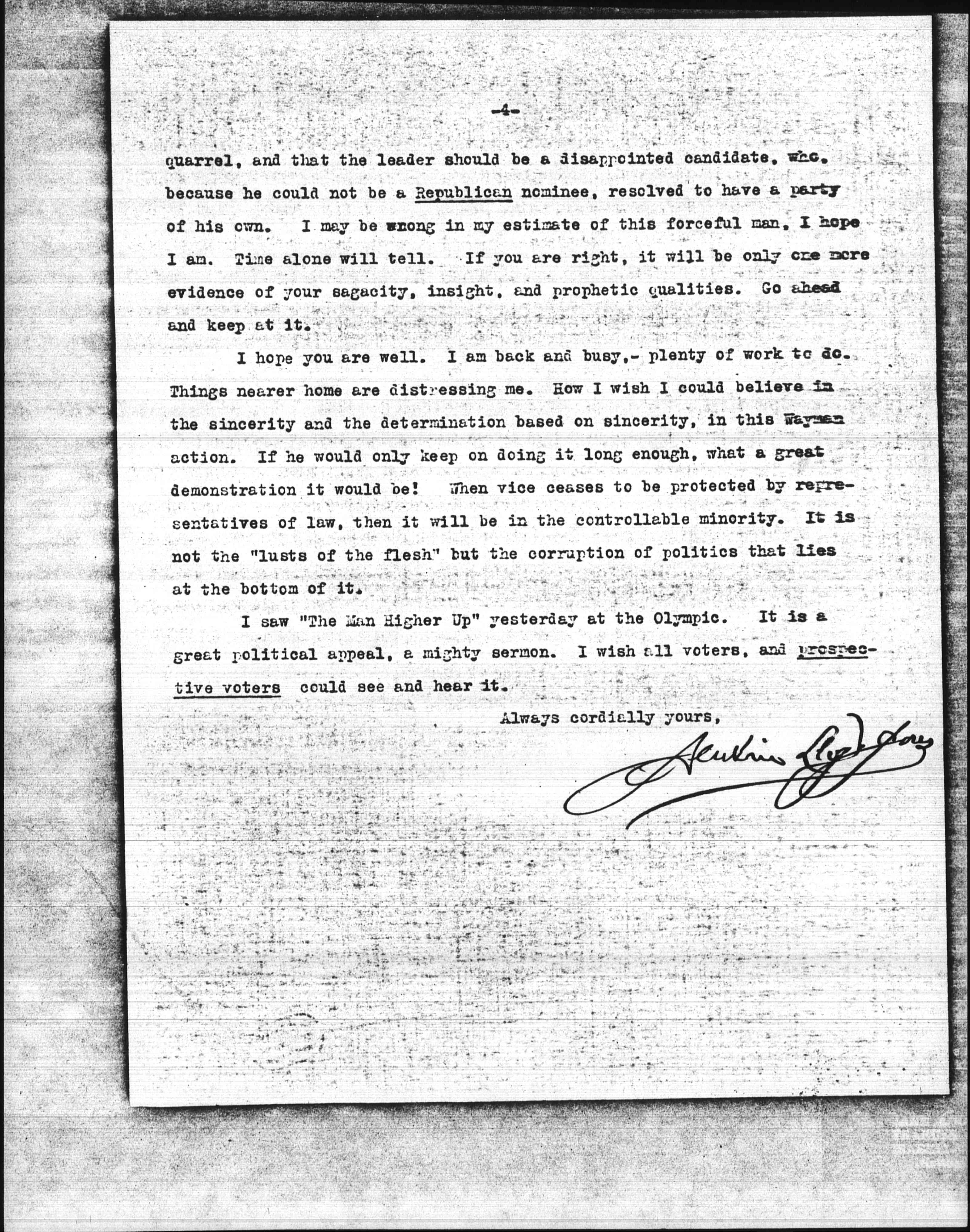I do not know why I should write all this to you, except that one confidence deserves another. I am as anxious that we should understand one another as you can be, for you can hardly realize how precious fellowship is to me on these high lines. Even you with all your bundle of social heresies are not so isolated as one who can add to this arraignment of anathemas, the more lurid anathemas of theological heresies. I guess after all, the main point of difference is in our estimate of the man. I have not been outdone by any of you in my clamor for a Third Party. I have been calling for it for twenty-five years, and I welcome it, and every chance I can have I am going to climb into its wagon, but I am sorry it should have been born out of a party-convention [page 4] quarrel, and that the leader should be a disappointed candidate, who, because he could not be a Republican nominee, resolved to have a party of his own. I may be wrong in my estimate of this forceful man. I hope I am. Time alone will tell. If you are right, it will be only one more evidence of your sagacity, insight, and prophetic qualities. Go ahead and keep at it.