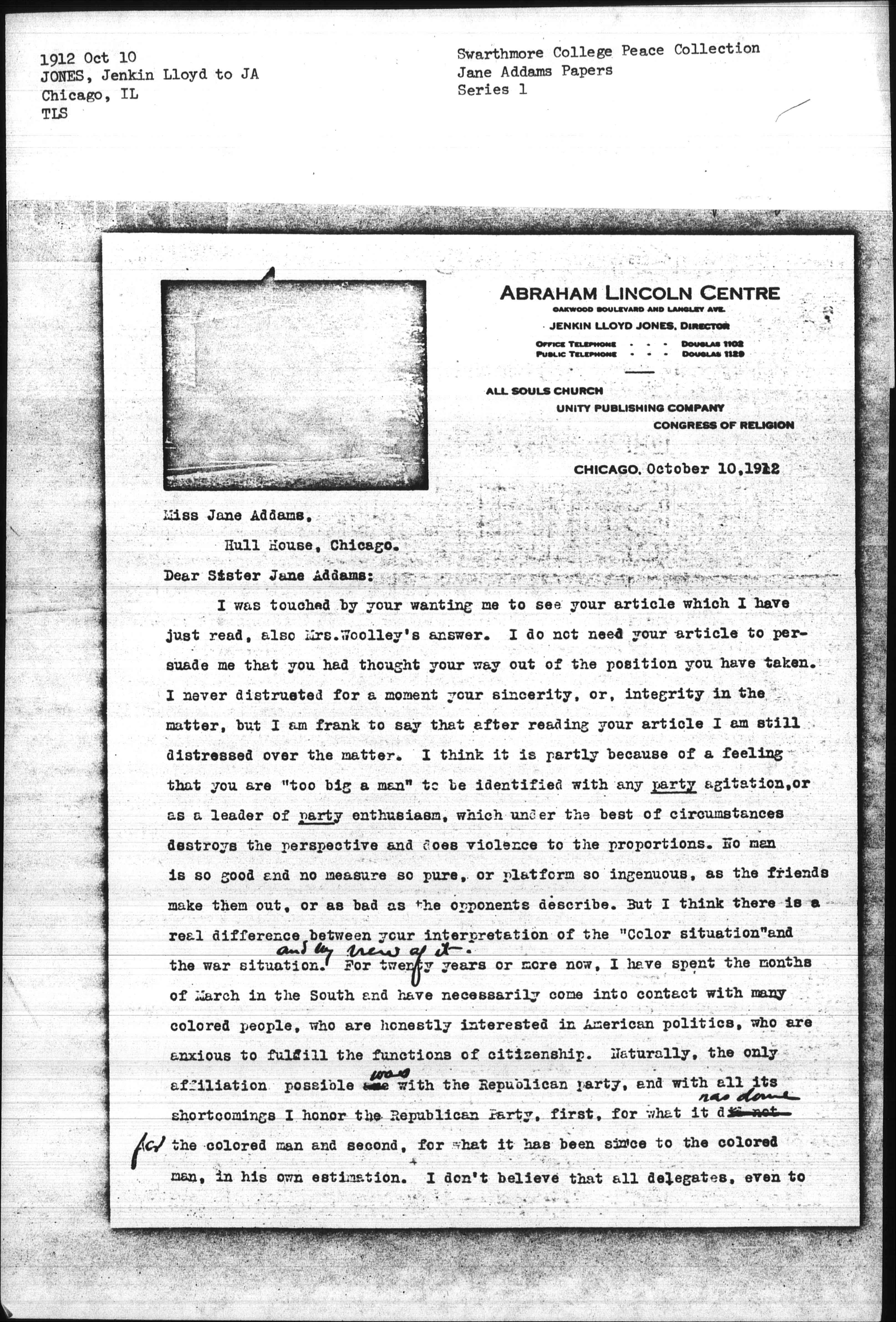 I was touched by your wanting me to see your article which I have just read, also Mrs. Woolley's answer. I do not need your article to persuade me that you had thought your way out of the position you have taken. I never distrusted for a moment your sincerity, or, integrity in the matter, but I am frank to say that after reading your article I am still distressed over the matter. I think it is partly because of a feeling that you are "too big a man" to be identified with any party agitation, or as a leader of party enthusiasm, which under the best of circumstances destroys the perspective and does violence to the proportions. No man is so good and no measure so pure, or platform so ingenuous, as the friends make them out, or as bad as the opponents describe. But I think there is a real difference between your interpretation of the "Color situation" and the war situation. <and my view of it.> For twenty years or more now, I have spent the months of March in the South and have necessarily come into contact with many colored people, who are honestly interested in American politics, who are anxious to fulfill the functions of citizenship. Naturally, the only affiliation possible <was> with the Republican party, first, for what it did not <has done for> the colored man and second, for what it has been since to the colored man, in his own estimation. I don't believe that all delegates, even to [page 2] Republican Conventions, were viciously appointed, and I cannot see any justification for a would-be Progressive either in platform or otherwise, to suggest the old sectional line, the obliteration of which cost so much to nation and individuals. We cannot interpret motives, we must not impugn witnesses, but we cannot evade the national responsibility of the negro problem.