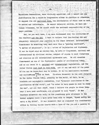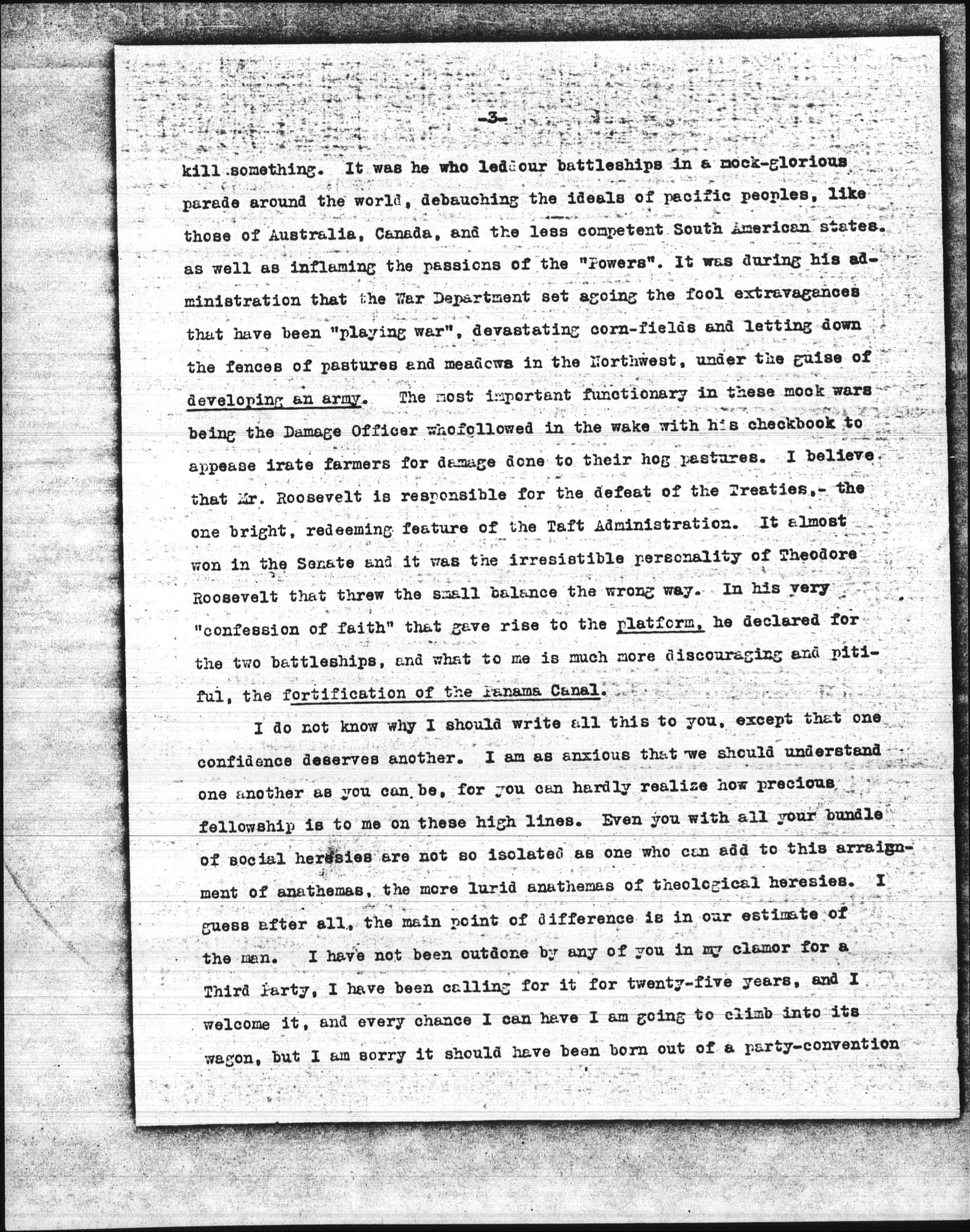 But, as you well know, I am more distressed over the militarism of the Platform and the Man. I want to believe that Mrs. Woolley did not adequately interpret your position on the Peace movement. International disarmament is something very much more than a "growing sentiment", "a matter of education", -- it is a matter of legislation and diplomacy. It can be wiped away as slavery was, by acts of Congresses, national and international by civilized states, subject of course to such violations and evasions as all international agreements are. We all consider disarmament as one of the fundamental quests of civilization today, and we can reach it by national and international legislation, and the United States must lead in this work. And it can and will if the power of the man on horse-back can be broken. It is the sentimental warriors and warrioresses <that> hold us back. Theodore Roosevelt is the arch champion in the United States today, possibly in the world, of that, to me obsolete and unprophetic contention, that "armament contributes to the pacification of the world", and "in order to have peace we must be ready for war", and all that stuff, which I believe the people in whose judgment I have most confidence, are prepared to call "bosh". It was Theodore Roosevelt who early in his presidency gave utterance to the brutal epigram which I have never been able to forget, "Speak softly but carry a Big Stick". It was Roosevelt that so cheapened the Presidential office by filling boyish hearts with a love of the gun and a passion to [page 3] kill something. It was he who led our battleships in a mock-glorious parade around the world, debauching the ideals of pacific people, like those of Australia, Canada, and the less competent South American states, as well as inflaming the passions of the "Powers". It was during his administration that the War Department set agoing the fool extravagances that have been "playing war", devastating [cornfields] and letting down the fences of pastures and meadows in the Northwest, under the guise of developing an army. The most important functionary in these mock wars being the Damage Officer who followed in the wake with his checkbook to appease irate farmers for damage done to their hog pastures. I believe that Mr. Roosevelt is responsible for the defeat of the Treaties, -- the one bright, redeeming feature of the Taft Administration. It almost won in the Senate and it was the irresistible personality of Theodore Roosevelt that threw the small balance the wrong way. In his very "confession of faith" that gave rise to the platform, he declared for the two battleships, and what to me is much more discouraging and pitiful, the fortification of the Panama Canal.