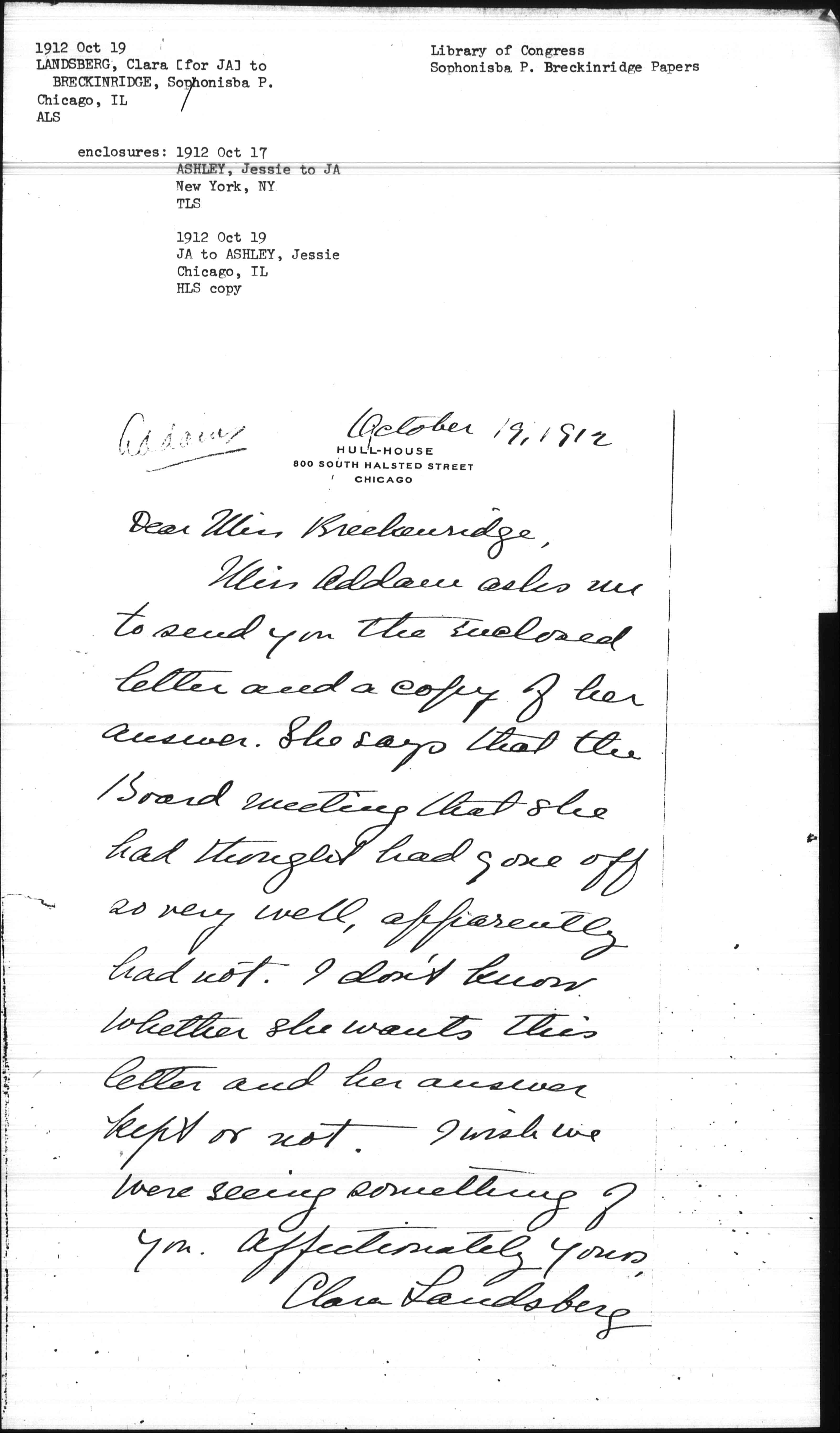 Miss Addams asks me to send you the enclosed letter and a copy of her answer. She says that the Board meeting that she had thought had gone off so very well, apparently had not. I don't know whether she wants this letter and her answer kept or not. I wish we were seeing something of you. Affectionately yours,