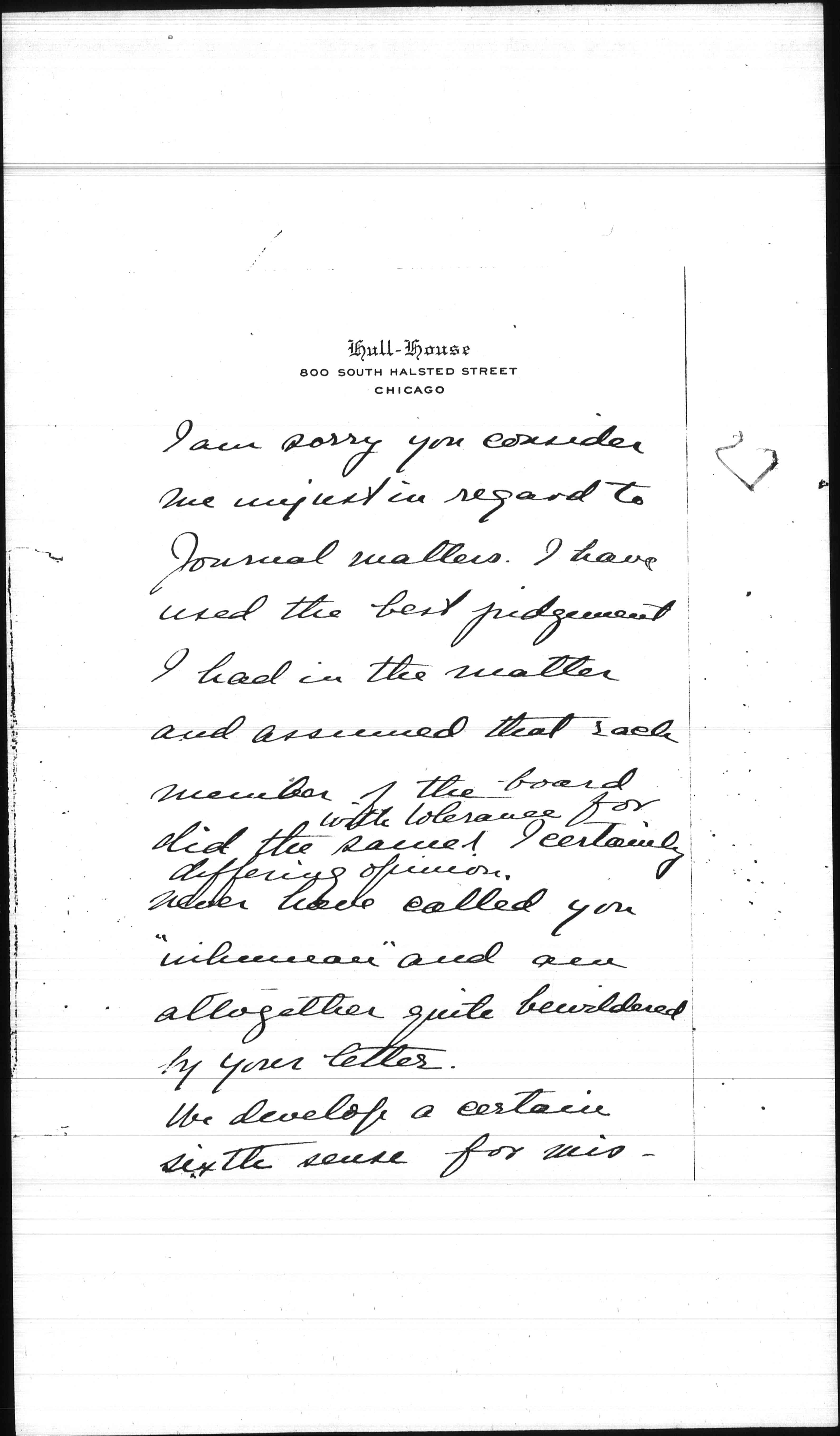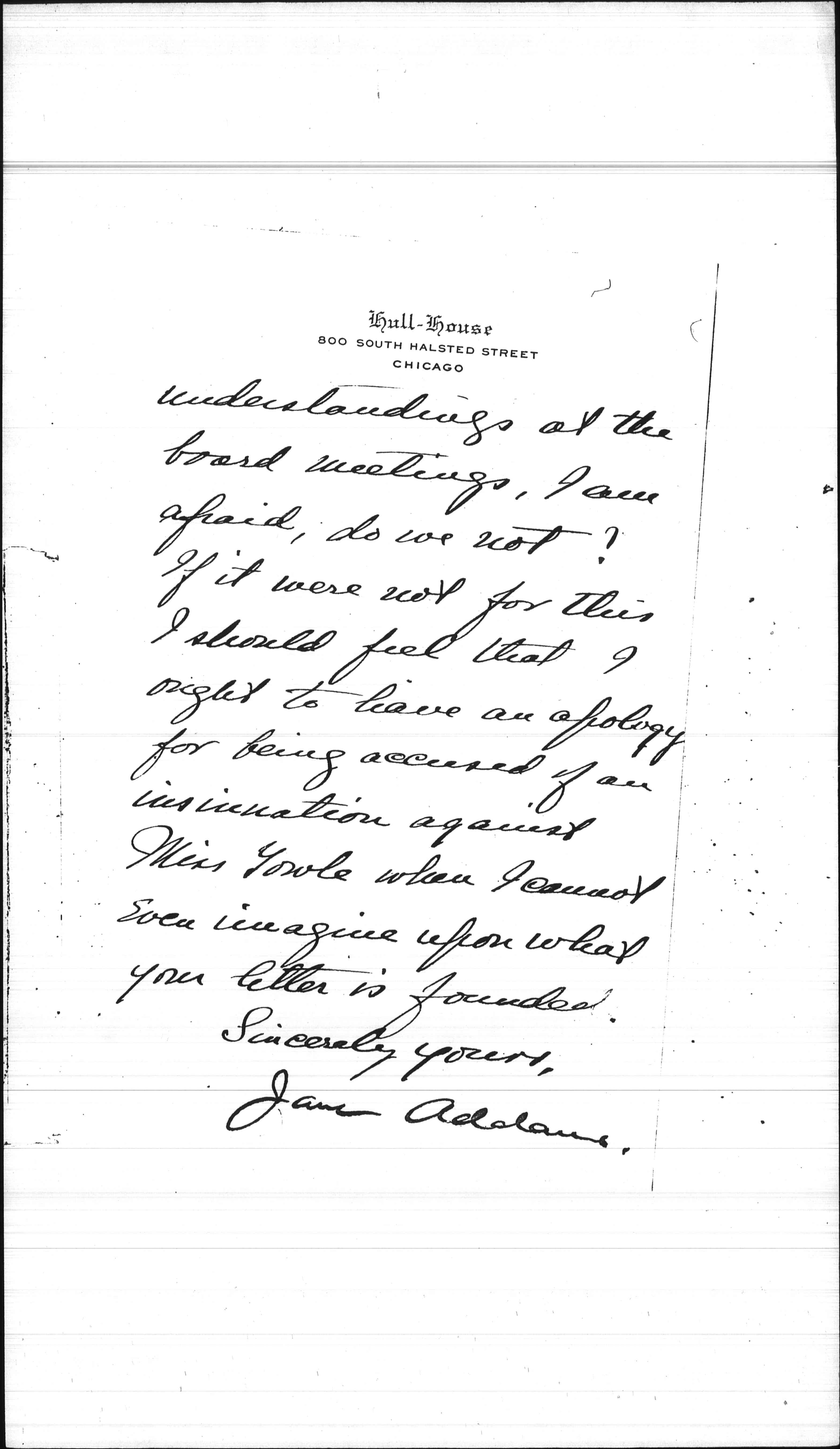 We develop a certain sixth sense for misunderstandings [page 3] at the board meetings, I am afraid, do we not? If it were not for this I should feel that I ought to have an apology for being accused of an insinuation against Miss Towle when I cannot even imagine upon what your letter is founded.