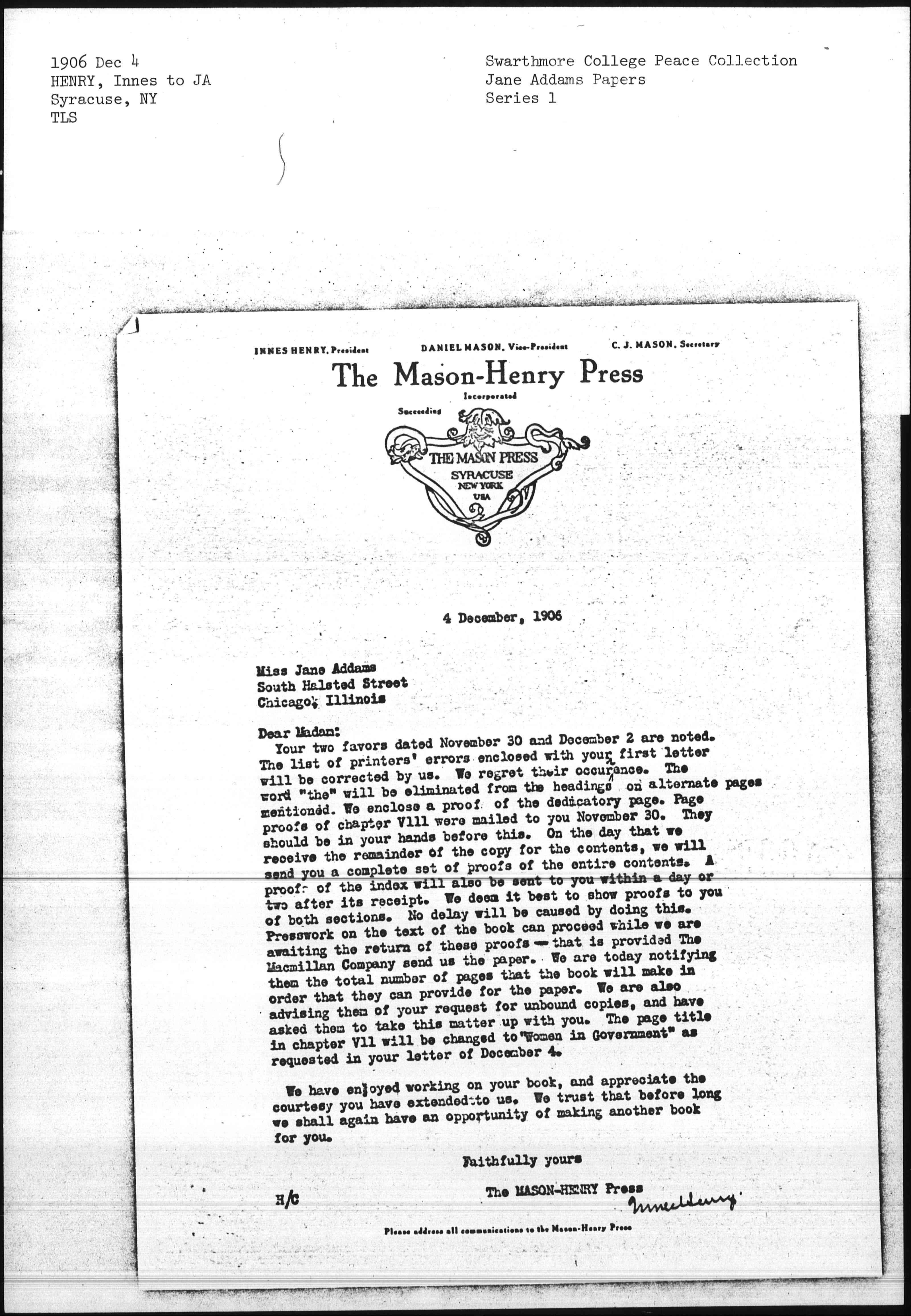 Your two favors dated November 30 and December 2 are noted. The list of printers' errors enclosed with your first letter will be corrected by us. We regret their occurrence. The word "the" will be eliminated from the headings on alternate pages mentioned. We enclose a proof of the dedicatory page. Page proofs of chapter VIII were mailed to you November 30. They should be in your hands before this. On the day that we receive the remainder of the copy for the contents, we will send you a complete set of proofs of the entire contents. A proofs of the index will also be sent to you within a day or two after its receipt. We deem it best to show proofs to you of both sections. No delay will be caused by doing this. Presswork on the text of the book can proceed while we are awaiting the return of these proofs--that is provided The Macmillan Company send us the paper. We are today notifying them the total number of pages that the book will make in order that they can provide for the paper. We are also advising them of your request for unbound copies, and have asked them to take this matter up with you. The page title in chapter VII will be changed to "Women in Government" as requested in your letter of December 4.