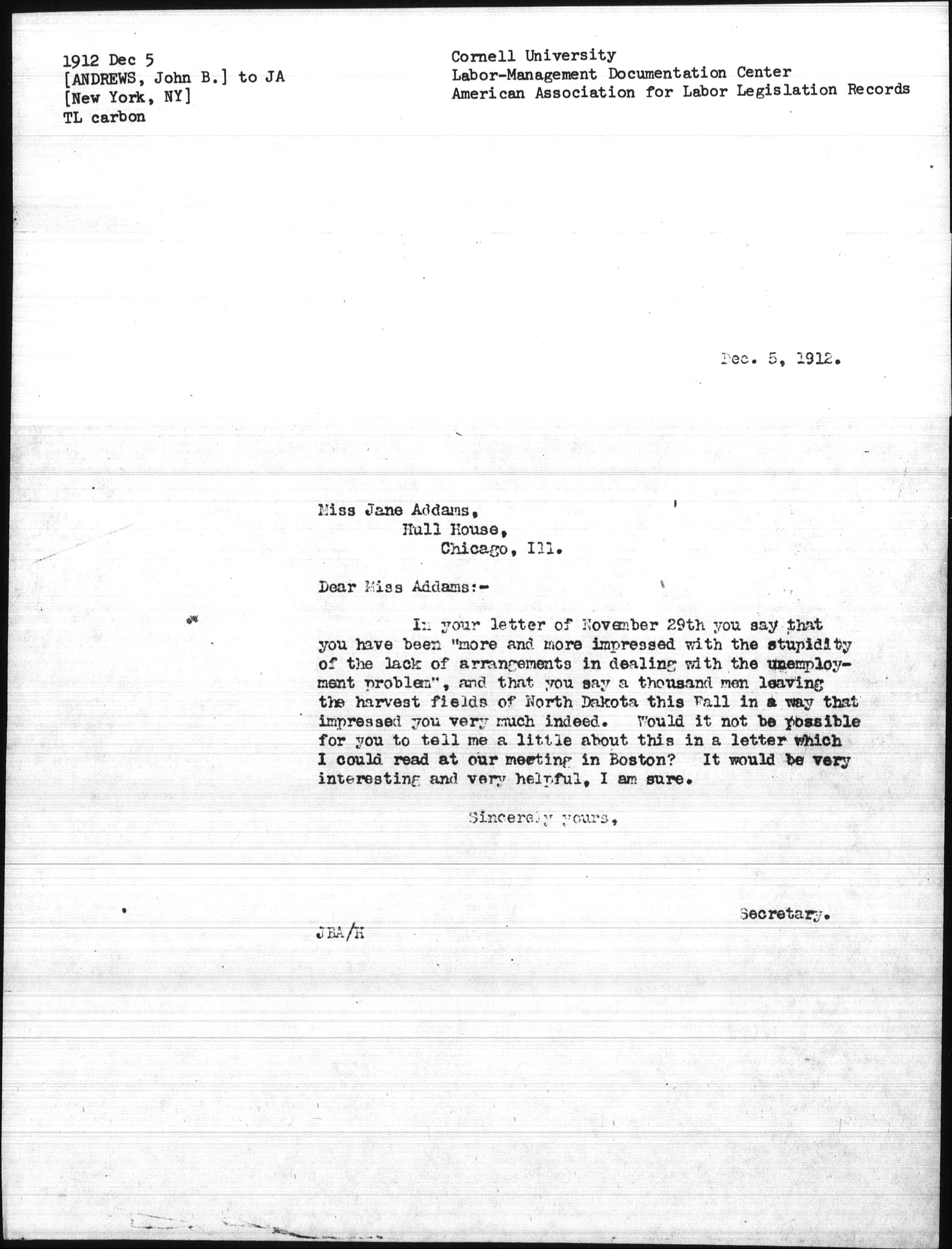 In your letter of November 29th you say that you have been "more and more impressed with the stupidity of the lack of arrangements in dealing with the unemployment problem," and that you [saw] a thousand men leaving the harvest fields of North Dakota this Fall in a way that impressed you very much indeed. Would it not be possible for you to tell me a little about this in a letter which I could read at our meeing in Boston? It would be very interesting and very helpful, I am sure.