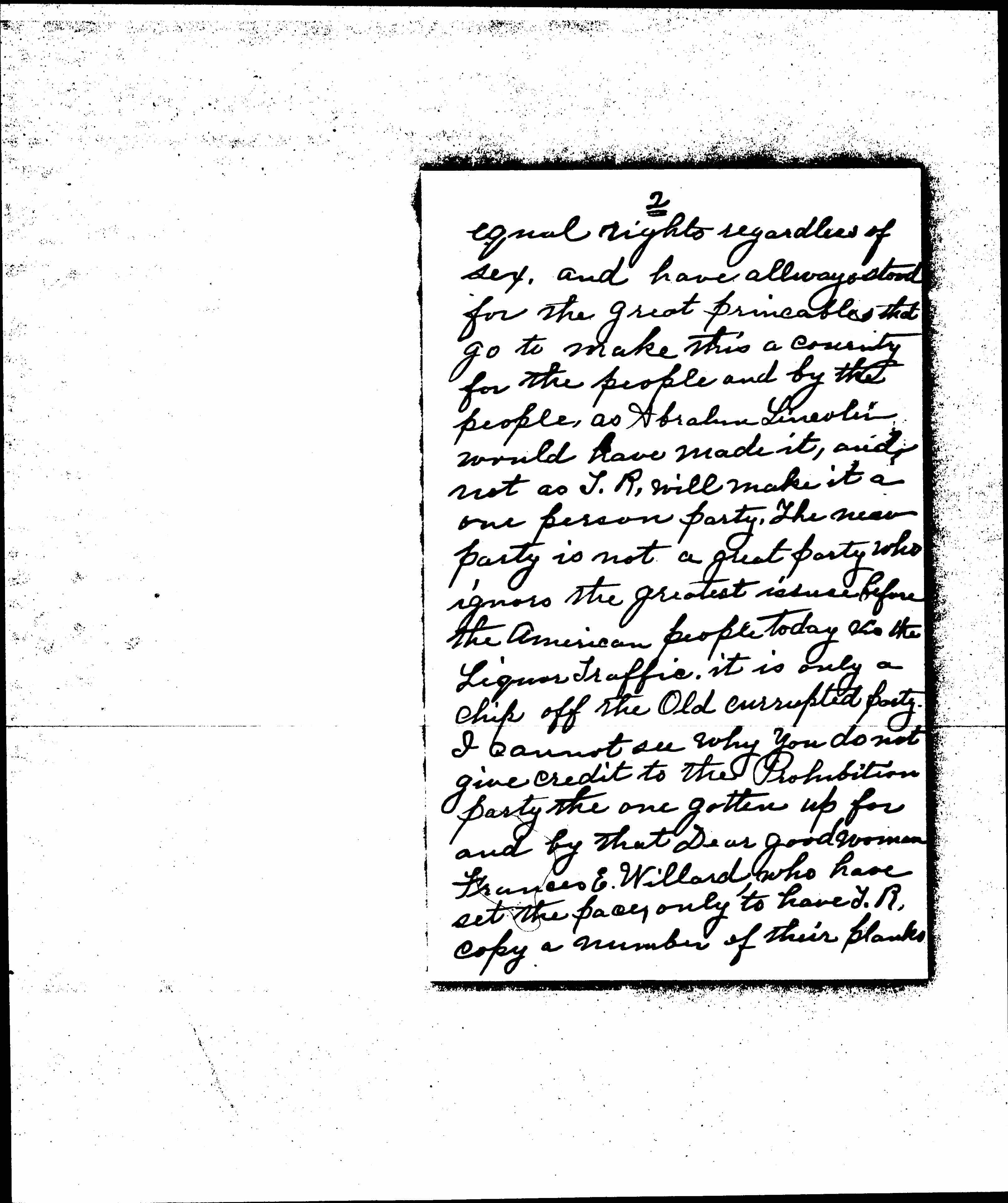 First of all are you not aware that T. R. Roosevelt is a hard drinker and fighter, and is only fit to plunge our country into disaster, he [ignores] the worst Trust the Liquor Traffic then do you not know that we have a party who has for 40 years or more put into their platform [page 2] equal rights regardless of sex, and have [always] stood for the great [principles] that go to make this a country for the people and by the people, as Abraham Lincoln would have made it, and not as T. R. will make it a one person party. The new party is not a great party who [ignores] the greatest issues before the American people today [illegible] the Liquor Traffic, it is only a chip off the Old [corrupted] party. I cannot see why you do not give credit to the Prohibition party the one gotten up for and by that Dear good woman Frances E. Willard, who have set the pace, only to have T. R. copy a number of their planks [page 3] but why did he not take their first Plank, Prohibit the manufacture of the worst business on Gods green earth in fact it is no business but a crime, because he wants the Liquor Vote, and he is a coward.