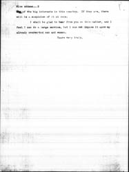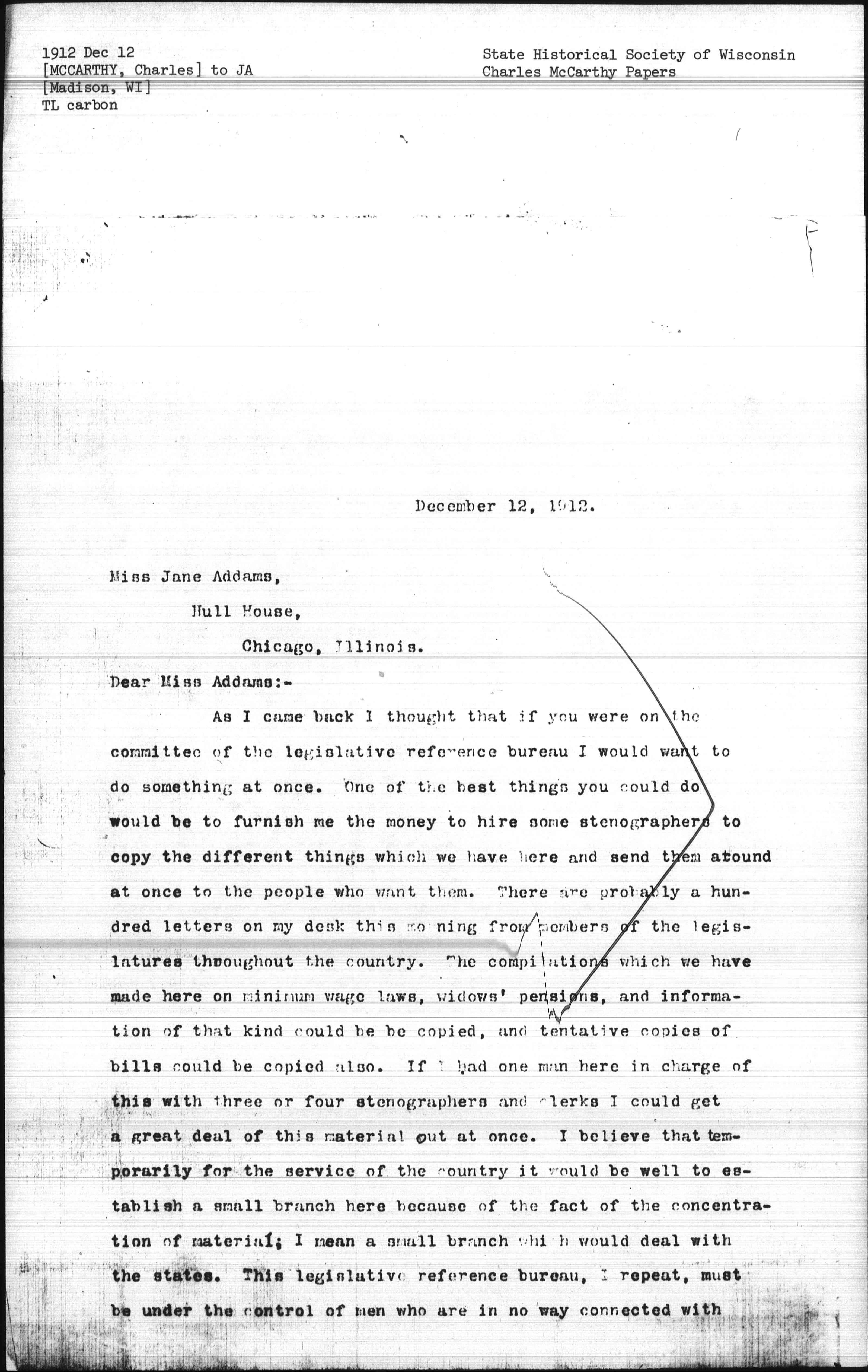 As I came back I thought that if you were on the committee of the legislative reference bureau I would want to do something at once. One of the best things you could do would be to furnish me the money to hire some stenographers to copy the different things which we have here and send them around at once to the people who want them. There are probably a hundred letters on my desk this morning from members of the legislatures throughout the country. The compilations which we have made here on minimum wage laws, widows' pensions, and information of that kind could be copied, and tentative copies of bills could be copied also. If I had one man here in charge of this with three or four stenographers and clerks I could get a great deal of this material out at once. I believe that temporarily for the service of the country it would be well to establish a small branch here because of the fact of the concentration of material; I mean a small branch which would deal with the states. This legislative reference bureau, I repeat, must be under the control of men who are in no way connected with [page 2] [any] of the big interests in this country. If they are, there will be a suspicion of it at once.