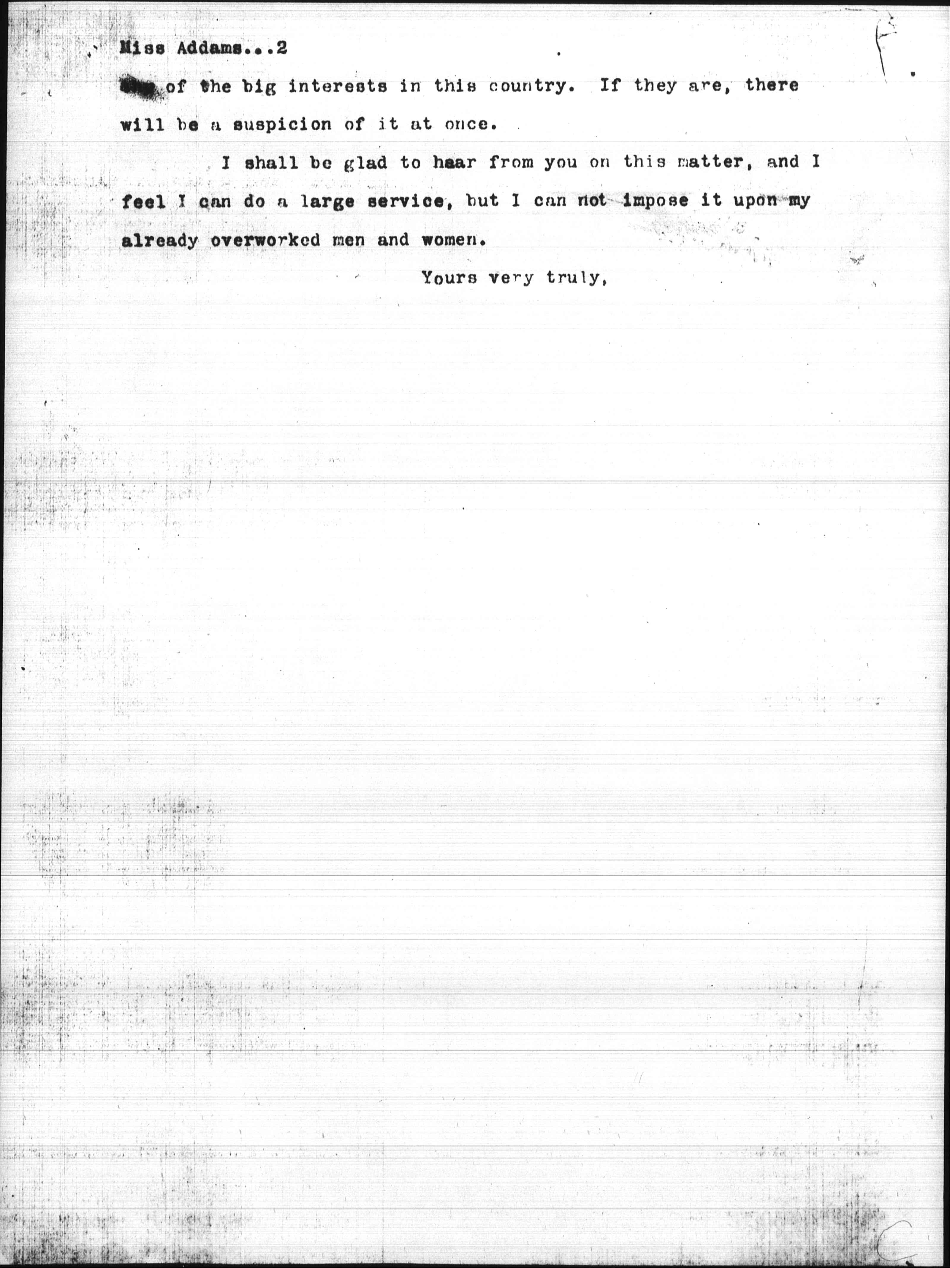 I shall be glad to hear from you on this matter, and I feel I can do a large service, but I can not impose it upon my already overworked men and women.Yours very truly,