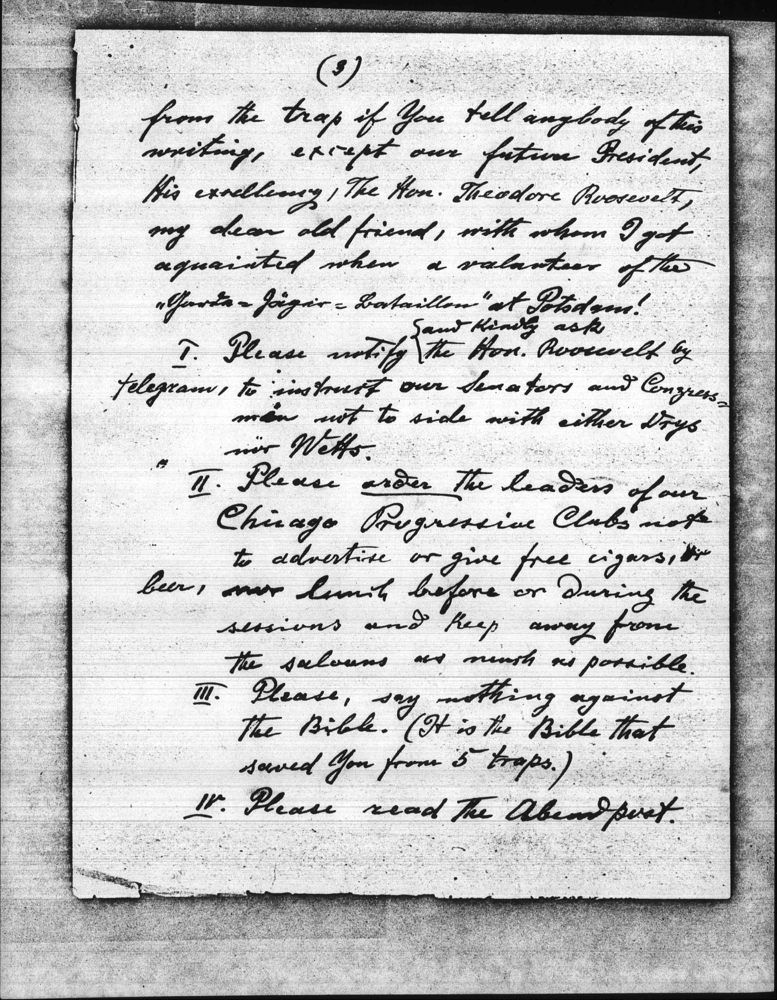 Last night I have been in the Club-Meeting with some Senators and found out that the Democratic Party and the Republican and Socialistic Parties [accorded] by the Prohibition Party and the United Societies for personal liberty, have laid traps to wreck the Progressive Party on the 15. of this month, <and afterwards>, and demoralize the party for good.-- In order to have them caught in their own trap, I had to make about 5 Shamtraps for the Bull Moose Party. These Shamtraps must be dissolved before the 15.th. For that reason I sent the "fingerprint" and write to You [today], because I have no time to send a letter to my friend, at N.Y. You will release the Democrats [page 3] from the trap if You tell anybody of this writing, except our future President, His excellency, The Hon. Theodore Roosevelt, my dear old friend, with whom I got [acquainted] when a volunteer of the 'Garde Jaƫger Battalion" at Potsdam!