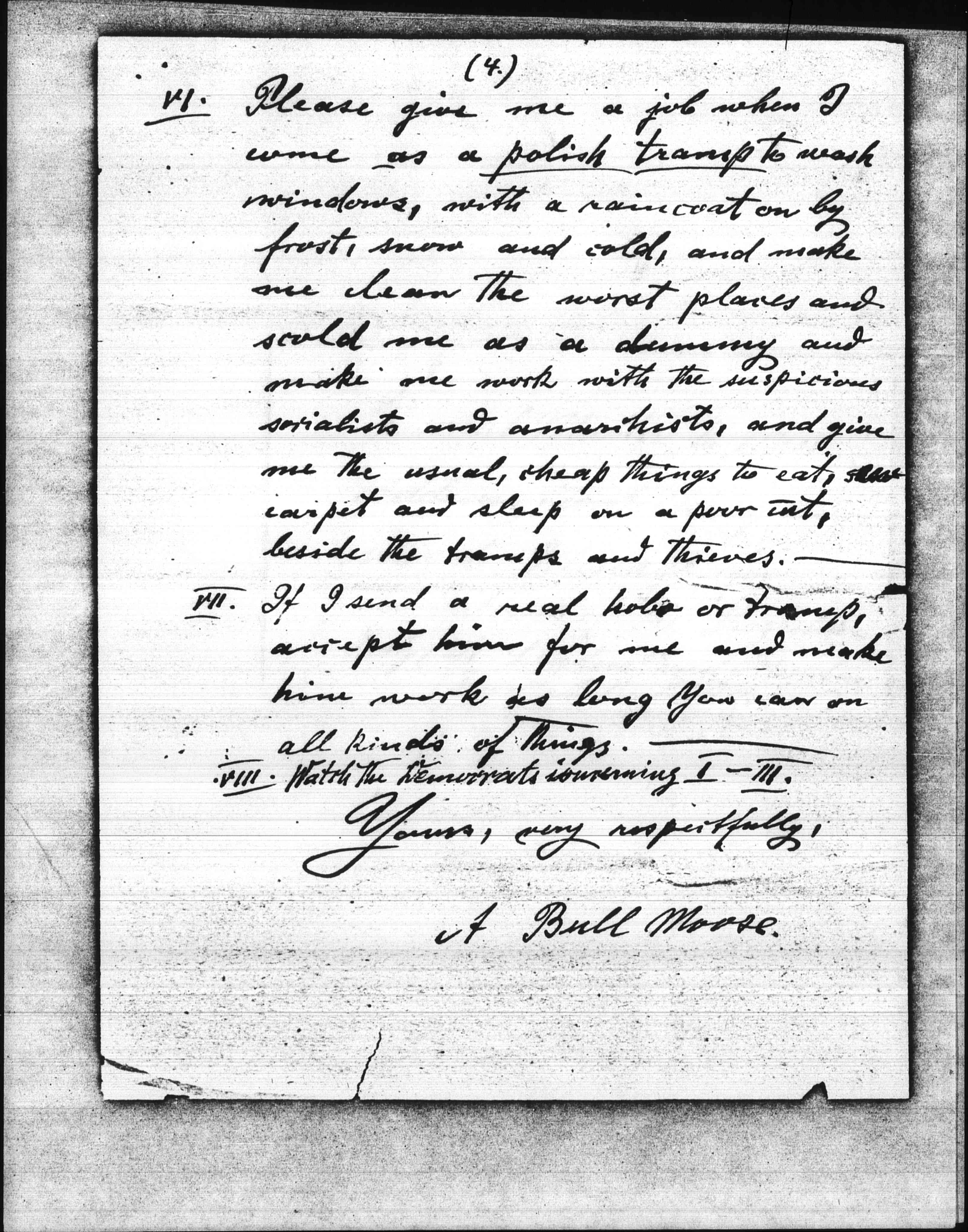 VI. Please give me a job when I come as a polish tramp to wash windows, with a raincoat on by frost, snow and cold, and make me clean the worst places and scold me as a dummy and make me work with the suspicious socialists and anarchists, and give me the usual, cheap things to eat, carpet and sleep on a poor [int], beside the tramps and thieves.--