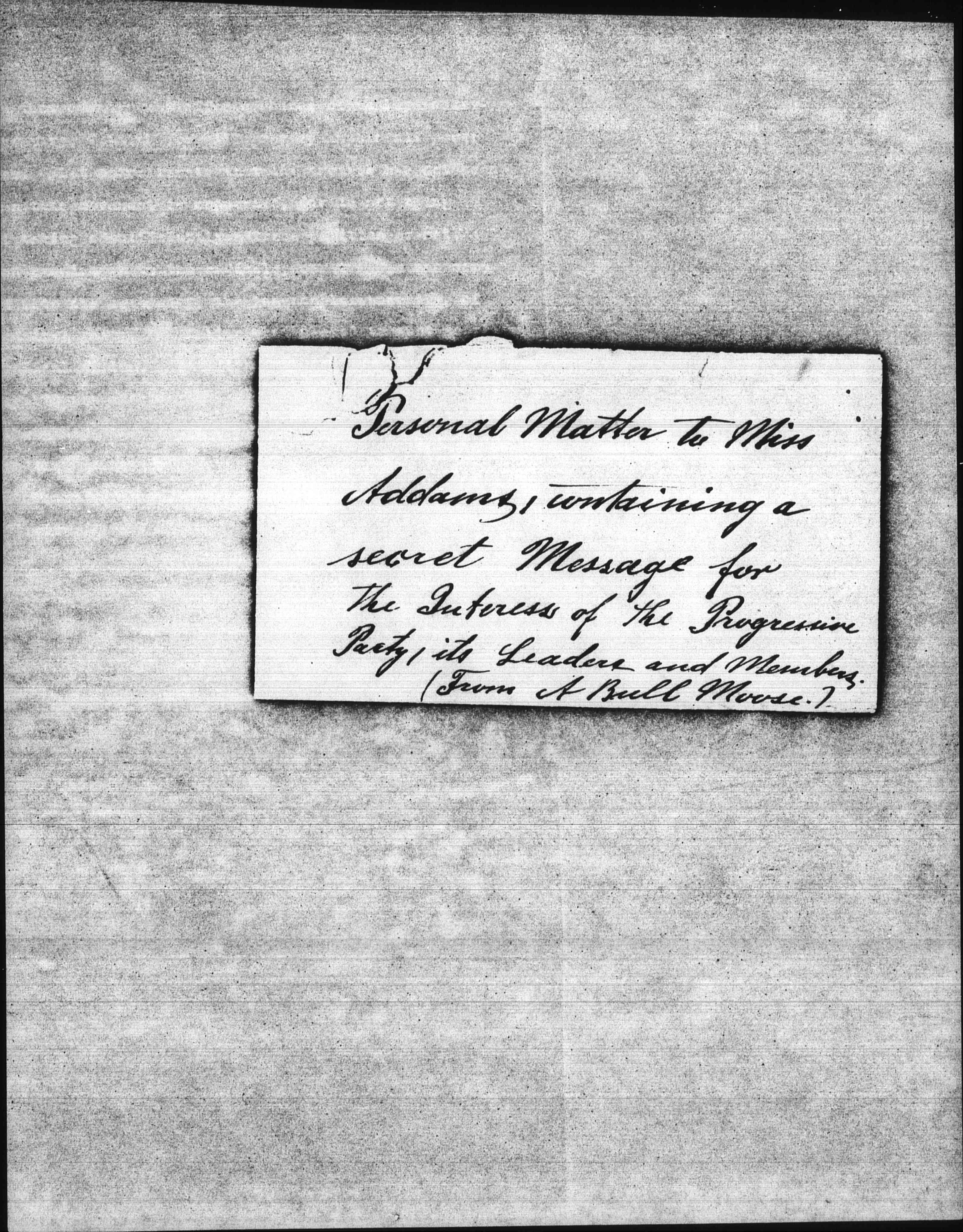 [envelope front] Personal Matter to Miss Addams, containing a secret Message for The Interests of the Progressive Party, its Leaders and Members. (From A Bull Moose.)