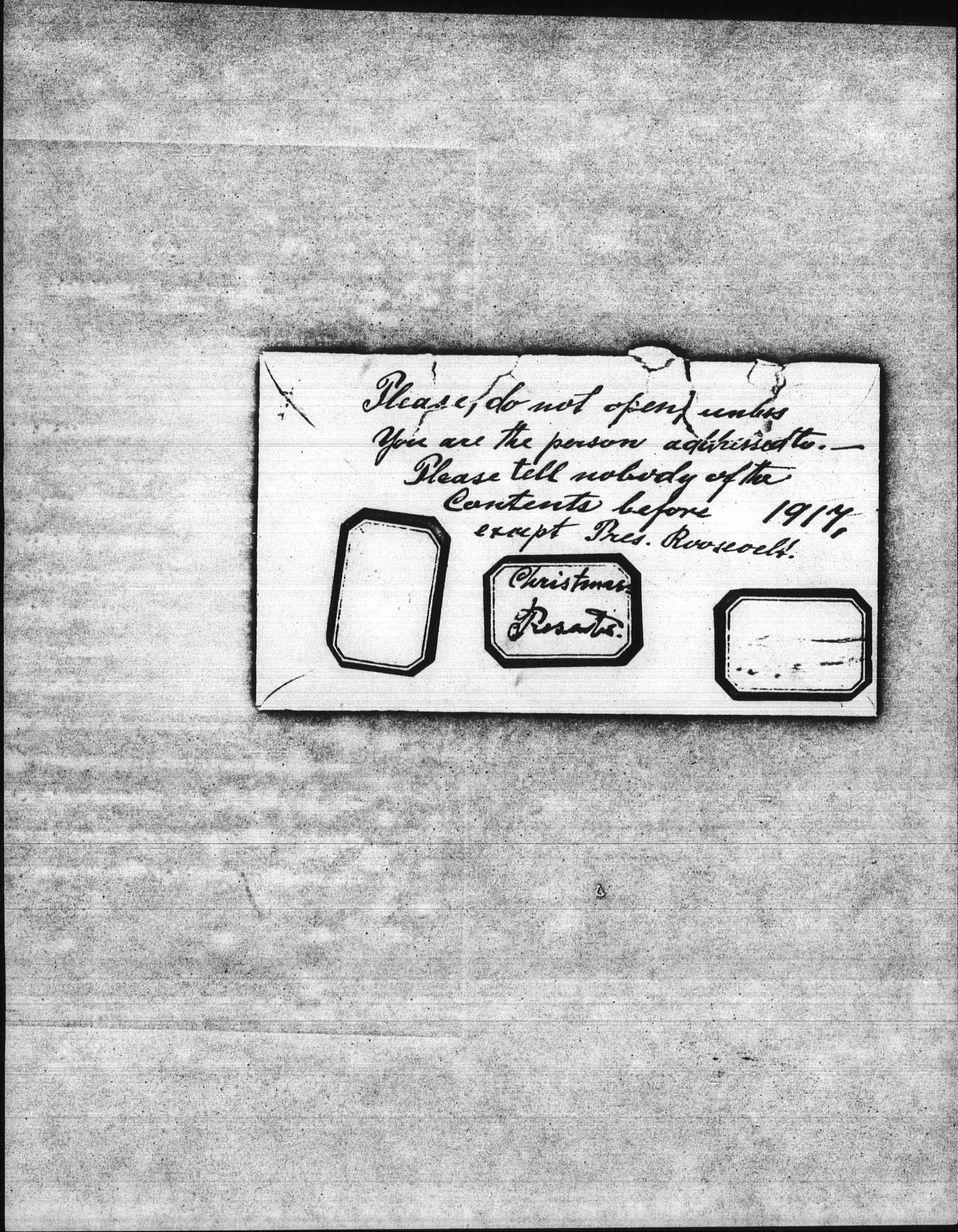 [envelope rear] Please, do not open unless you are the person addressed to.-- Please tell nobody the Contents before 1917, except Pres. Roosevelt.