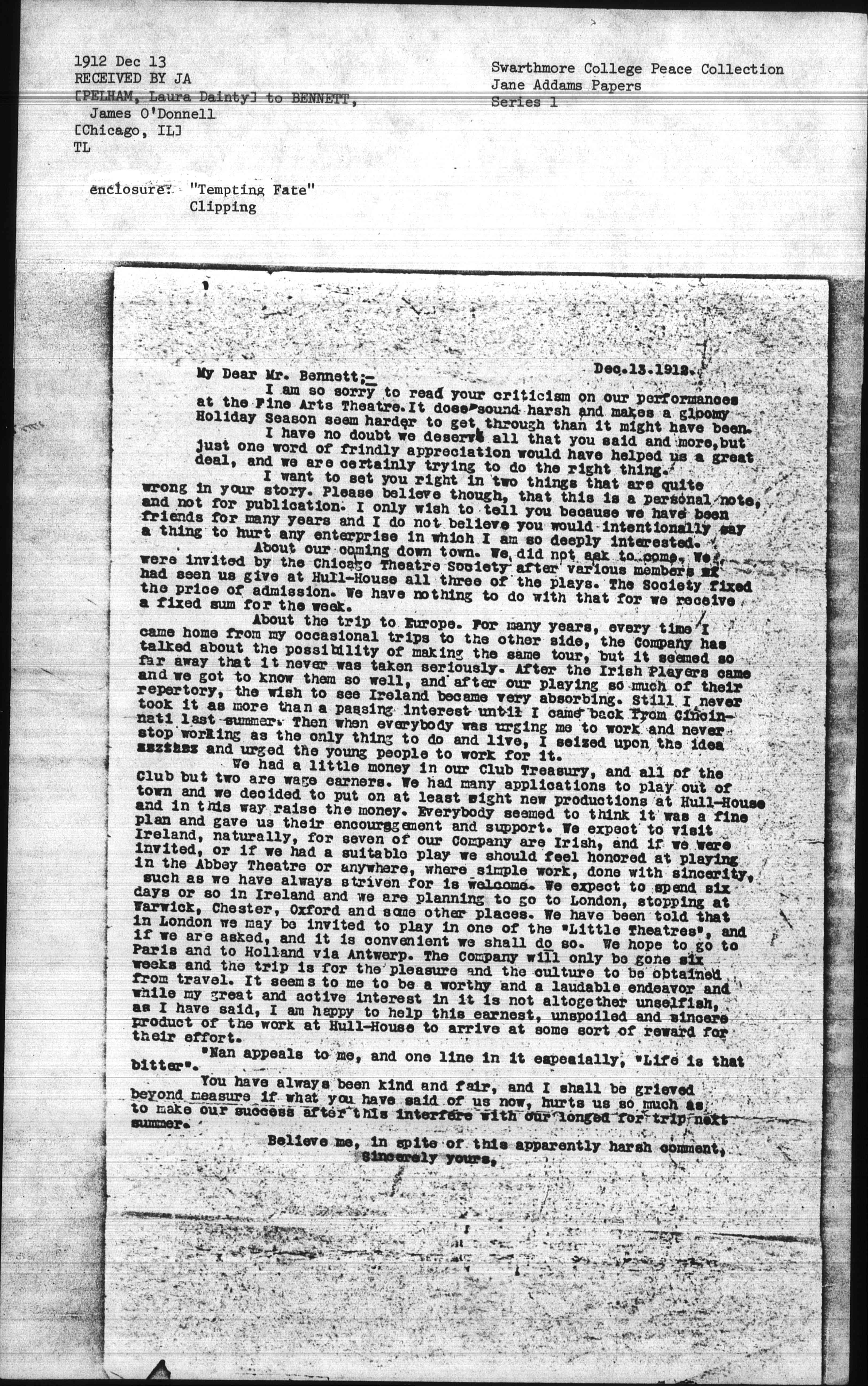We had a little money in our Club Treasury, and all of the Club but two are wage earners. We had many applications to play out of town and we decided to put on at least eight new productions at Hull-House and in this way raise the money. Everybody seemed to think it was a fine plan and gave us their encouragement and support. We expect to visit Ireland, naturally, for seven of our Company are Irish, and if we were invited, or if we had a suitable play we should feel honored at playing in the Abbey Theatre or anywhere, where simple work, done with sincerity, such as we have always striven for is welcome. We expect to spend six days or so in Ireland and we are planning to go to London, stopping at Warwick, Chester, Oxford, and some other places. We have been told that in London we may be invited to play in one of the "Little [Theaters]", and if we are asked, and it is convenient we shall do so. We hope to go to Paris and to Holland via Antwerp. The Company will only be gone six weeks and the trip is for the pleasure and the culture to be obtained from travel. It seems to me to be a worthy and a laudable endeavor and while my great and active interest in it is not altogether unselfish, as I have said, I am happy to help this earnest, unspoiled and sincere product of the work at Hull-House to arrive at some sort of reward for their effort.