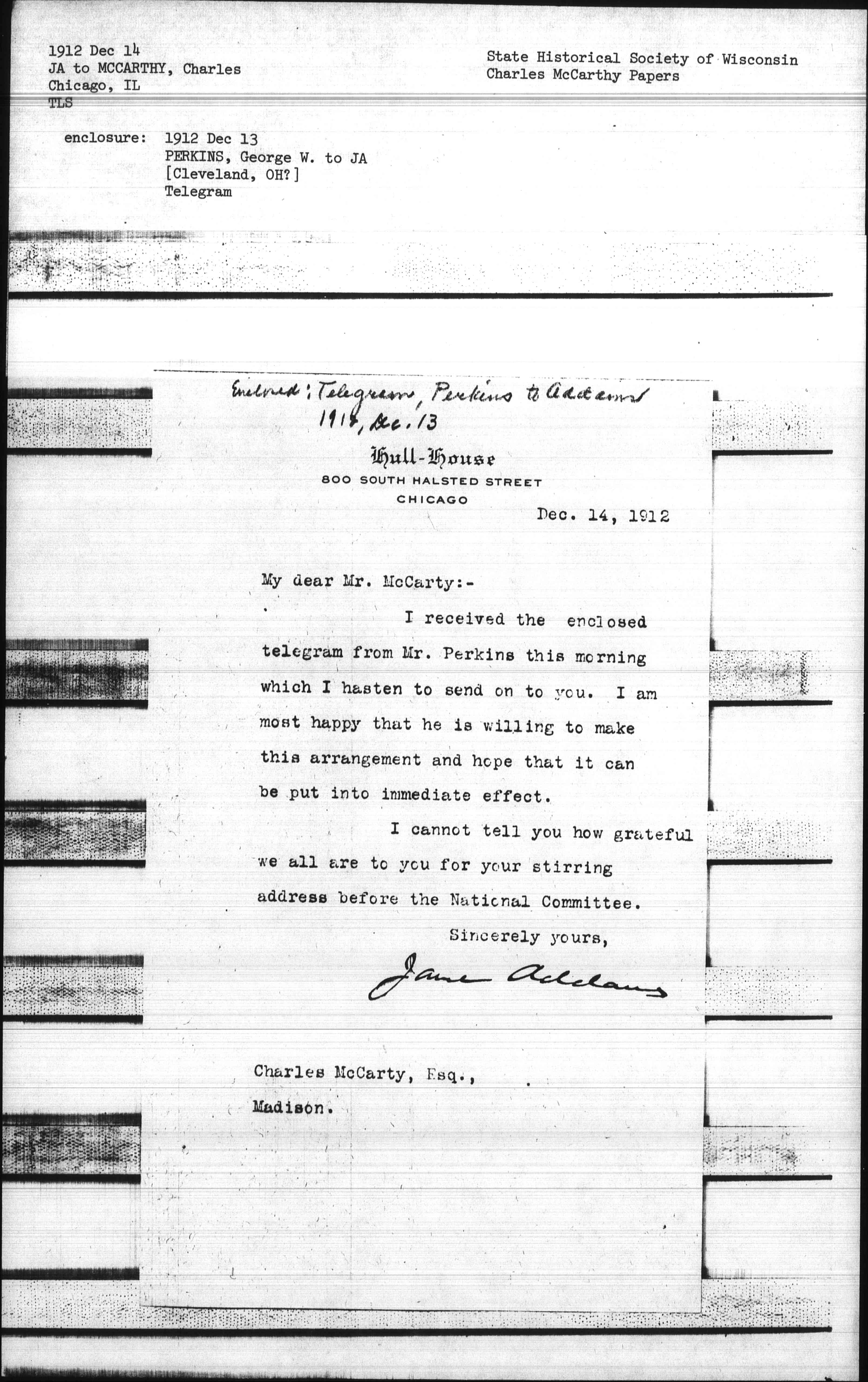 My dear Mr. [McCarthy]:-I received the enclosed telegram from Mr. Perkins this morning which I hasten to send on to you. I am most happy that he is willing to make this arrangement and hope that it can be put into immediate effect.