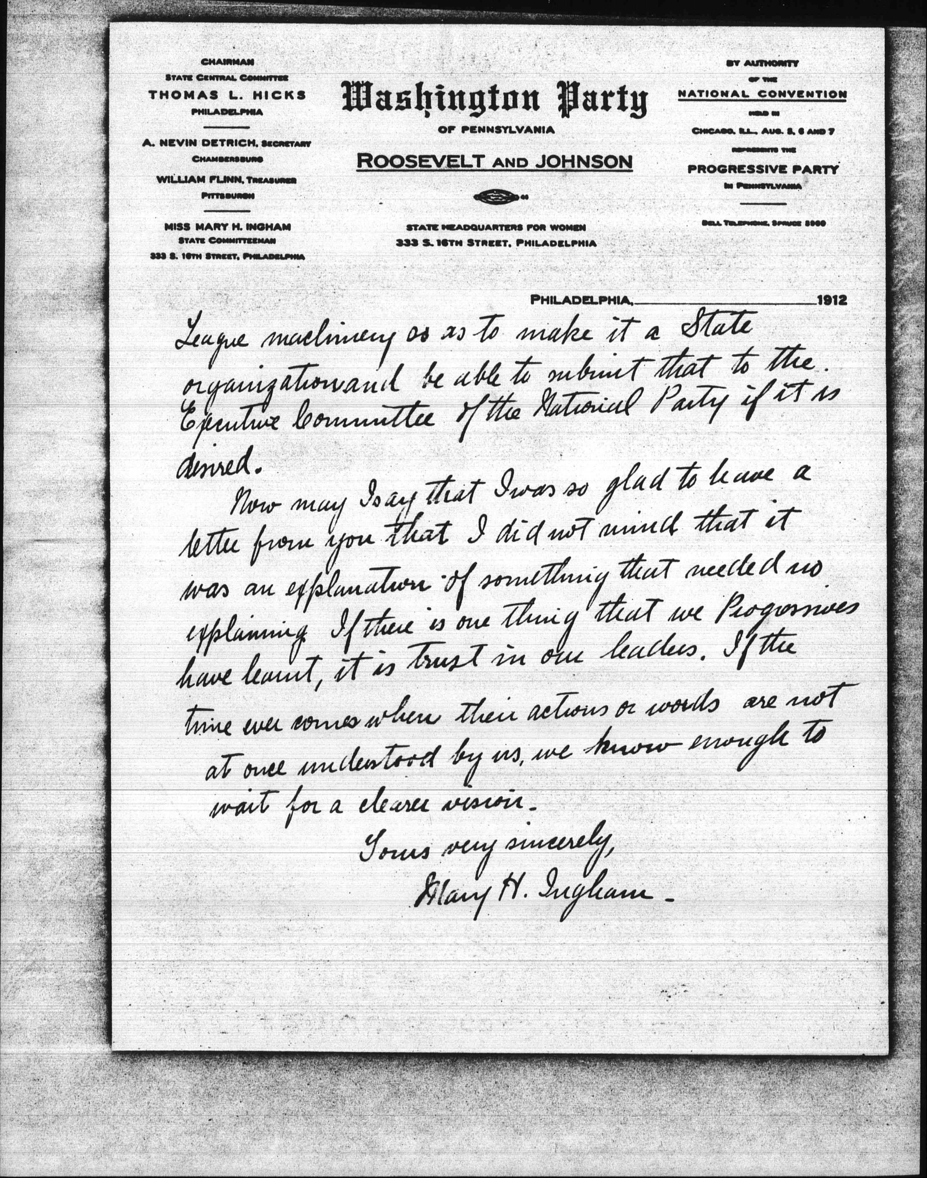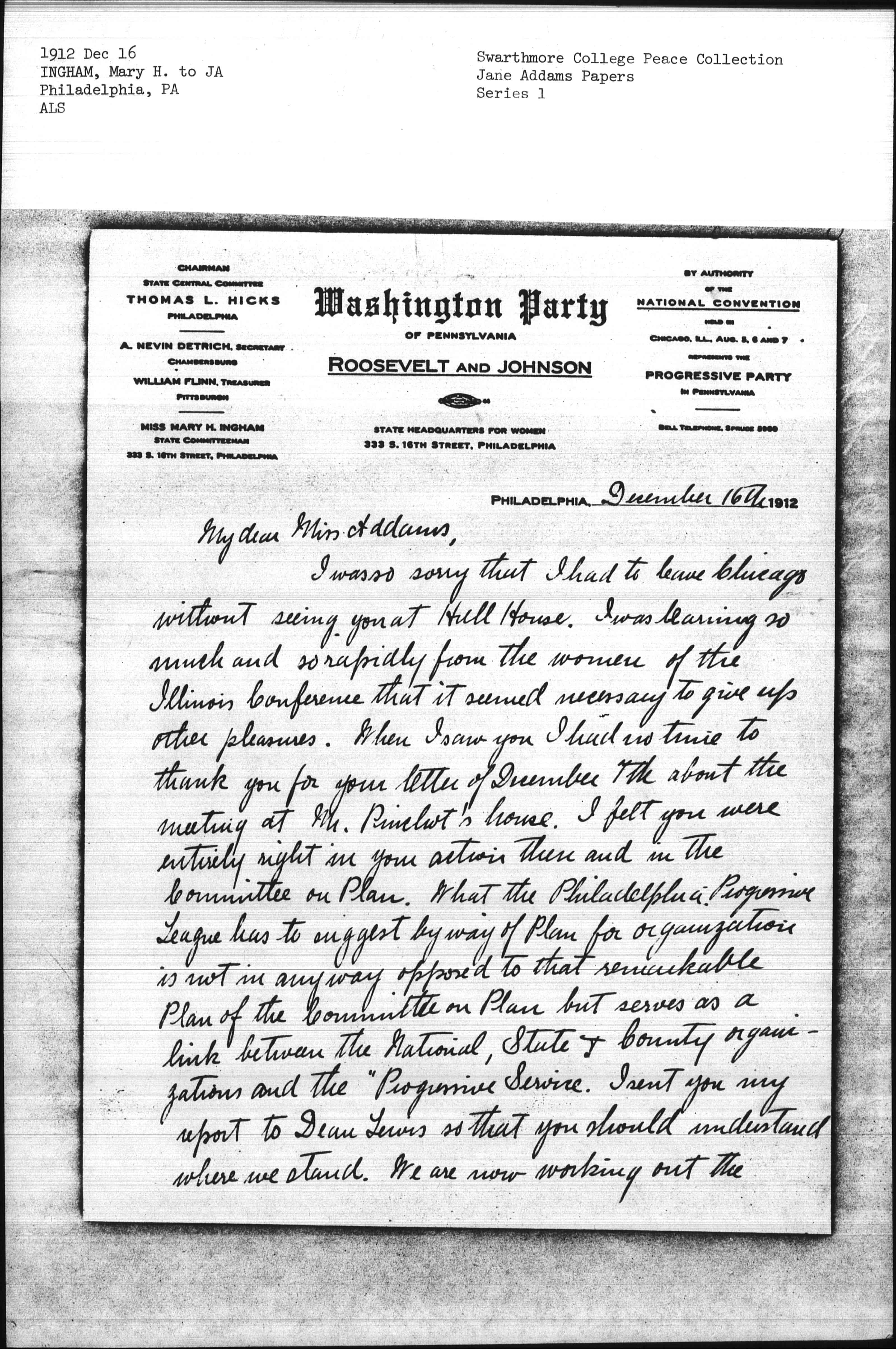 I was so sorry that I had to leave Chicago without seeing you at Hull House. I was learning so much and so rapidly from the women of the Illinois Conference that it seemed necessary to give up other pleasures. When I saw you had no time to thank you for your letter of December 7th about the meeting at Mr. Pinchot's house. I felt you were entirely right in your action then and in the Committee on Plan. What the Philadelphia Progressive League has to suggest by way of Plan for organization is not in any way opposed to that remarkable Plan of the Committee on Plan but serves as a link between the National, State & County organizations and the "Progressive Service." I sent you my report to Dean Lewis so that you should understnad where we stand. We are now working out the [page 2] League machinery so as to make it a State organization and be able to submit that to the Executive Committee of the National Party if it is desired.