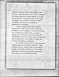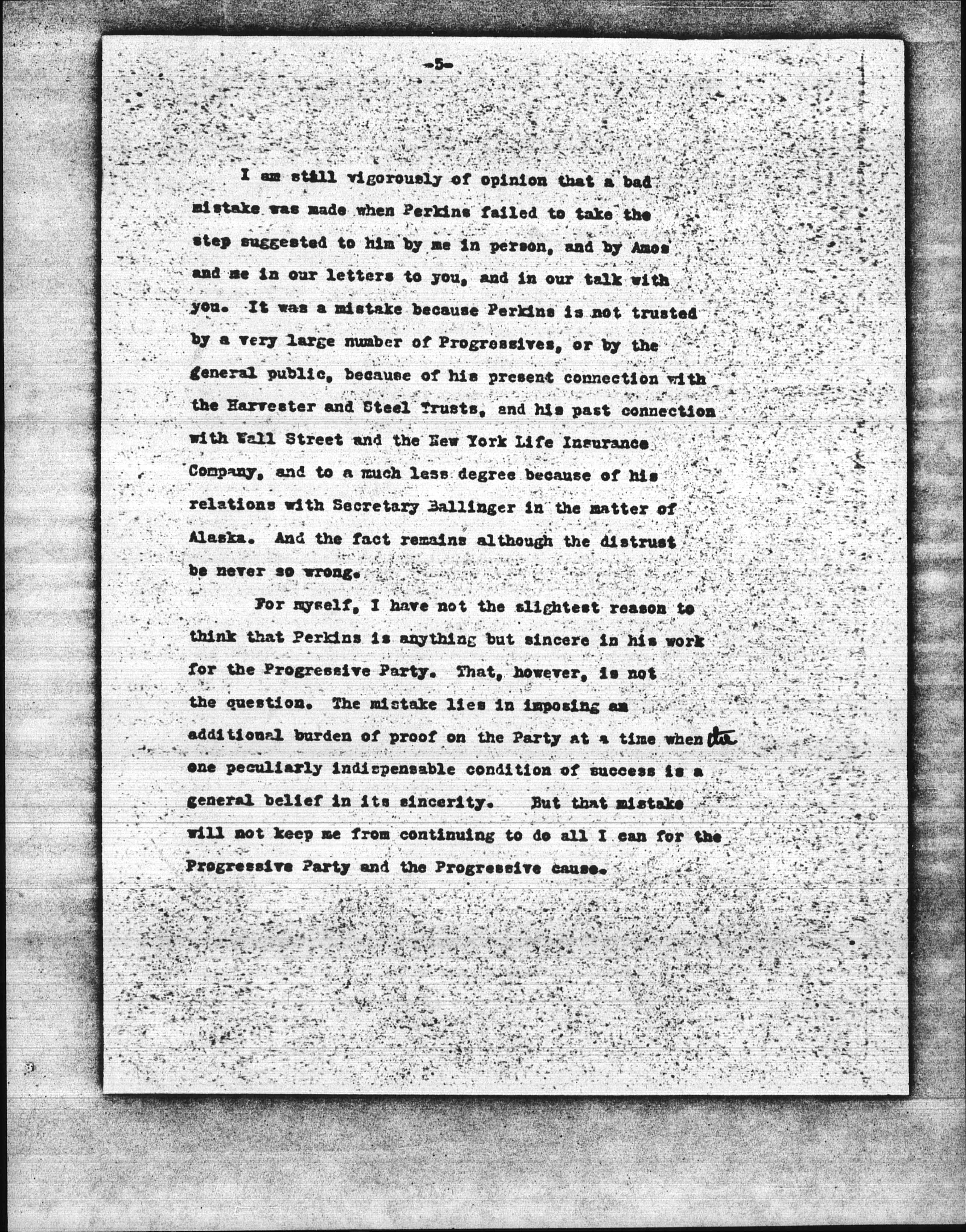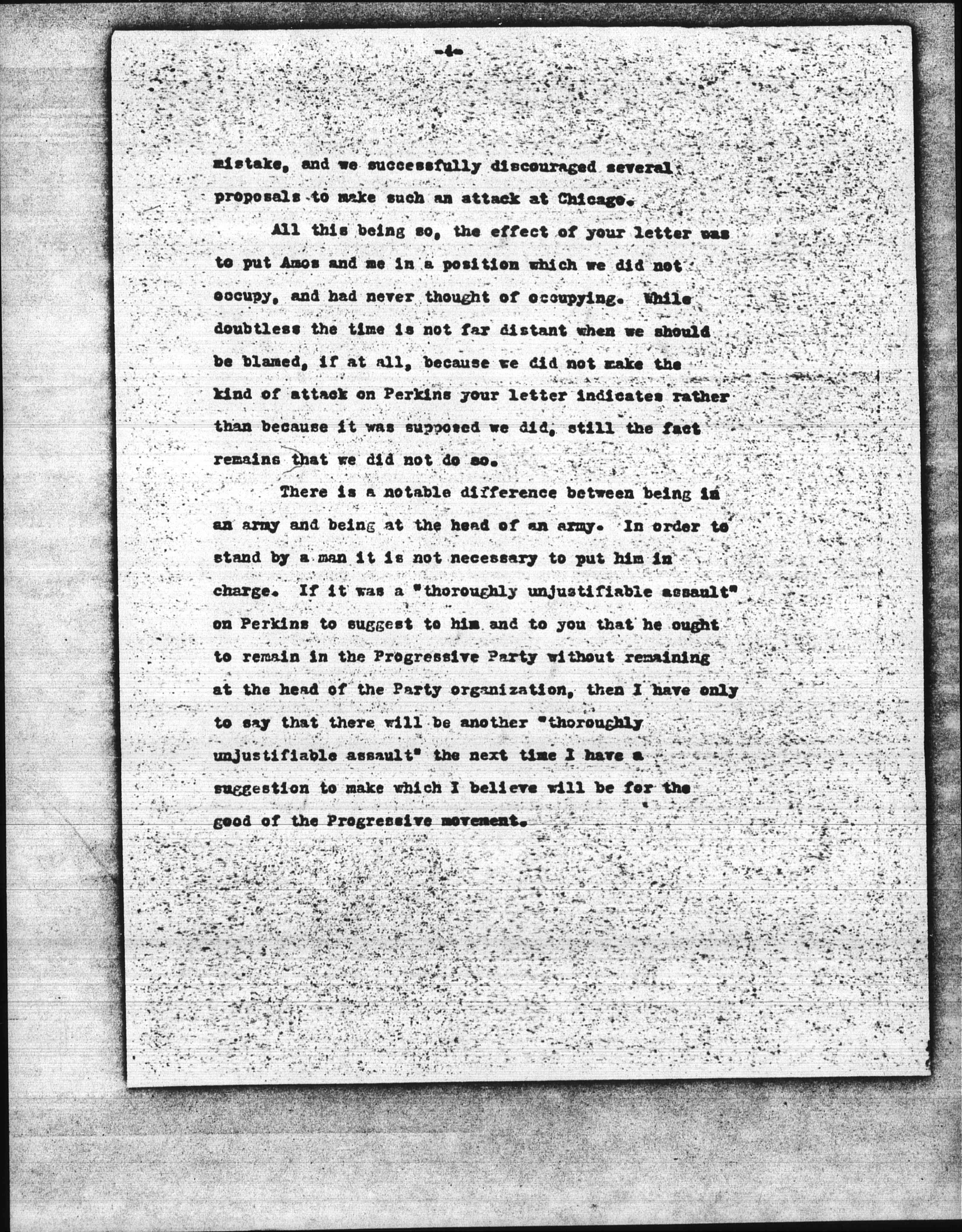 There is a notable difference between being in an army and being at the head of an army. In order to stand by a man it is not necessary to put him in charge. If it was a "thoroughly unjustifiable assault" on Perkins to suggest to him and to you that he ought to remain in the Progressive Party without remaining at the head of the Party organization, then I have only to say that there will be another "thoroughly unjustifiable assault" on Perkins to suggest to him and to you that he ought to remain in the Progressive Party without remaining at the head of the Party organization, then I have only to say that there will be another "thoroughly unjustifiable assault" the next time I have a suggestion to make which I believe will be for the good of the Progressive movement. [page 5]