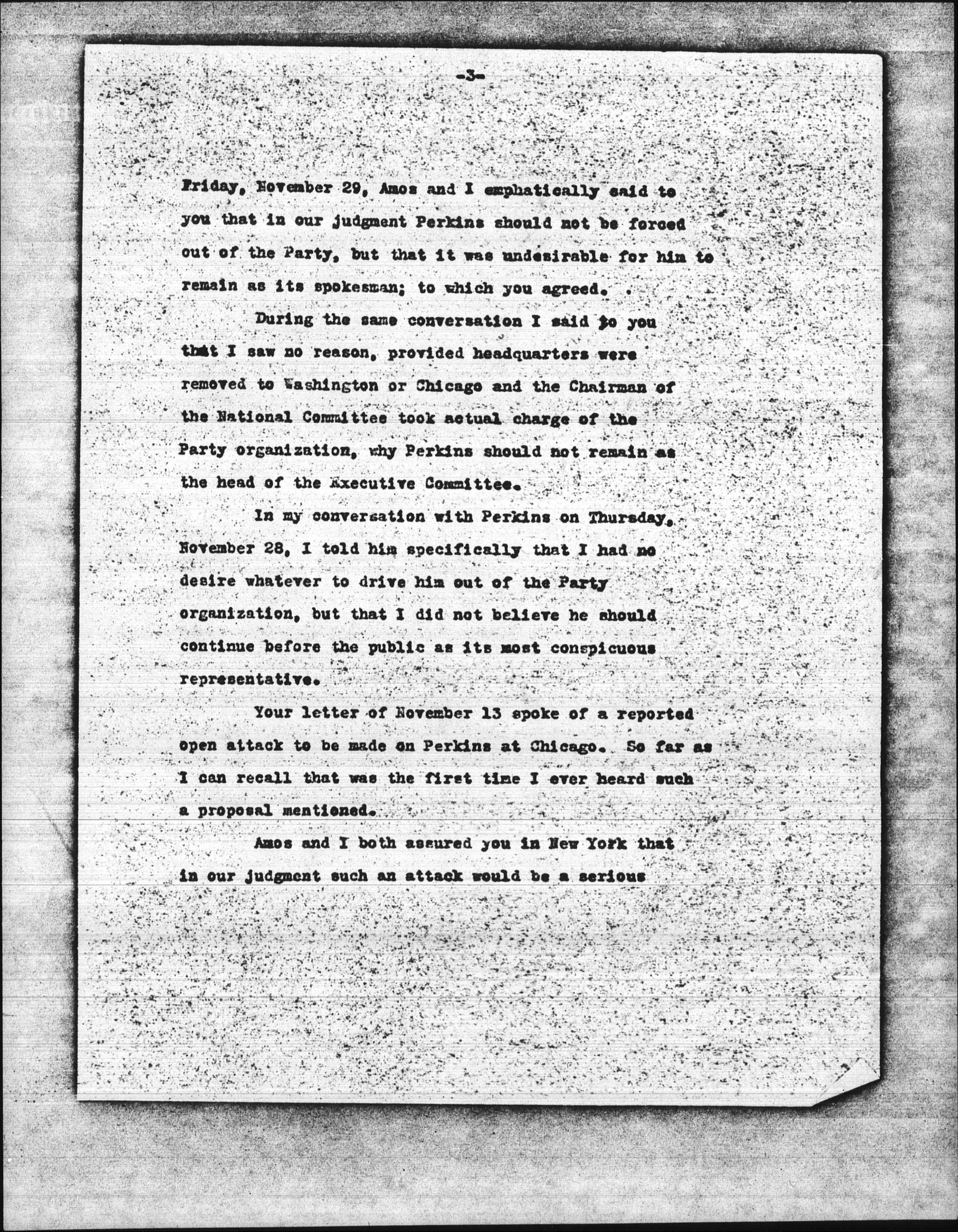 In my conversation with Perkins on Thursday, November 28, I told him specifically that I had no desire whatever to drive him out of the Party organization, but that I did not believe he should continue before the public as its most conspicious representative.