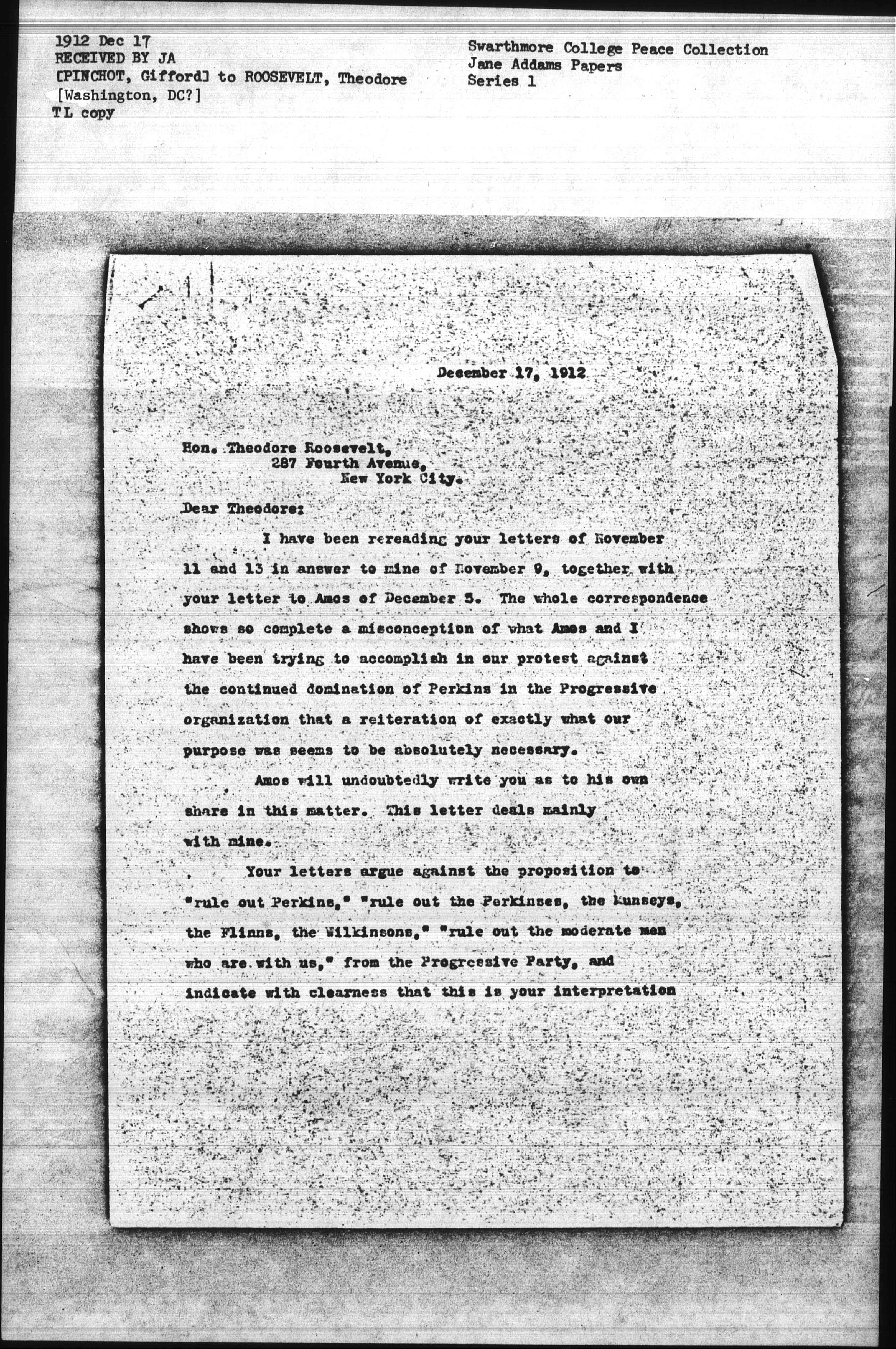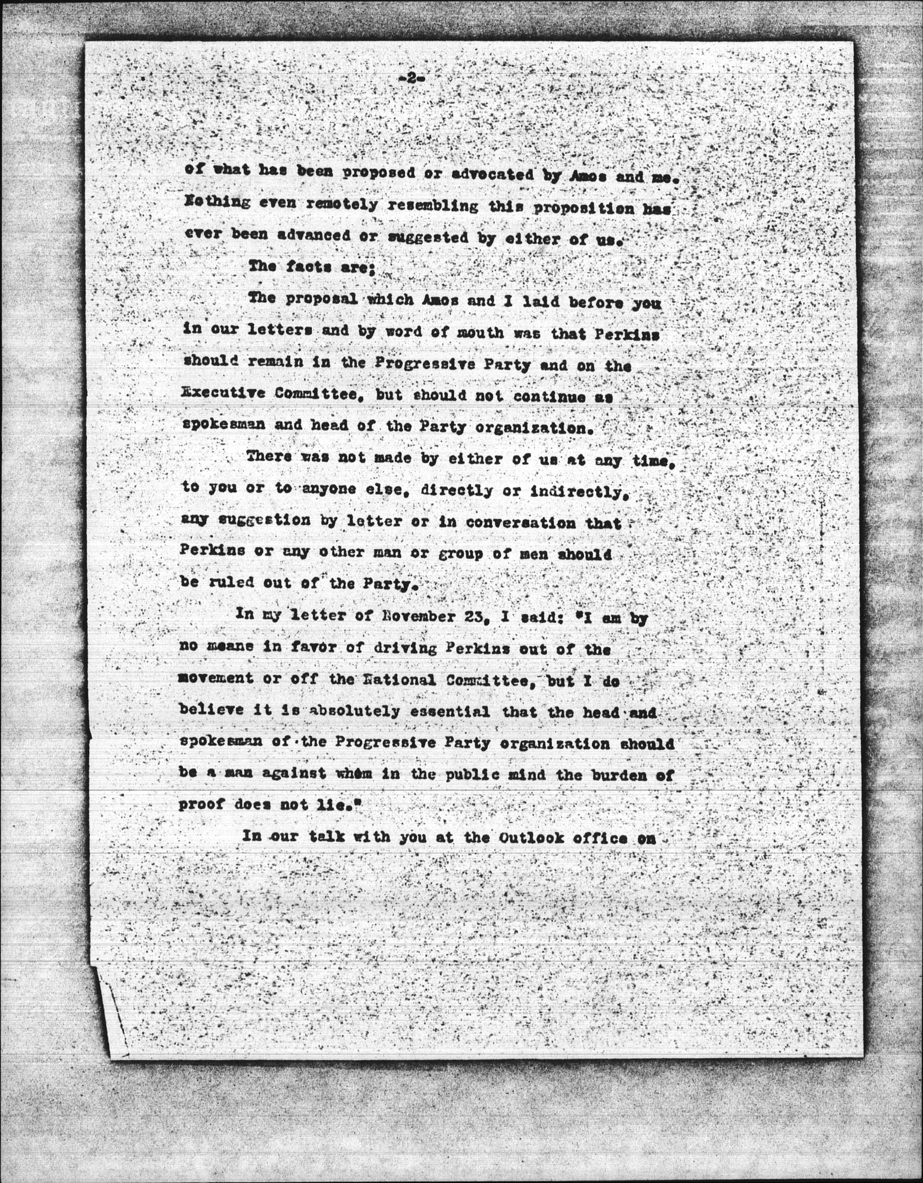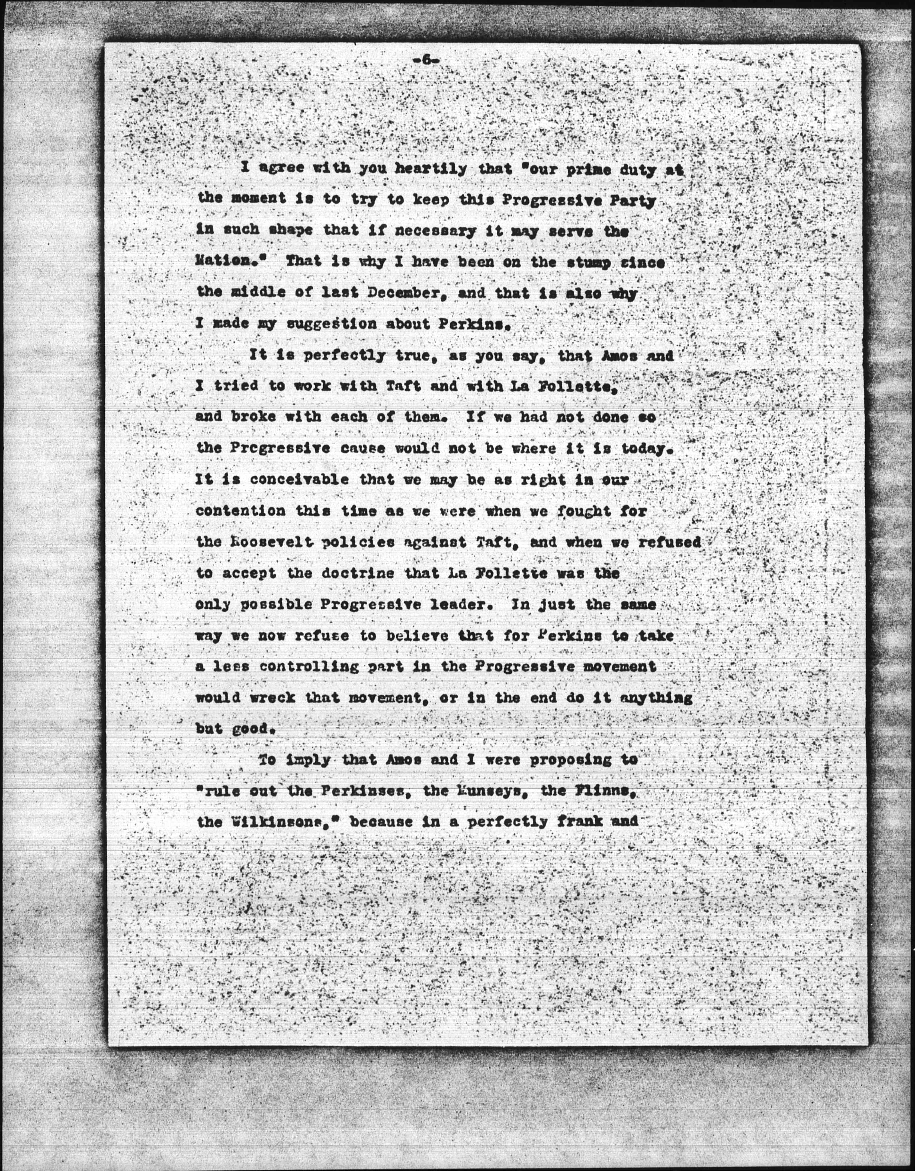 Your letters argue against the proposition to "rule out Perkins," "rule of the Perkinses, the Munseys, the Flinns, the Wilkinsons," "rule out the moderate men who are with us," from the Progressive Party, and indicate with clearness that this is your interpretation [page 2] of what has been proposed or advocated by Amos and me. Nothing even remotely resembling this proposition has ever been advanced or suggested by either of us.
