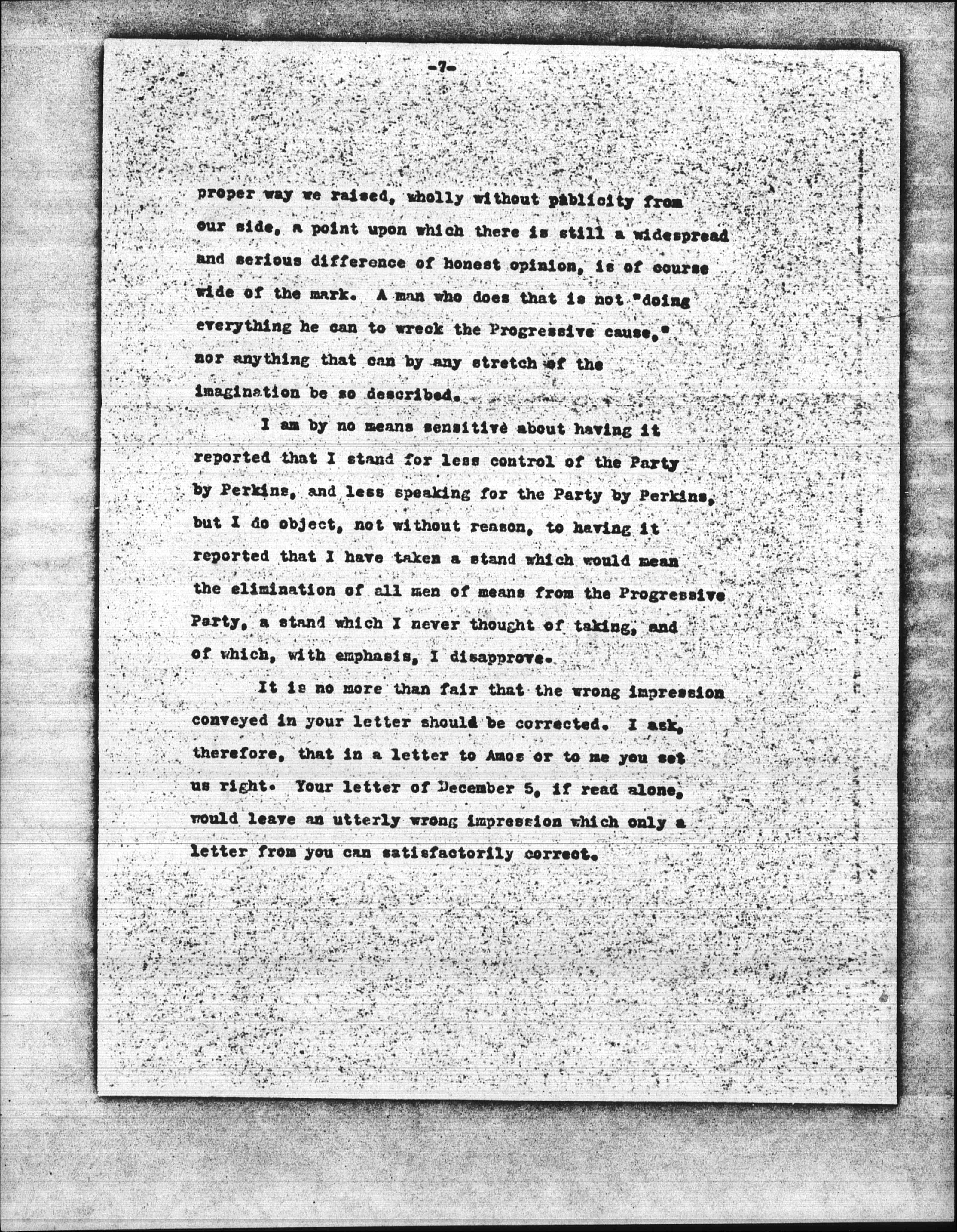 I am by no means sensitive about having it reported that I stand for less control of the Party by Perkins, and less speaking for the Party by Perkins, but I do object, not without reason, to having it reproted that I have taken a stand which would mean the elimination of all men of means from the Progressive Party, a stand which I never thought of taking, and of which, with emphasis, I disapprove.