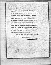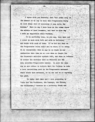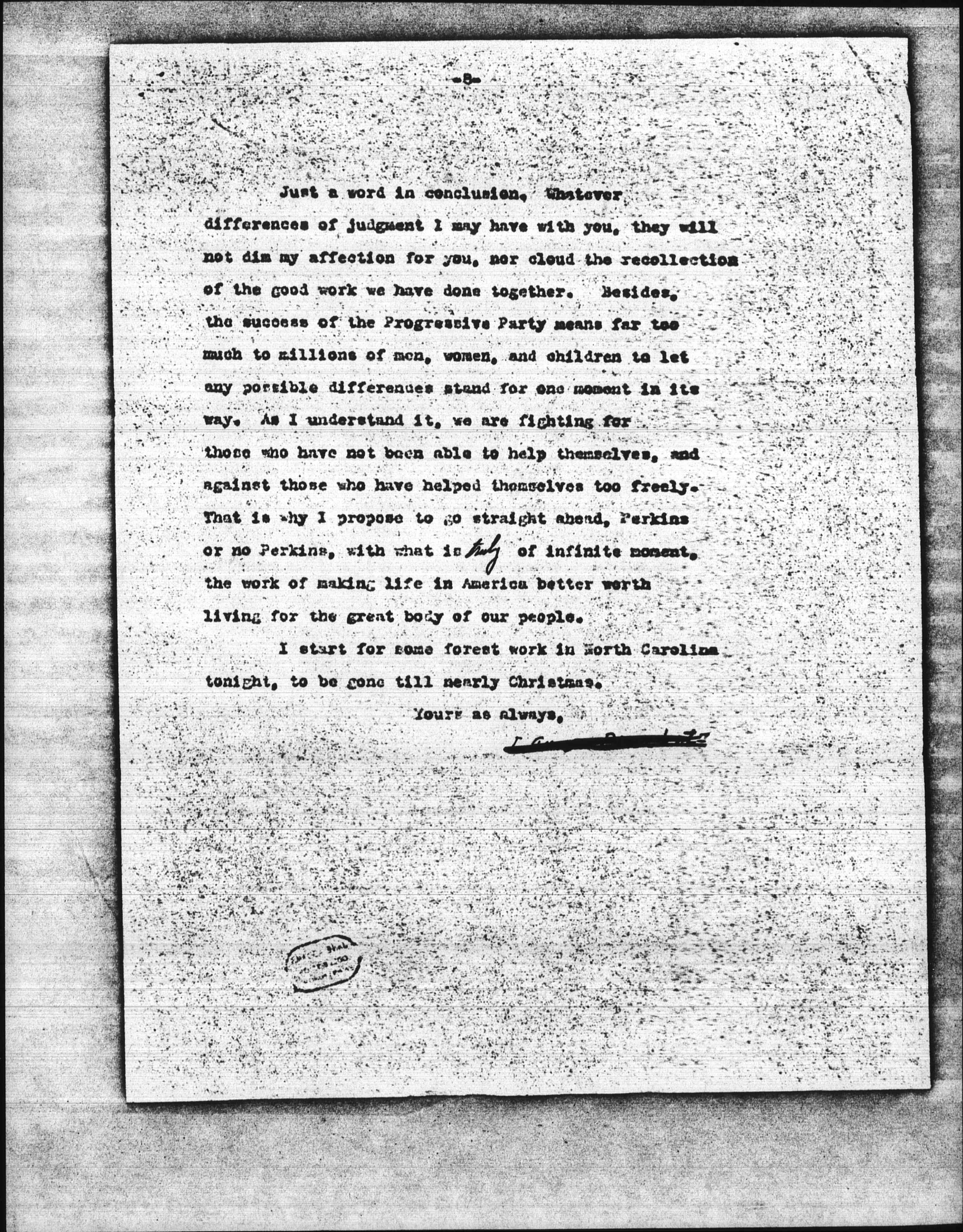 Just a word in conclusion. Whatever differences of judgement I may have with you, they will not dim my affection for you, nor cloud the recollection of the good work we have done together. Besides, the success of the Progressive Party means far too much to millions of men, women, and children to let any possible differences stand for one moment in its way. As I understand it, we are fighting for those who have not been able to help themselves, and against those who have helped themselves too freely. That is why I propsoe to go straight ahead, Perkins or no Perkins, with what is <truly> of infinite moment, the work of making life in America better worth living for the great body of our people.