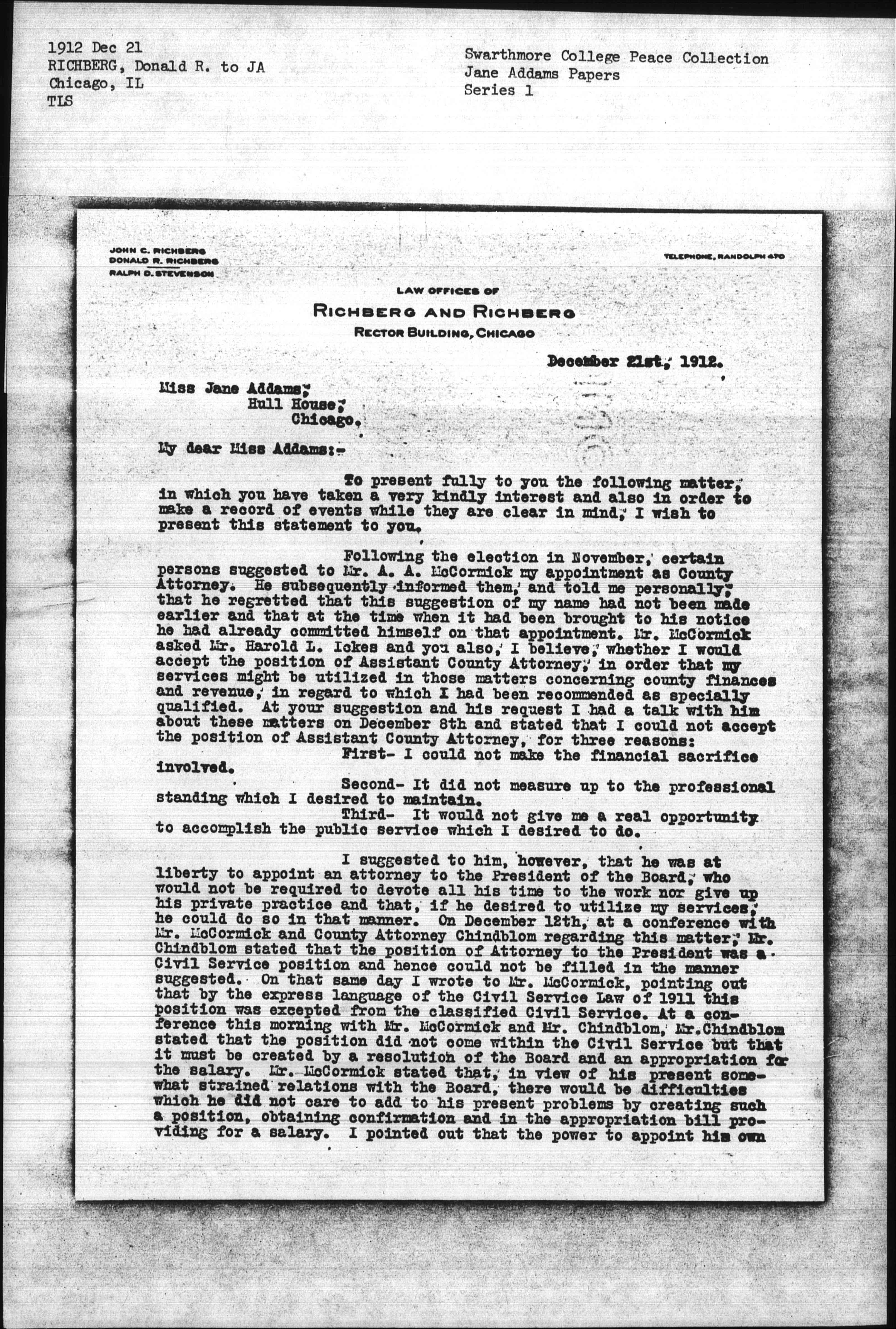 Following the election in November, certain persons suggested to Mr. A. A. McCormick my appointment as County Attorney. He subsequently informed them, and told me personally, that he regretted that this suggestion of my name had not been made earlier and that at the time when it had been bought to his notice he had already committed himself on that appointment. Mr. McCormick asked Mr. Harold L. Ickes and you also, I believe, whether I would accept the position of Assistant County Attorney, in order that my services might be utilized in those matters concerning county finances and revenue, in regard to which I had been recommended as specially qualified. At your suggestion and his request I had a talk with him about these matters December 8th and stated that I could not accept the position of Assistant County Attorney, for three reasons: