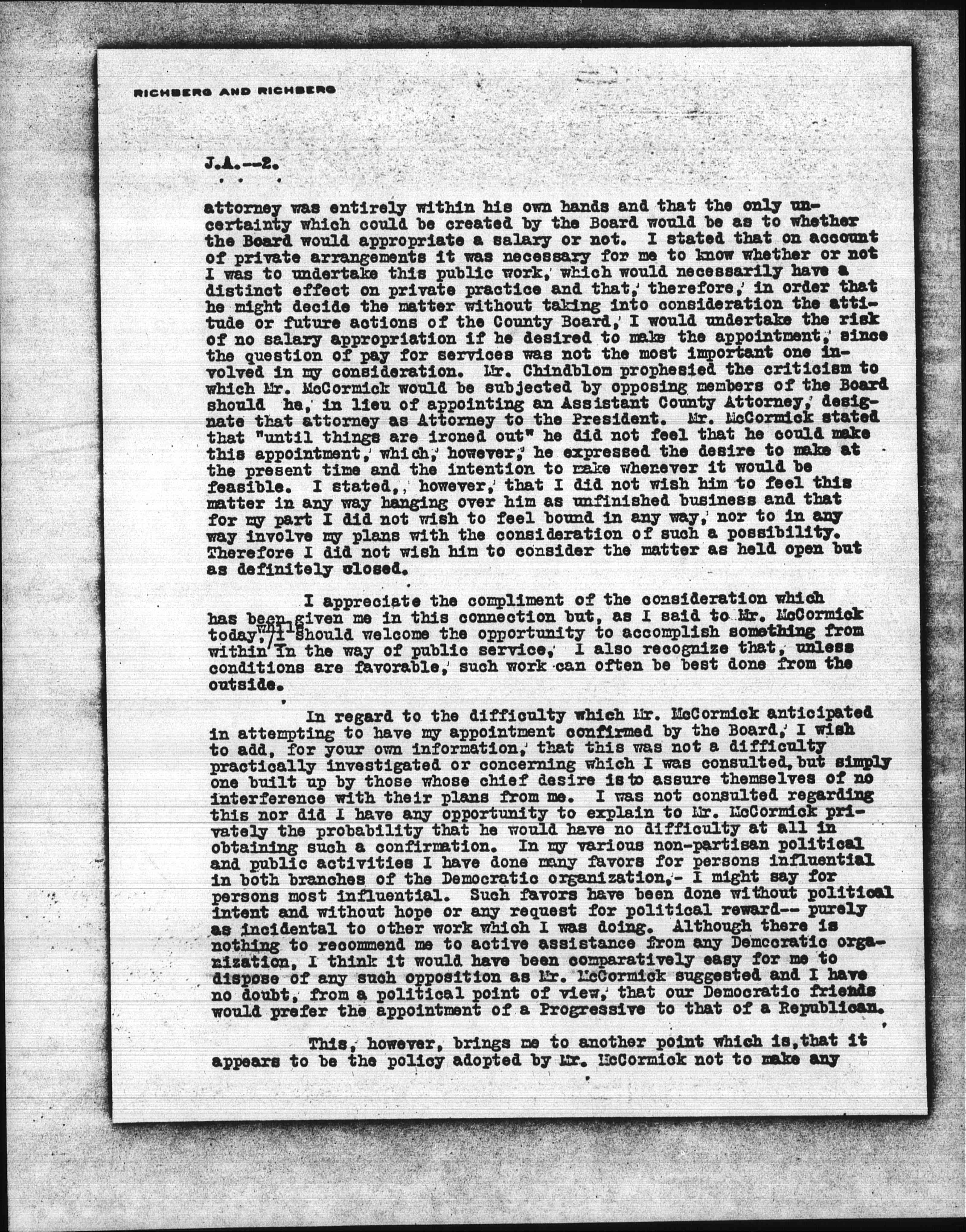I suggested to him, however, that he was at liberty to appoint an attorney to the President of the Board, who would not be required to devote all his time to the work nor give up his private practice and that, if he desired to utilize my services, he could do so in that manner. On December 12th, at a conference with Mr. McCormick and County Attorney Chindblom regarding this matter, Mr. Chindblom stated that the position of Attorney to the President was a Civil Service position amd hence could not be filled in the manner suggested. On that same day I wrote to Mr. McCormick, pointing out that by the express language of the Civil Service Law of 1911 this position was expected from the classified Civil Service. At a conference this morning with Mr. McCormick and Mr. Chindblom, Mr. Chindblom stated that the position did not come within the Civil Service but that it must be created by a resolution of the Board and an appropriation for the salary. Mr. McCormick stated that, in view of his present somewhat strained relations with the Board, there would be difficulties which he did not care to add to his present problems by creating such a position, obtaining confirmation and in the appropriation bill providing for a salary. I pointed out that the power to appoint his own [page 2] attorney was entirely within his own hands and that the only uncertainty which could be created by the Board would be as to whether the Board would appropriate a salary or not. I stated that on account of private arrangements it was necessary for me to know whether or not I was to undertake this public work, which would necessarily have a distinct effect on private practice and that, therefore, in order that he might decide the matter without taking into consideration the attitude or future actions of the County Board, I would undertake the risk of no salary appropriation if he desired to make the appointment, since the question of pay for services was not the most important one involved in my consideration. Mr. Chindblom prophesied the criticism to which Mr. McCormick would be subjected by opposing members of the Board should he, in lieu of appointing an Assistant County Attorney, designate that attorney as Attorney to the President, Mr. McCormick stated that "until things are ironed out" he did not feel that he could make this appointment, which, however, he expressed the desire to make at the present time and the intention to make whenever it would be feasible. I stated, however, that I did not wish him to feel this matter in any way hanging over him as unfinished business and that for my part, I did not wish to feel bound in any way, nor to in any way involve my plans with the consideration of such a possibility. Therefore I did not wish him to consider the matter as held open but as definitely closed.