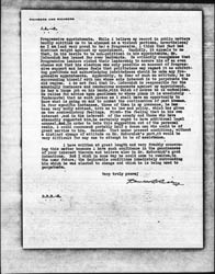 In regard to the difficulty which Mr. McCormick anticipated in attempting to have my appointment confirmed by the Board, I wish to add, for your own information, that this was not a difficulty practically investigated or concerning which I was consulted, but simply one built up by those whose chief desire is to assure themselves of no interference with their plans from me. I was not consulted regarding this nor did I have any opportunity to explain to Mr. McCormick privately the probability that he would have no difficulty at all in obtaining such a confirmation. In my various non-partisan political and public activities I have done many favors for persons influential in both branches of the Democratic organization, -- I might say for persons most influential. Such favors have been done without political intent and without hope or any request for political reward -- purely as incidental to other work whic I was doing. Although there is nothing to recommend me to active assistance from any Democratic organization, I think it would have been comparatively easy for me to dispose of any such opposition as Mr. McCormick suggested and I have no doubt, from a political point of view, that our Democratic friends would prefer the appointment of a Progressive to that of a Republican.