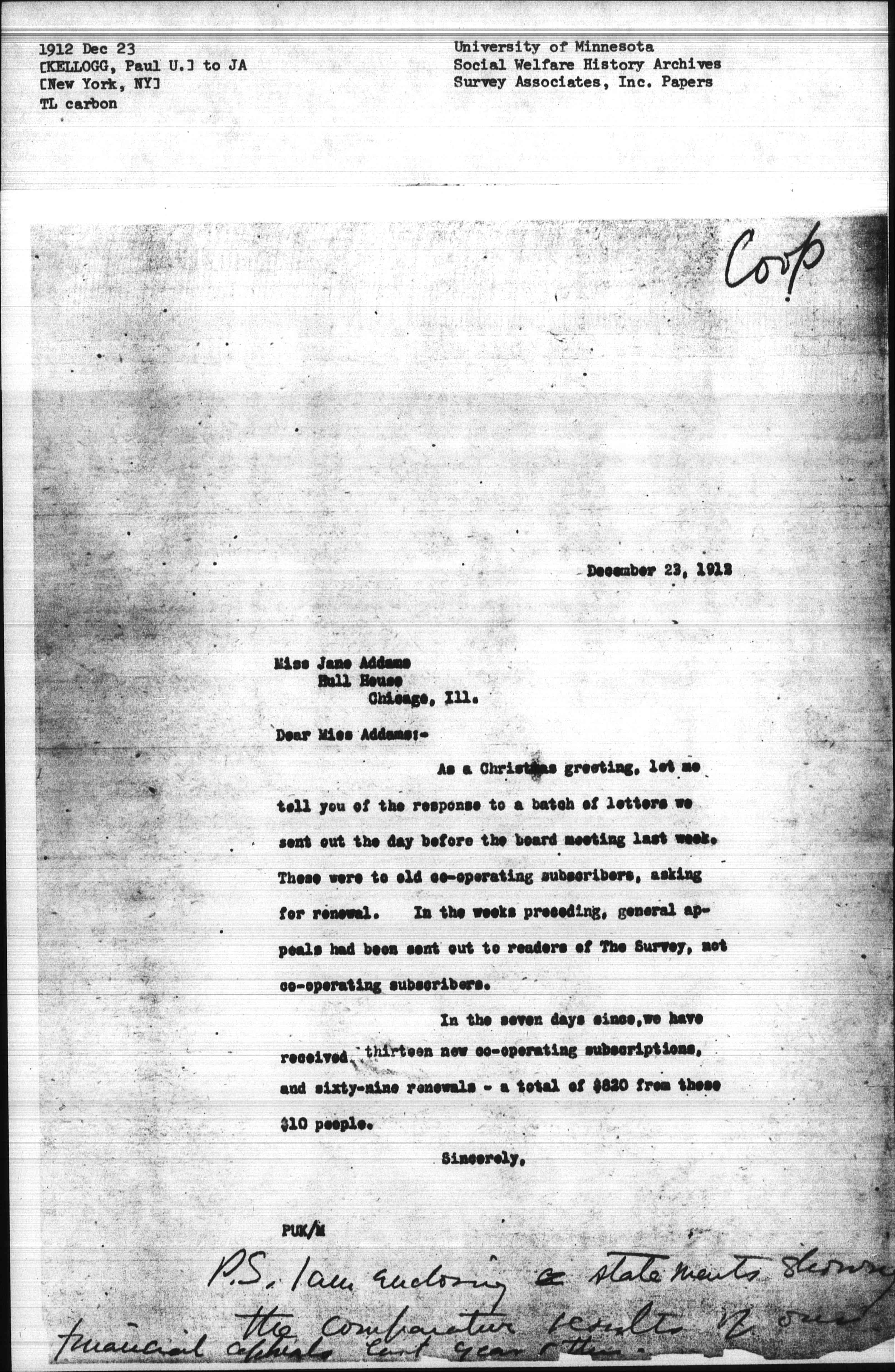 As a Christmas greeting, let me tell you of the response to a batch of letters we sent out the day before the board meeting last week. These were to old [cooperating] subscribers, asking for renewal. In the weeks preceding, general appeals had been sent out to readers of The Survey, not [cooperating] subscribers.