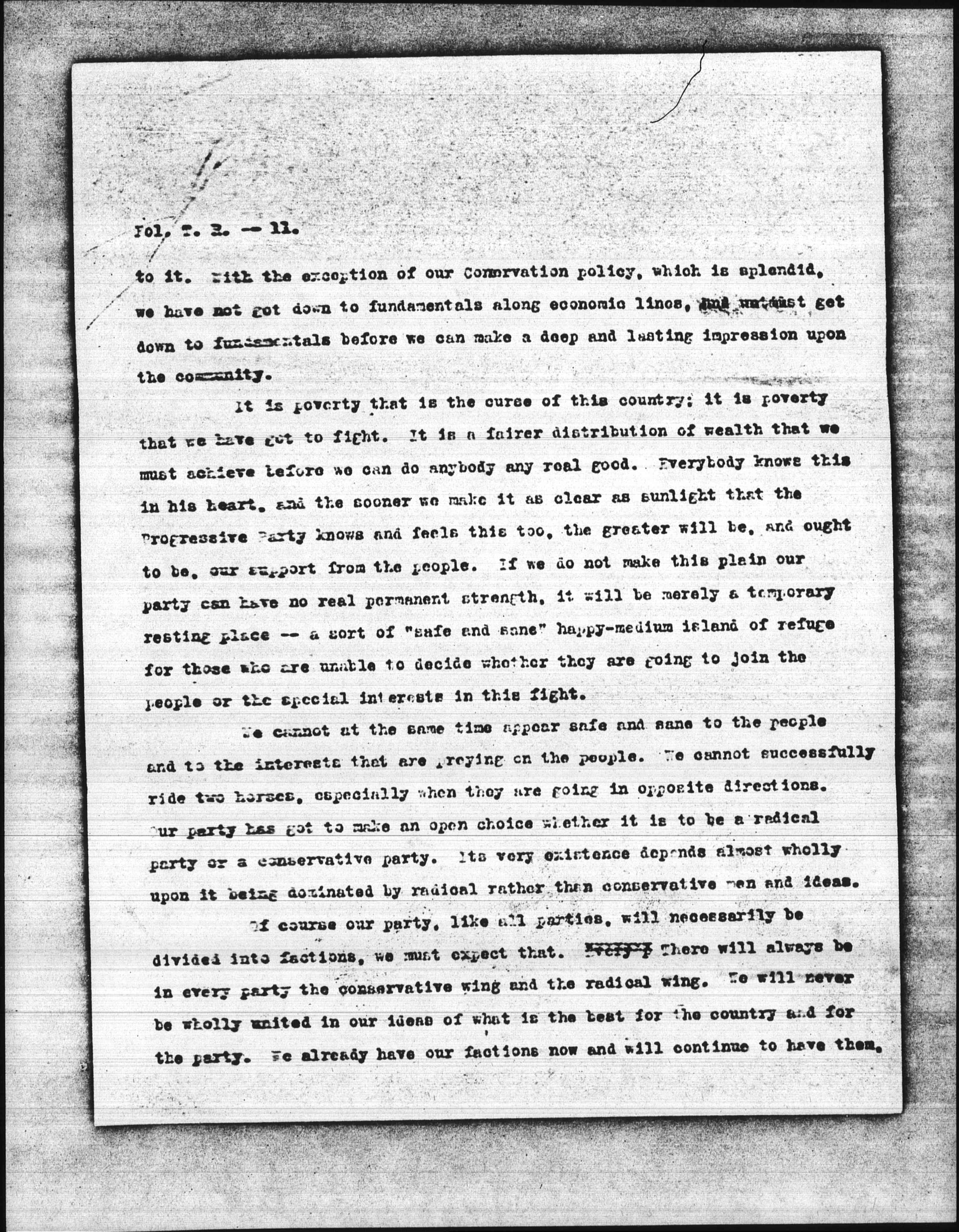 We have a splendid program of popular government. Our program of industrial justice is accepted on every hand. There is no issue in regard [page 11] to it, with the exception of our Conservation policy, which is splendid, we have not got down to fundamentals along economic lines, and [we must] get down to fundamentals before we can make a deep and lasting impression upon the community.