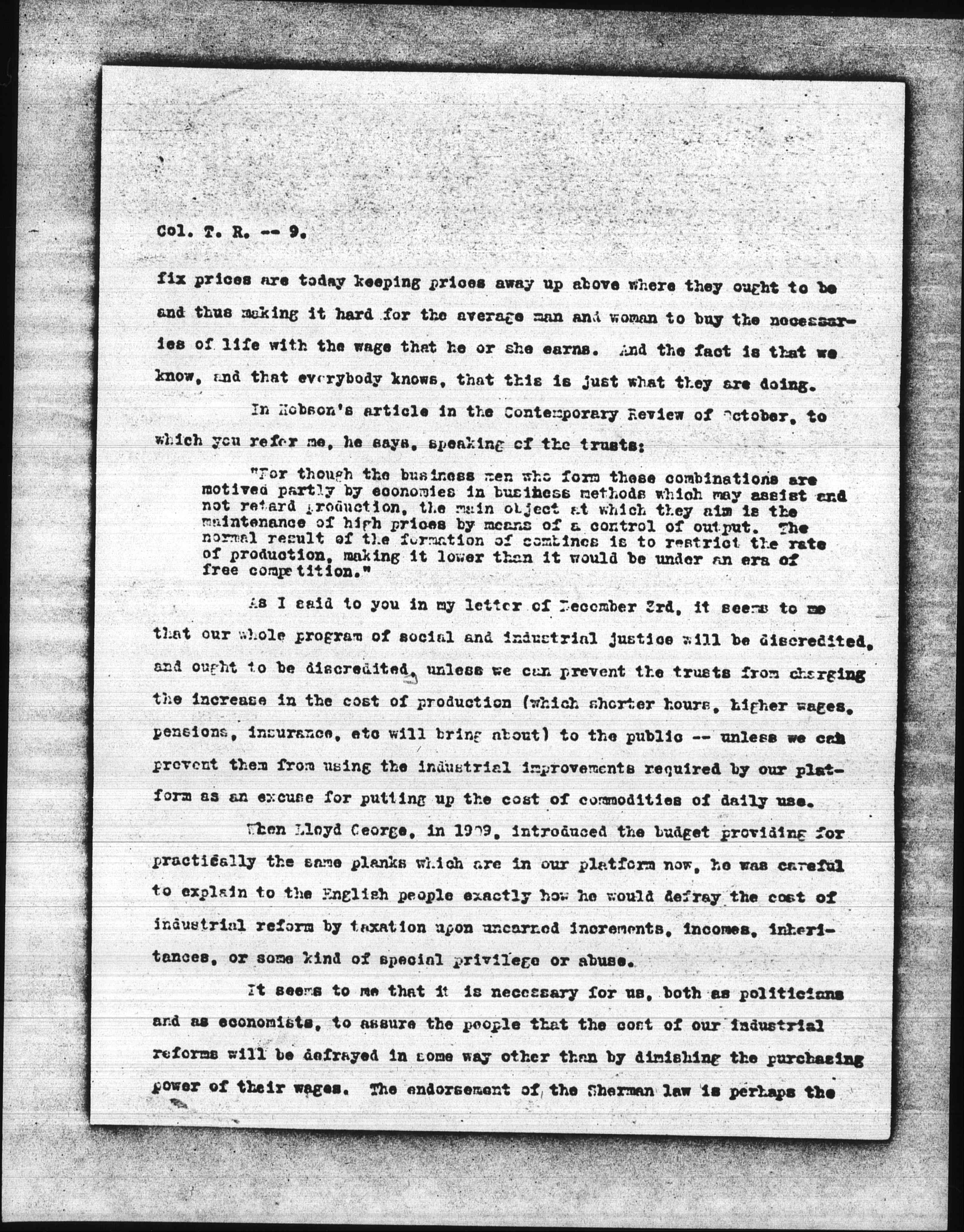 As I said to you in my letter of December 3rd, it seems to me that our whole program of social and industrial justice will be discredited, and ought to be discredited, unless we can prevent the trusts from charging the increase in the cost of production (which shorter hours, higher wages, pensions, insurance, etc. will bring about) to the public -- unless we can prevent them from using the industrial improvements required by our platform as an excuse for putting up the cost of commodities of daily use.