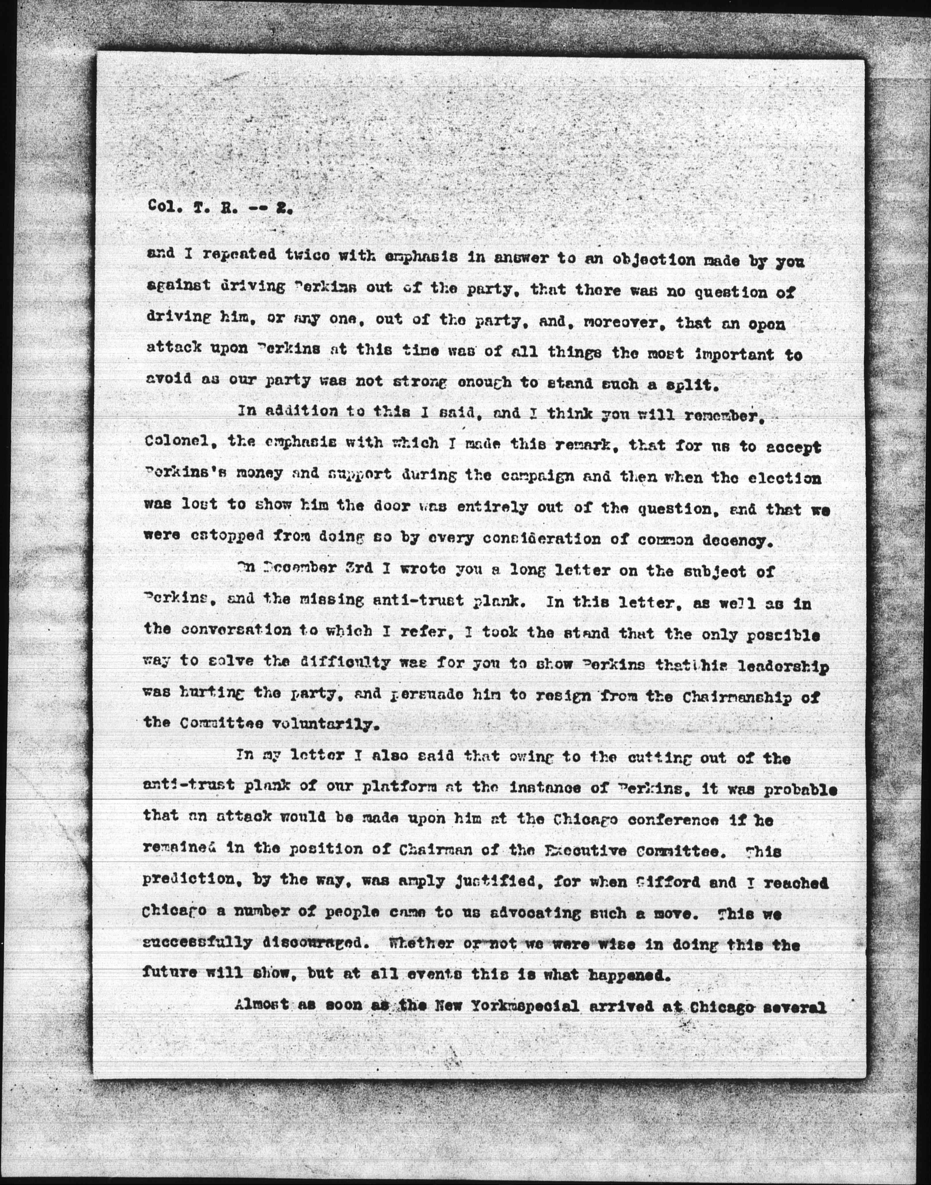 On December 3rd I wrote you a long letter on the subject of Perkins, and the missing anti-trust plank. In this letter, as well as in the conversation to which I refer, I took the stand that the only possible way to solve the difficulty was for you to show Perkins that his leadership was hurting the party, and persuade him to resign from the Chairmanship of the Committee voluntarily.
