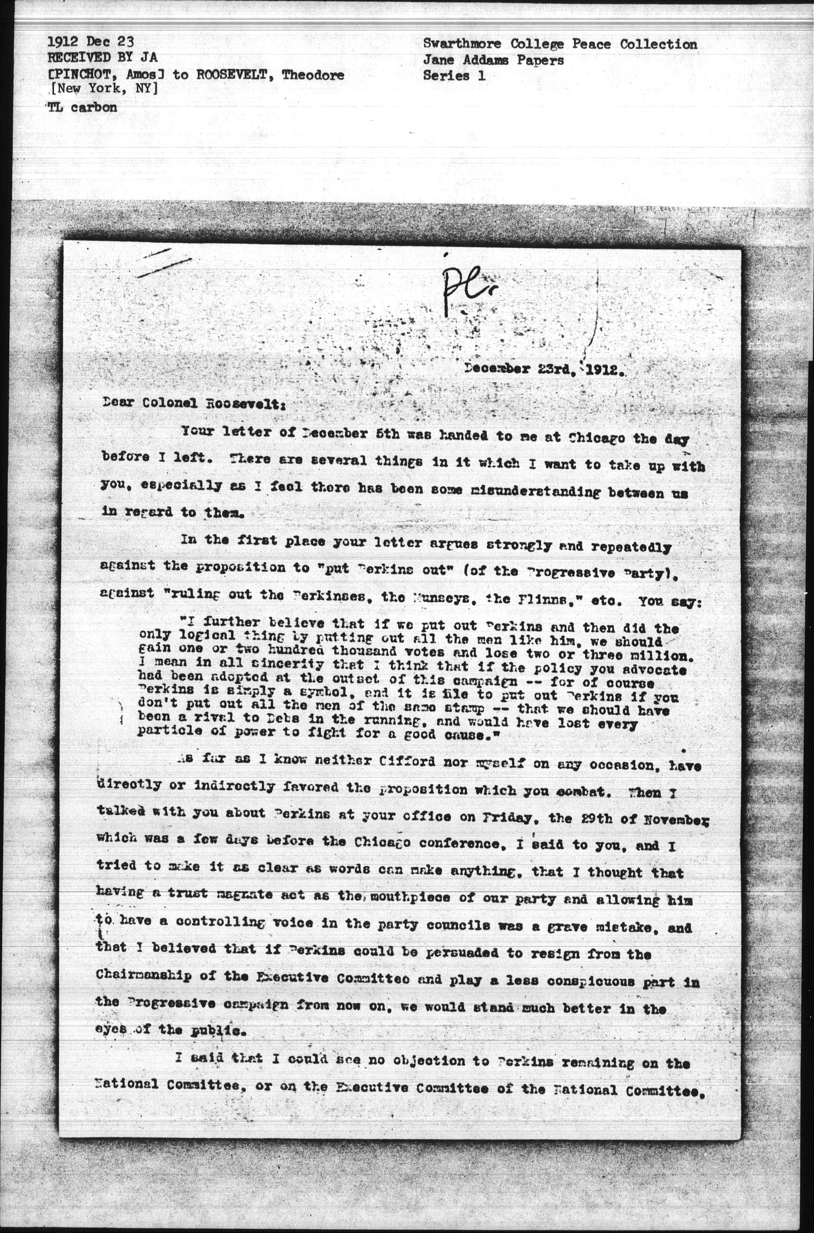 As far as I know neither Gifford not myself on any occasion, have directly or indirectly favored the proposition which you combat. When I talked with you about Perkins at your office on Friday, the 29th of November which was a few days before the Chicago conference, I said to you, and I tried to make it as clear as words can make anything, sthat I thought that having a trust magnate act as the mouthpiece of our party and allowing him to have a controlling voice in the party councils was a grave mistake, and that I believed that if Perkins could be persuaded to resign from the chairmanship of the Executive Committee and play a less conspicuous part in the Progressive campaign from now on, we would stand much better in the eyes of the public.