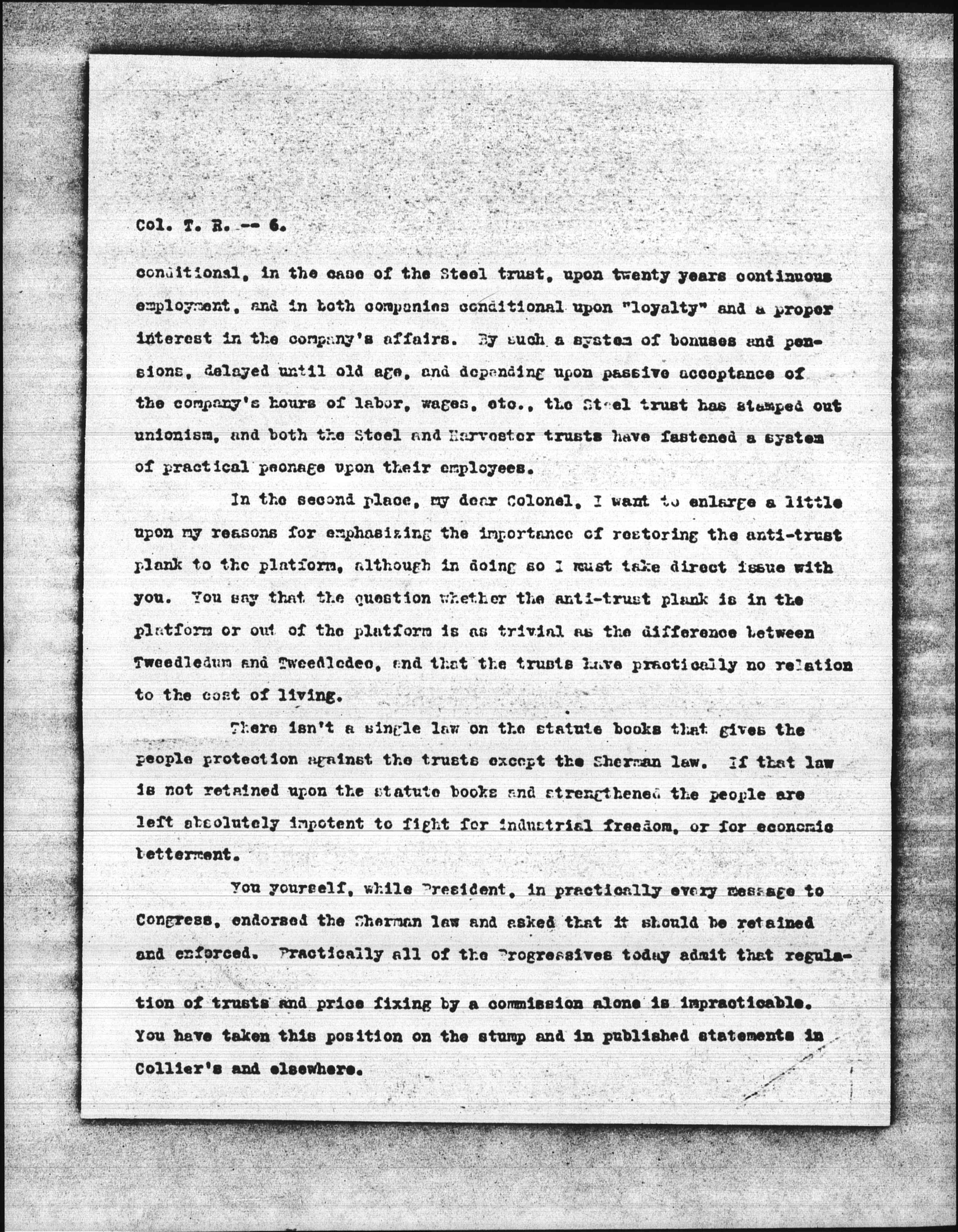 You yourself, while President, in practically every message to Congress, endorsed the Sherman law and asked that it should be retained and enforced. Practically all of the Progressive today admit that regulation of trusts and price fixing by a commission alone is impracticable. You have taken this position on the strump and in published statements in Collier's and elsewhere. [page 7]