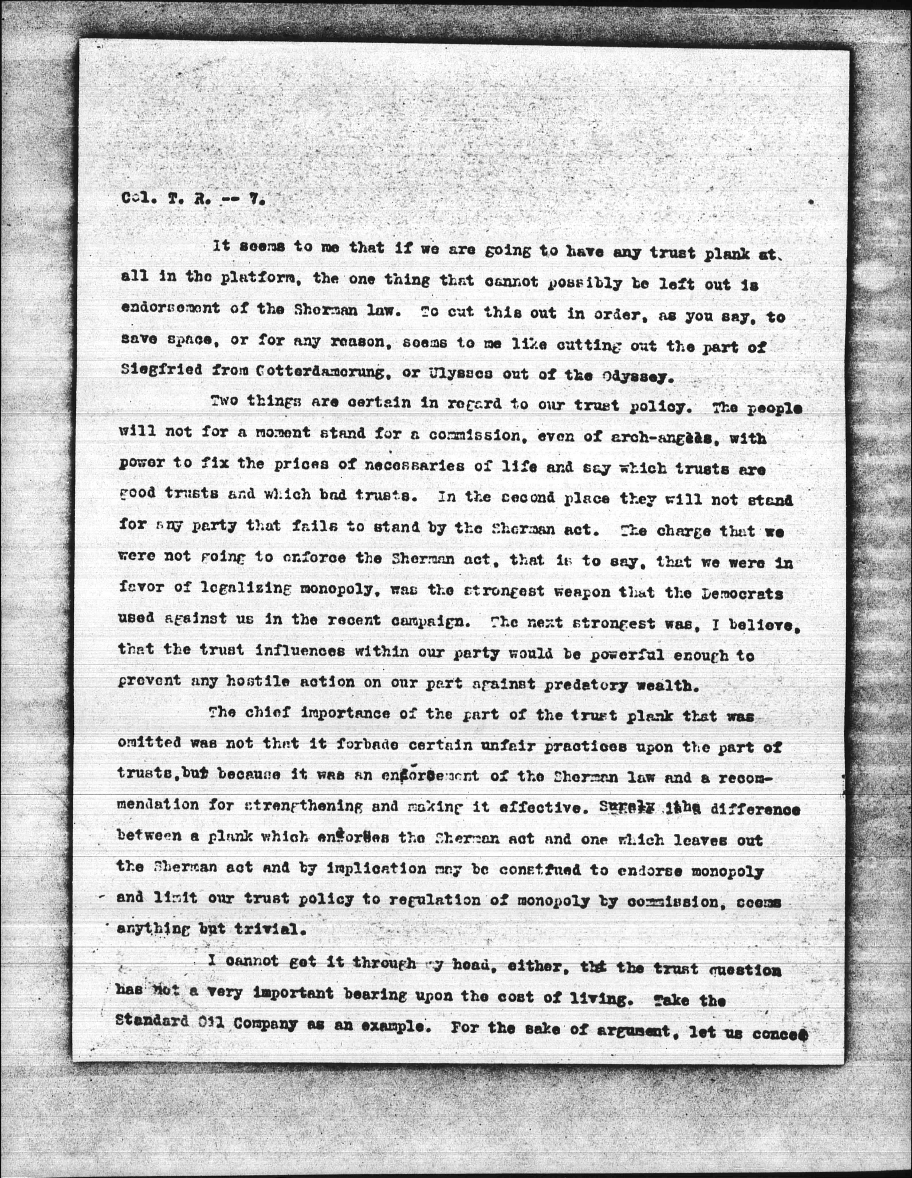 It seems to me that if we are going to have any trust plank at all in the platform, one thing that cannot possibly be left out is endorsement of the Sherman law. To cut this out in order, as you say, to save space, or for any reason, seems to me like cutting out the part of Siegfried for Gotterdamorung, or Ulysses out of the Odyssey.