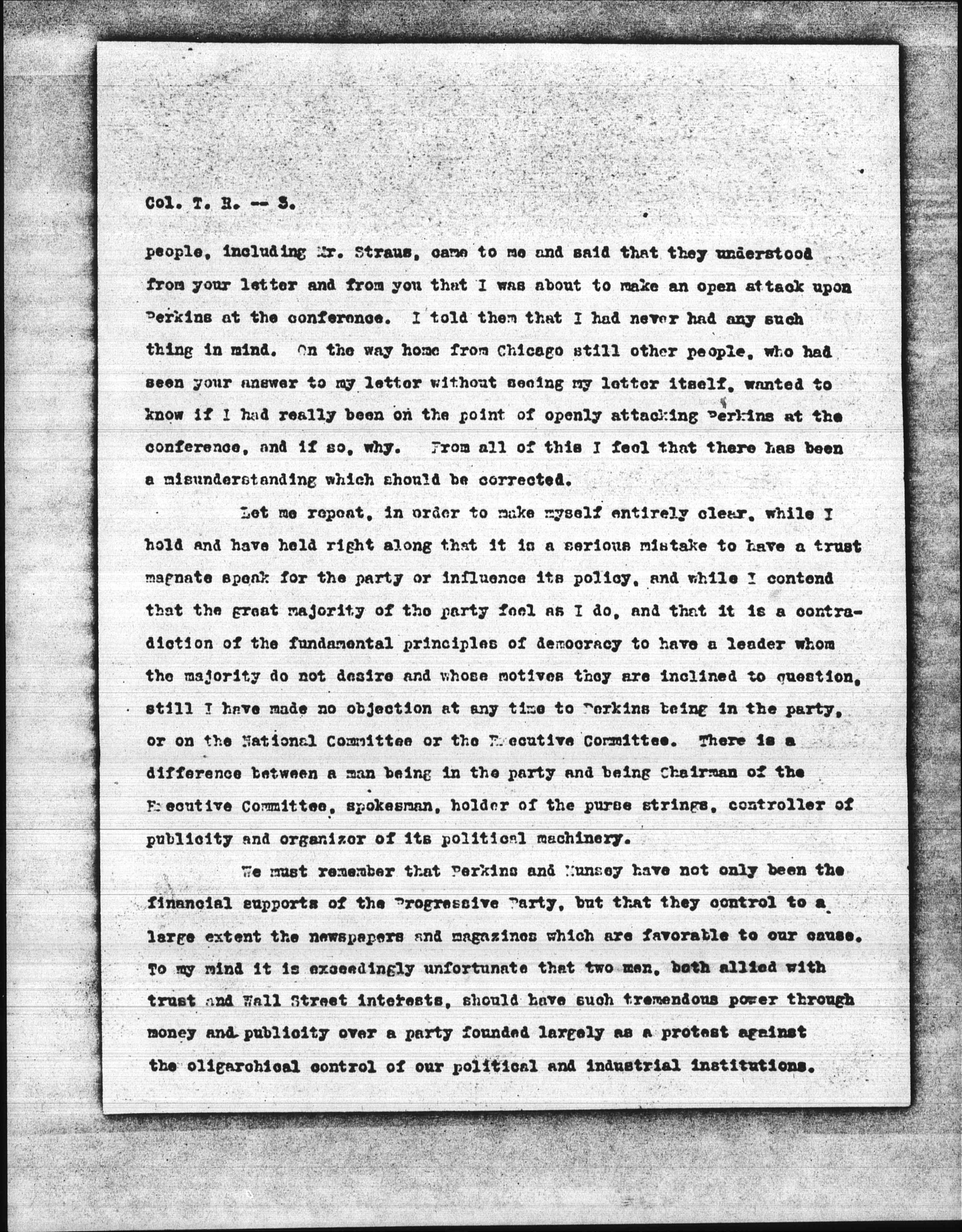 We must remember that Perkins and Munsey have not only been the financial supports of the Progressive Party, but that they control to a large extend the newspapers and magazines which are favorable to our cause. To my mind it is exceedingly unfortunate that two men, both allied with trust and Wall Street interests, should have such tremendous power through money and publicity over a party founded largely as a protest against the oligarchial control of our political and industrial institutions. [page 4]