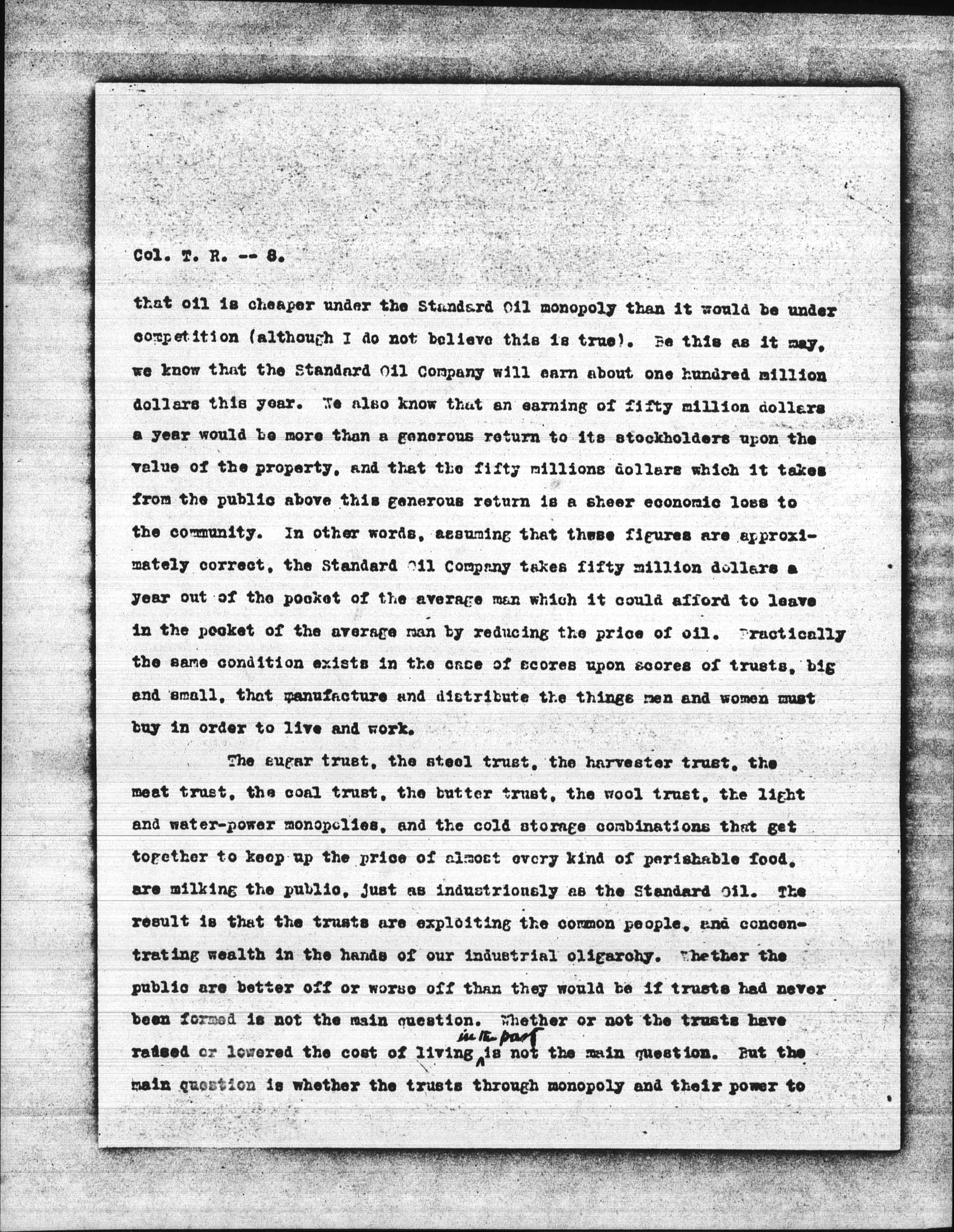 I cannot get it through my head, either, that the trust question has not a very important bearing upon the cost of living. Take the Standard Oil Company as an example. For the sake of argument, let us [concede] [page 8] that oil is cheaper under the Standard Oil monopoly than it would be under competition (although I do not believe this is true). Be this as it may, we know that the Standard Oil Company will earn about one hundred million dollars this year. We also know that an earning of fifty million dollars a year would be more than a generous return to its stockholders upon the value of the property, and that the fifty millions dollars which it takes from the public above this generous return is a sheer economic loss to the community. In other words, assuming that these figures are approximately correct, the Standard Oil Company takes fifty million dollars a year out of the pocket of the average man which it could afford to leave in the pocket of the average man by reducing the price of oil. Practically the same condition exists in the case of scores upon scores of trusts, big and small, that manufacture and distribute the things men and women must buy in order to live and work.