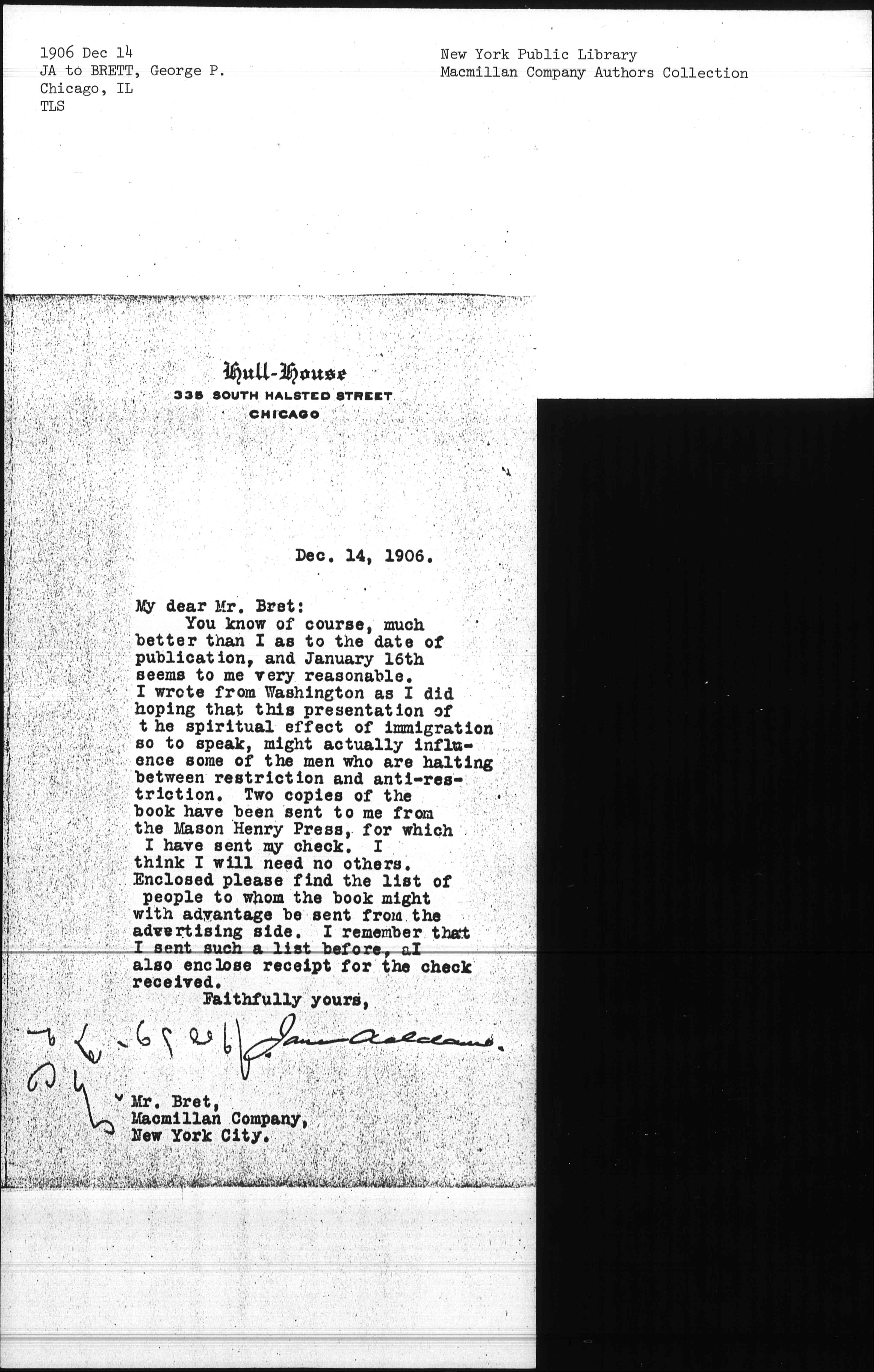 You know of course, much better than I as to the date of publication, and January 16th seems to me very reasonable. I wrote from Washington as I did hoping that this presentation of the spiritual effect of immigration so to speak, might actually influence some of the men who are halting between restriction and anti-restriction. Two copies of the book have been sent to me from the Mason Henry Press, for which I have sent my check. I think I will need no others. Enclosed please find the list of people whom the book might with advantage be sent from the advertising side. I remember that I sent such a list before, I also enclose receipt for the check received.