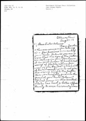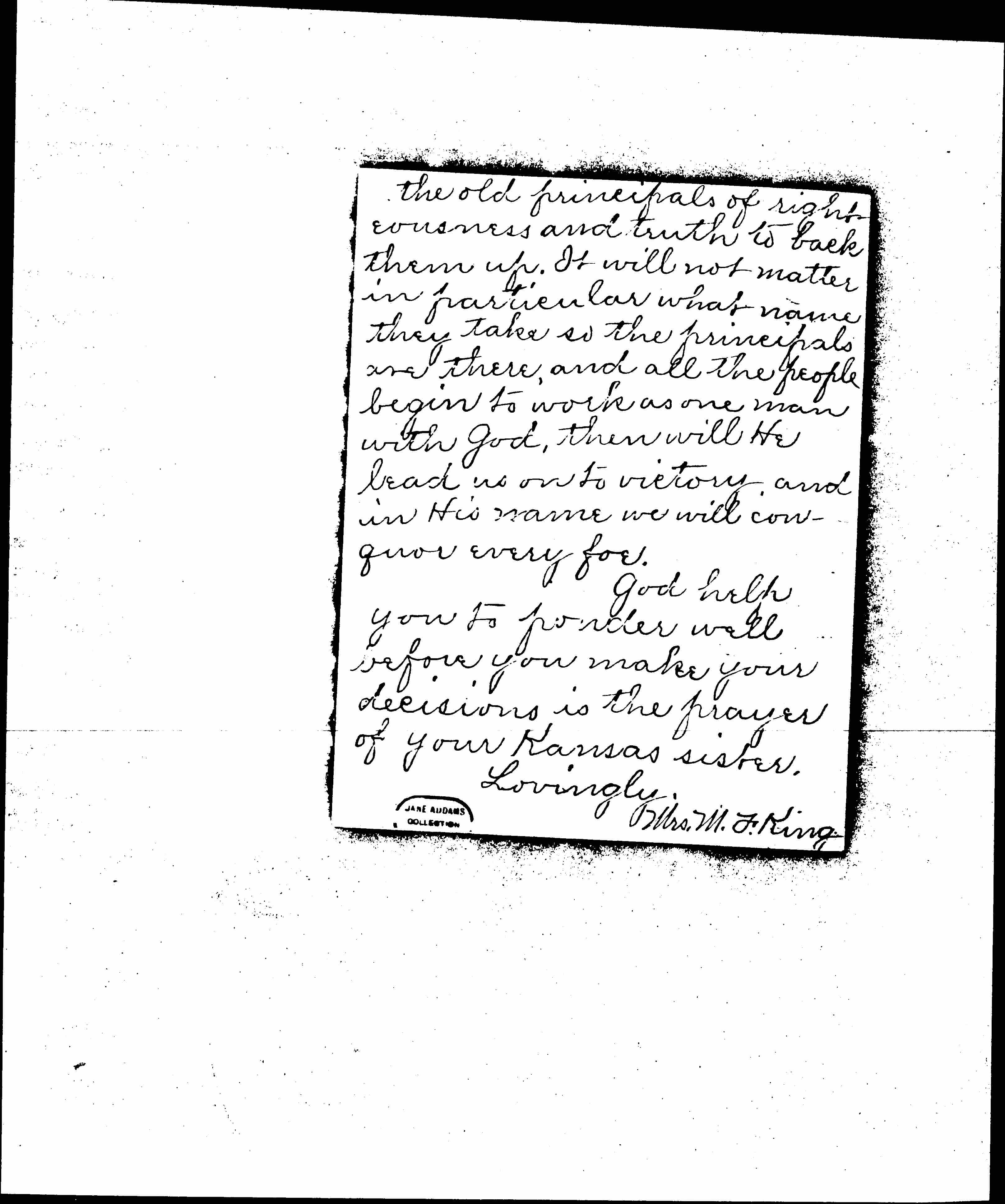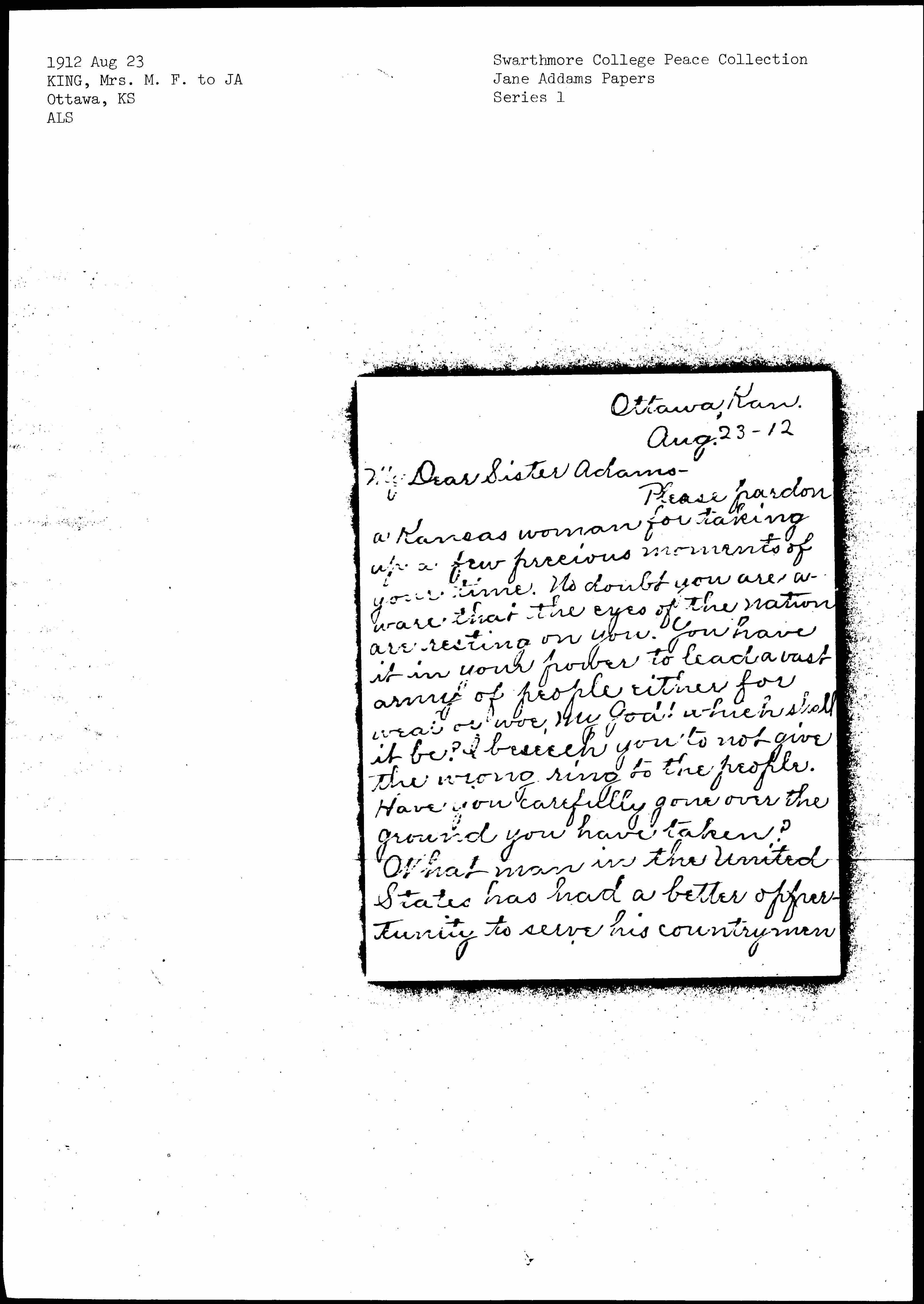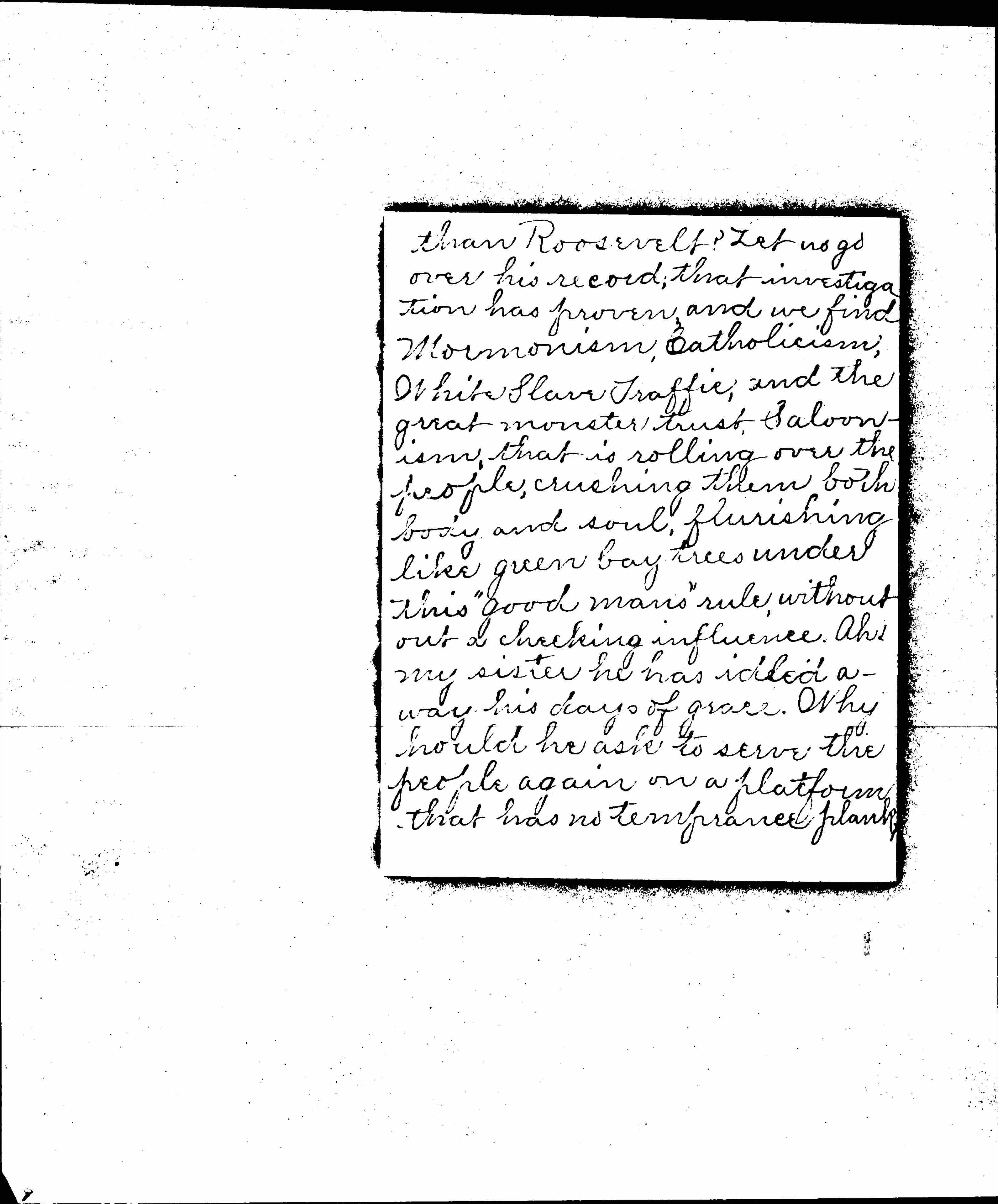 Please pardon a Kansas woman for taking up a few precious moments of your time. No doubt you are aware that the eyes of the nation are resting on you. You have it in your power to lead a vast army of people either for [weal] or woe, my God! which shall it be? I beseech you to not give the wrong ring to the people. Have you carefully gone over the ground you have taken? What man in the United States has had a better opportunity to serve his countrymen [page 2] than Roosevelt? Let us go over his record; that investigation has proven, and we find Mormonism, Catholicism, White Slave Traffic, and the great monster trust, Saloonism, that is rolling over the people, crushing them both body and soul, flushing like green bay trees under this "good mans" rule, without a checking influence. Ah, my sister he has idled away his days of grace. Why should he ask to serve the people again on a platform that has no temperance plank? [page 3] Is he a moral coward? His men say it has dynamite in it, and they do not care to handle it. The [Prohibitionists] who are the salt of the earth, are not afraid to handle it thank God! Every progressive measure in the other parties have been advocated by them for forty years without any changes.
