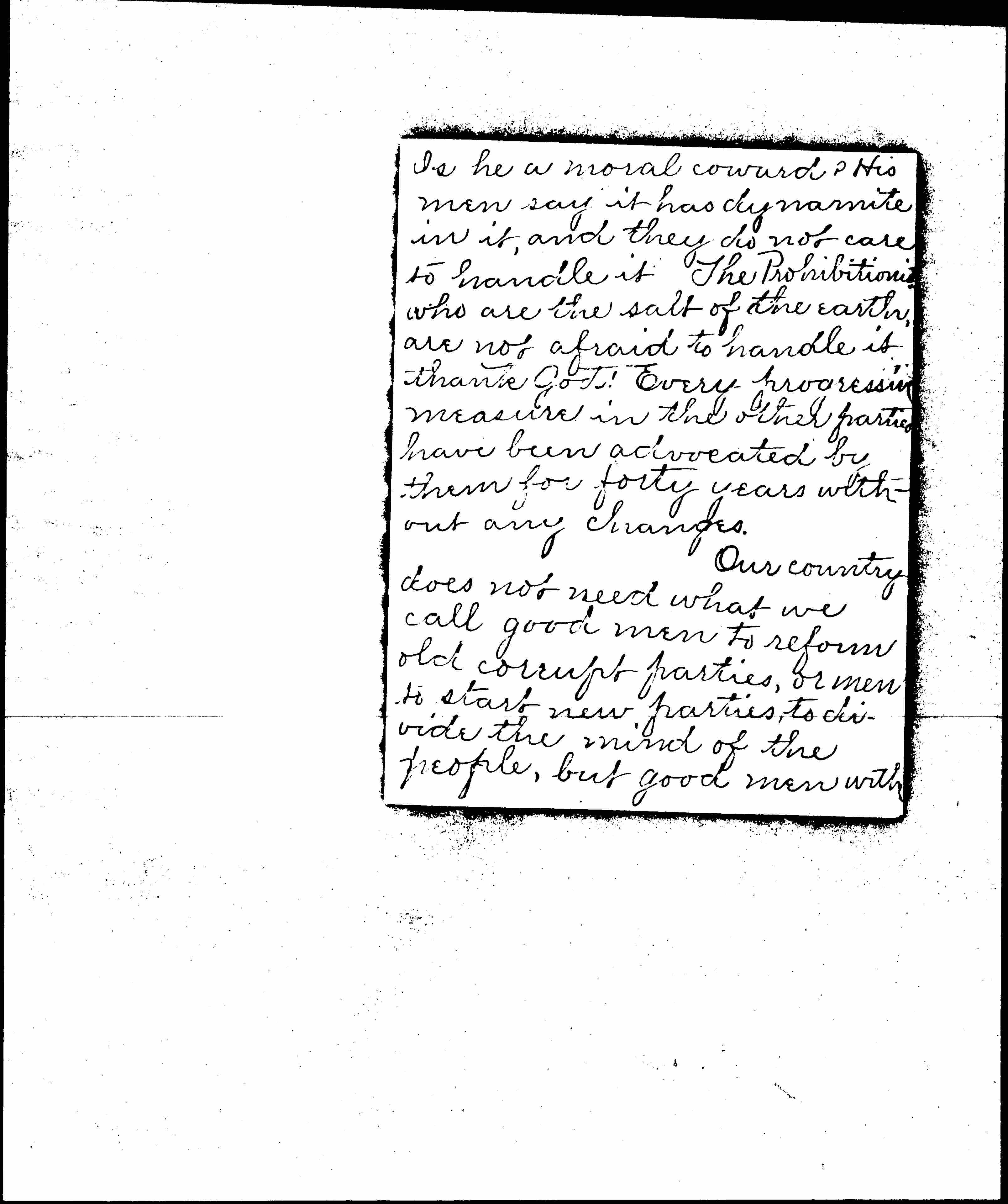 Our country does not need what we call good men to reform old corrupt parties, or men to start new parties, to divide the mind of the people, but good men with [page 4] the old [principles] of righteousness and truth to back them up. It will not matter in particular what name they take so the [principles] are there, and all the people begin to work as one man with God, then will He lead us on to victory, and in His name we will [conquer] every foe.