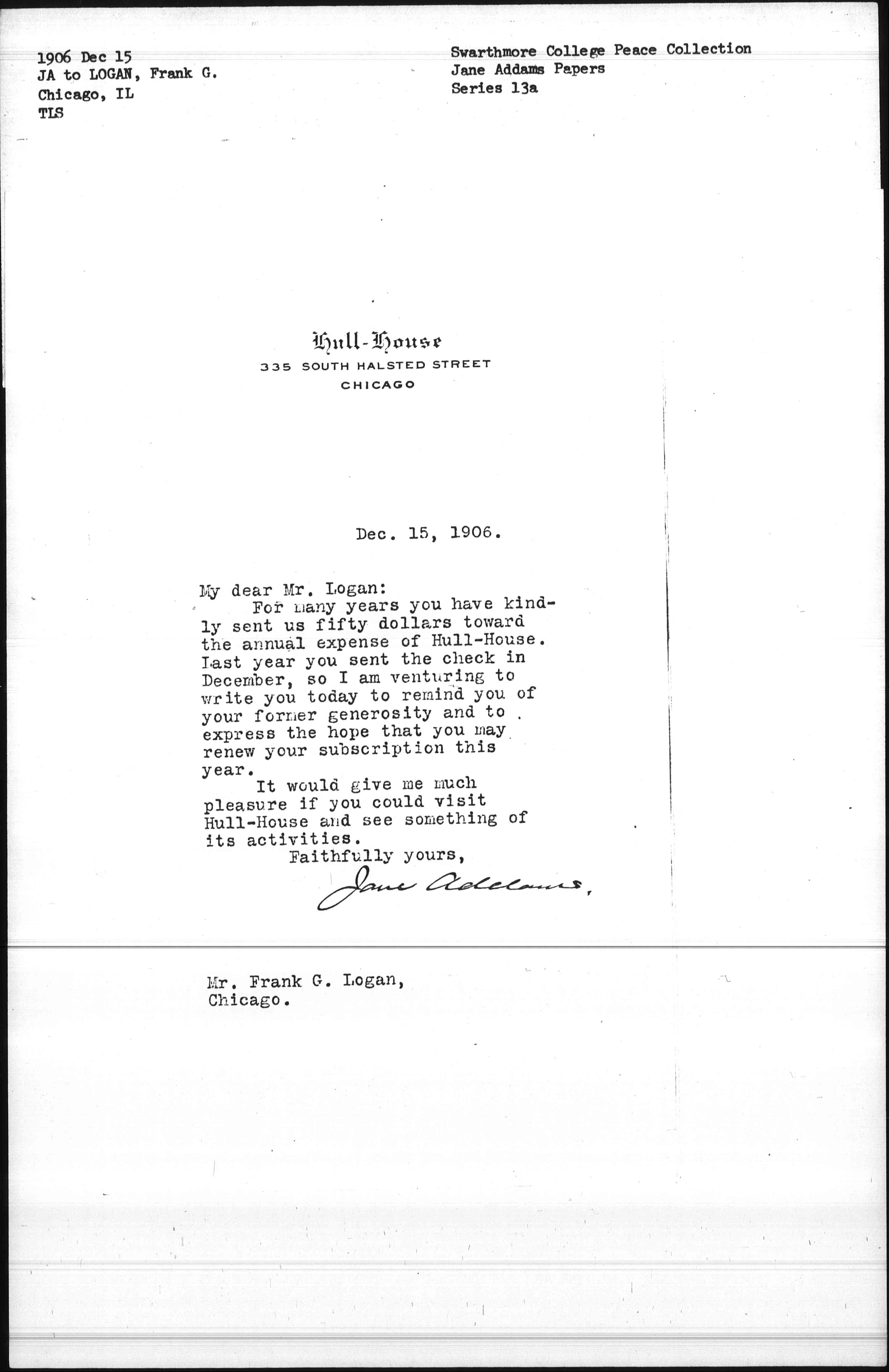 For many years you have kindly sent us fifty dollars toward the annual expense of Hull-House. Last year you sent the check in December, so I am venturing to write you today to remind you of your former generosity and to express the hope that you may renew your subscription this year.