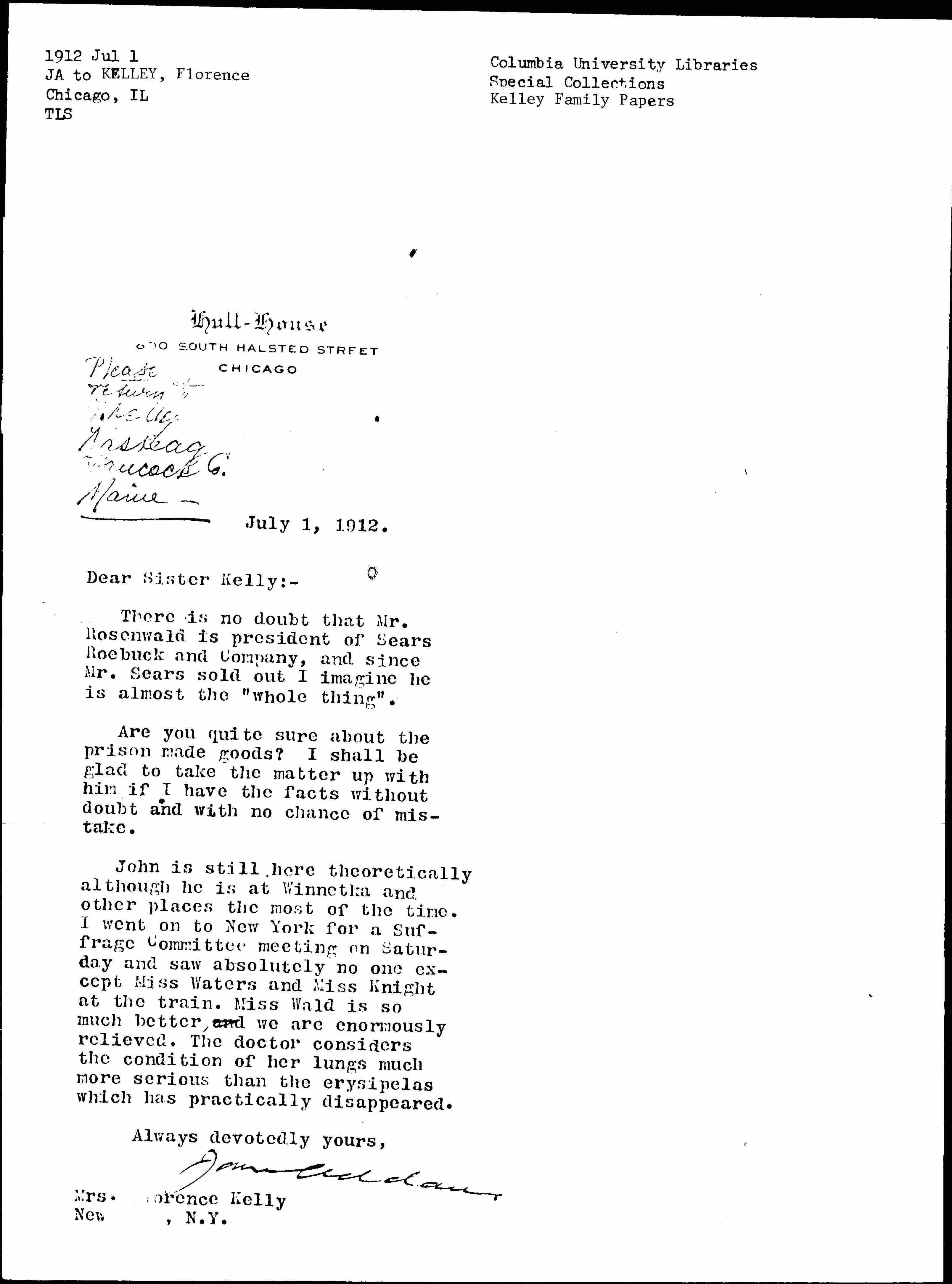 John is still here theoretically although he is at Winnetka and other places the most of the time. I went on to New York for a Suffrage Committee meeting on Saturday and saw absolutely no one except Miss Waters and Miss Knight at the train. Miss Wald is so much better<,> and we are enormously relieved. The doctor considers the condition of her lungs much more serious than the erysipelas which has practically disappeared.