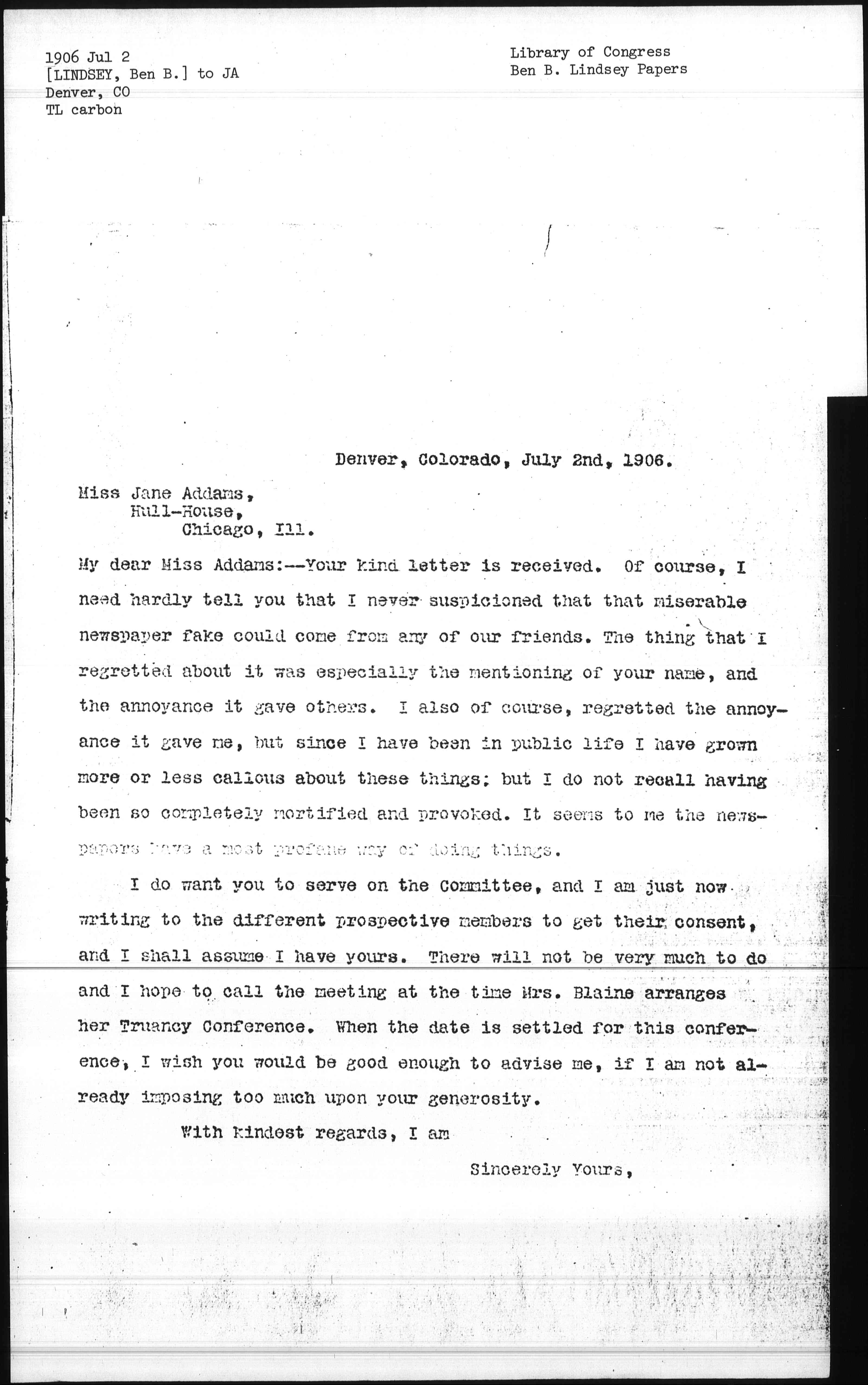 My dear Miss Addams:-- Your kind letter is received. Of course, I need hardly tell you that I never suspicioned that that miserable newspaper fake could come from any of our friends. The thing that I regretted about it was especially the mentioning of your name, and the annoyance it gave others. I also of course, regretted the annoyance it gave me, but since I have been in public life I have grown more or less callous about these things; but I do not recall having been so completely mortified and provoked. It seems to me the newspapers have a most profane way of doing things.