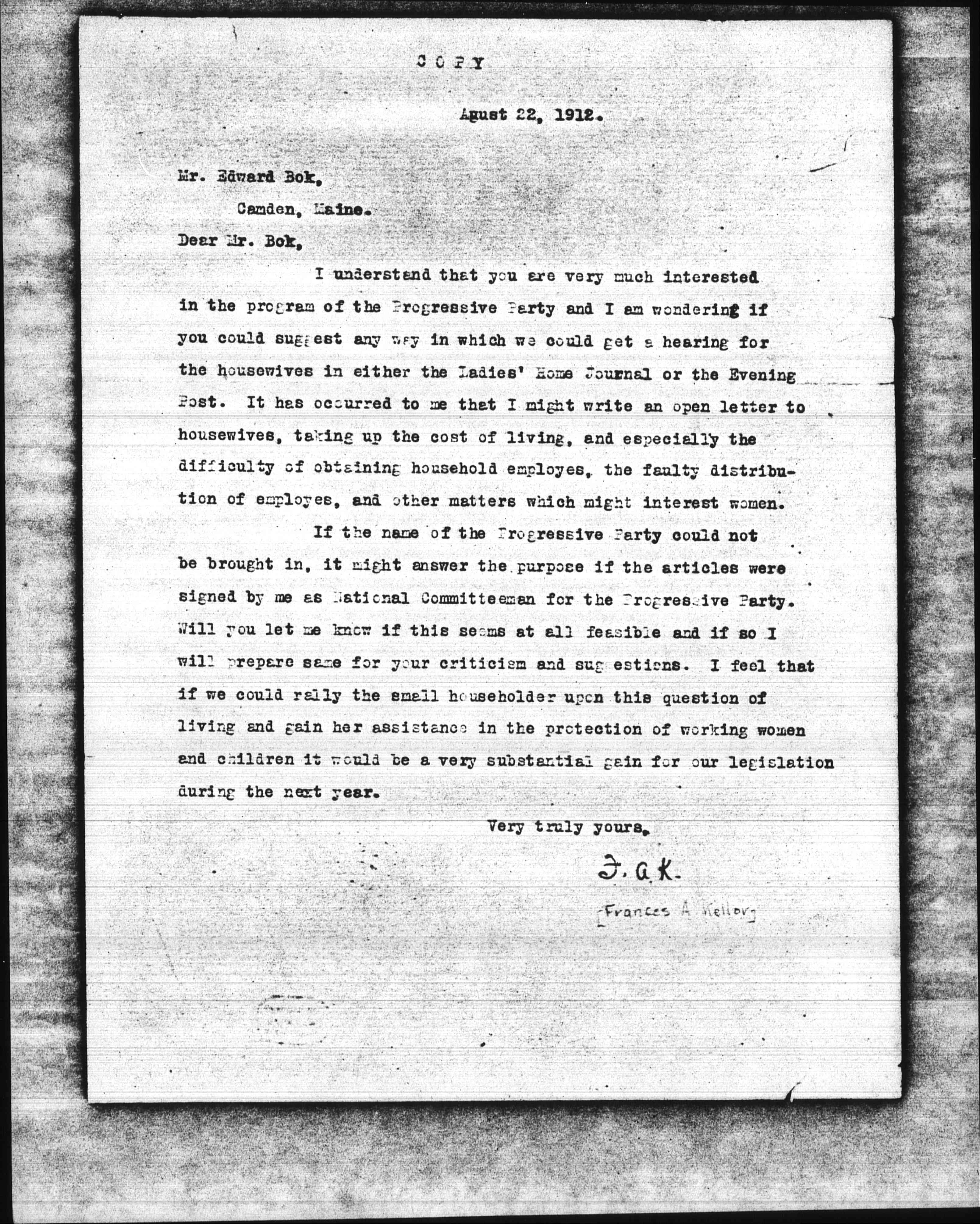 If the name of the Progressive Party could not be brought in, it might answer the purpose if the articles were signed by me as National Committeeman for the Progressive Party. Will you let me know if this seems at all feasible and if so I will prepare same for your criticism and suggestions. I feel that if we could rally the small householder upon this question of living and gain her assistance in the protection of working women and children it would be a very substantial gain for our legislation during the next year.